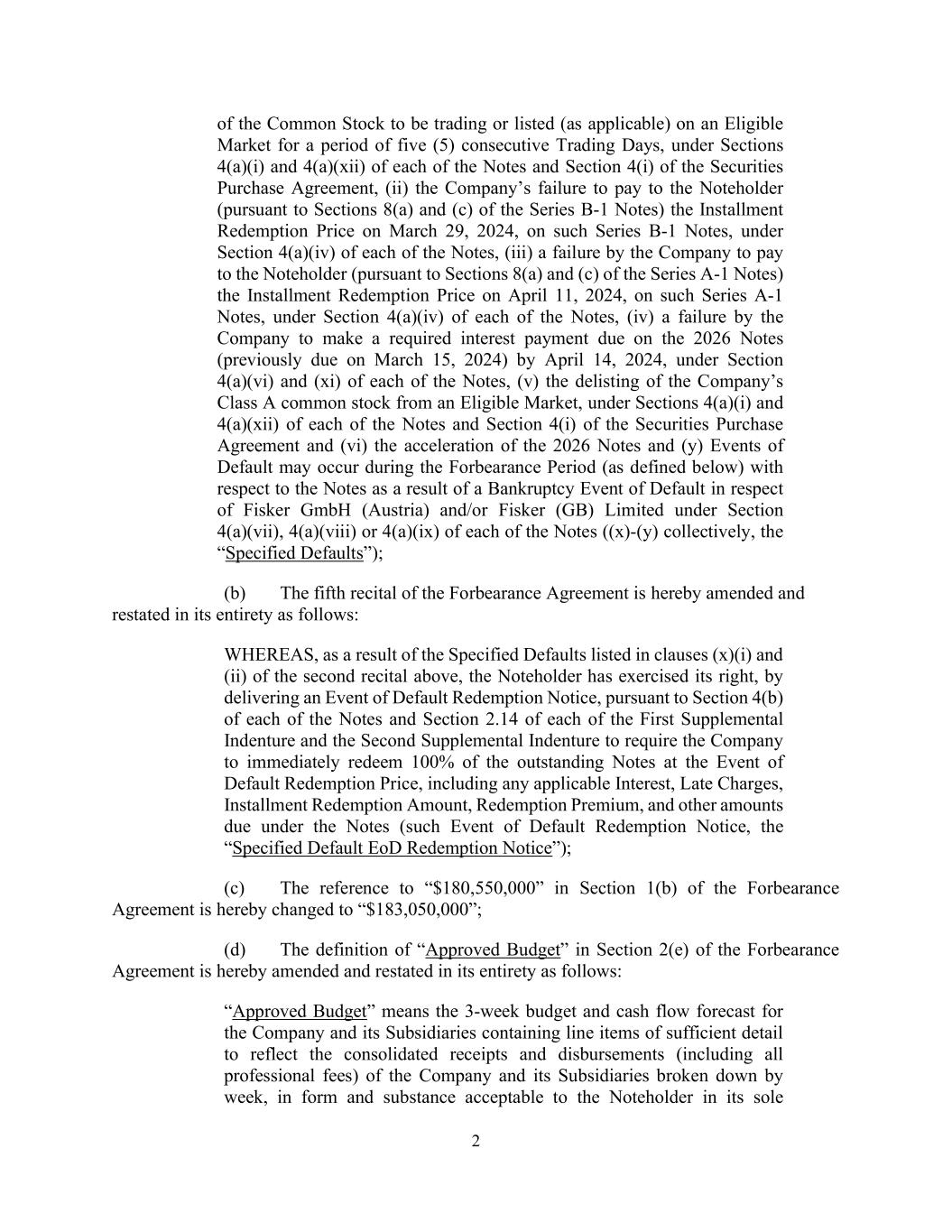 2 of the Common Stock to be trading or listed (as applicable) on an Eligible Market for a period of five (5) consecutive Trading Days, under Sections 4(a)(i) and 4(a)(xii) of each of the Notes and Section 4(i) of the Securities Purchase Agreement, (ii) the Company’s failure to pay to the Noteholder (pursuant to Sections 8(a) and (c) of the Series B-1 Notes) the Installment Redemption Price on March 29, 2024, on such Series B-1 Notes, under Section 4(a)(iv) of each of the Notes, (iii) a failure by the Company to pay to the Noteholder (pursuant to Sections 8(a) and (c) of the Series A-1 Notes) the Installment Redemption Price on April 11, 2024, on such Series A-1 Notes, under Section 4(a)(iv) of each of the Notes, (iv) a failure by the Company to make a required interest payment due on the 2026 Notes (previously due on March 15, 2024) by April 14, 2024, under Section 4(a)(vi) and (xi) of each of the Notes, (v) the delisting of the Company’s Class A common stock from an Eligible Market, under Sections 4(a)(i) and 4(a)(xii) of each of the Notes and Section 4(i) of the Securities Purchase Agreement and (vi) the acceleration of the 2026 Notes and (y) Events of Default may occur during the Forbearance Period (as defined below) with respect to the Notes as a result of a Bankruptcy Event of Default in respect of Fisker GmbH (Austria) and/or Fisker (GB) Limited under Section 4(a)(vii), 4(a)(viii) or 4(a)(ix) of each of the Notes ((x)-(y) collectively, the “Specified Defaults”); (b) The fifth recital of the Forbearance Agreement is hereby amended and restated in its entirety as follows: WHEREAS, as a result of the Specified Defaults listed in clauses (x)(i) and (ii) of the second recital above, the Noteholder has exercised its right, by delivering an Event of Default Redemption Notice, pursuant to Section 4(b) of each of the Notes and Section 2.14 of each of the First Supplemental Indenture and the Second Supplemental Indenture to require the Company to immediately redeem 100% of the outstanding Notes at the Event of Default Redemption Price, including any applicable Interest, Late Charges, Installment Redemption Amount, Redemption Premium, and other amounts due under the Notes (such Event of Default Redemption Notice, the “Specified Default EoD Redemption Notice”); (c) The reference to “$180,550,000” in Section 1(b) of the Forbearance Agreement is hereby changed to “$183,050,000”; (d) The definition of “Approved Budget” in Section 2(e) of the Forbearance Agreement is hereby amended and restated in its entirety as follows: “Approved Budget” means the 3-week budget and cash flow forecast for the Company and its Subsidiaries containing line items of sufficient detail to reflect the consolidated receipts and disbursements (including all professional fees) of the Company and its Subsidiaries broken down by week, in form and substance acceptable to the Noteholder in its sole