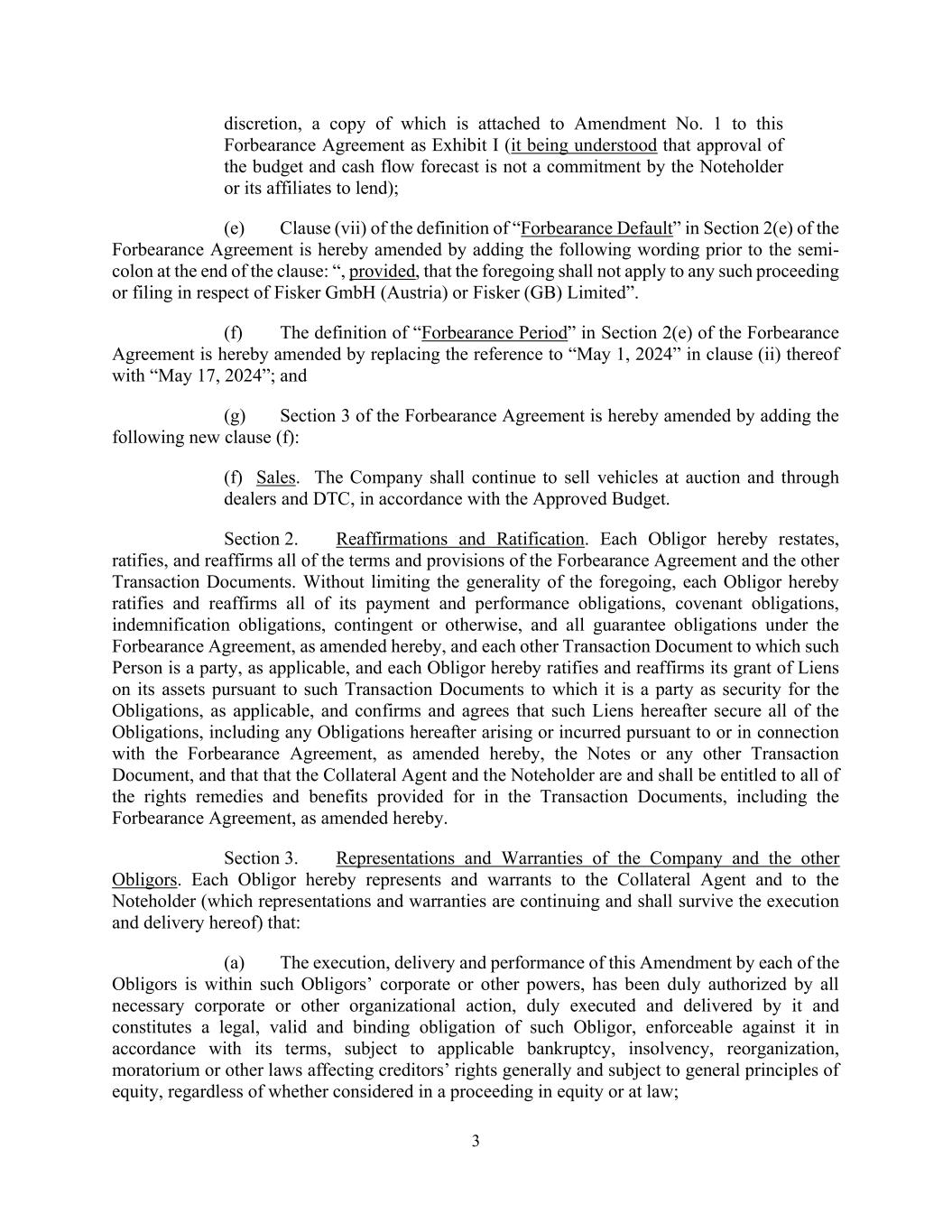 3 discretion, a copy of which is attached to Amendment No. 1 to this Forbearance Agreement as Exhibit I (it being understood that approval of the budget and cash flow forecast is not a commitment by the Noteholder or its affiliates to lend); (e) Clause (vii) of the definition of “Forbearance Default” in Section 2(e) of the Forbearance Agreement is hereby amended by adding the following wording prior to the semi- colon at the end of the clause: “, provided, that the foregoing shall not apply to any such proceeding or filing in respect of Fisker GmbH (Austria) or Fisker (GB) Limited”. (f) The definition of “Forbearance Period” in Section 2(e) of the Forbearance Agreement is hereby amended by replacing the reference to “May 1, 2024” in clause (ii) thereof with “May 17, 2024”; and (g) Section 3 of the Forbearance Agreement is hereby amended by adding the following new clause (f): (f) Sales. The Company shall continue to sell vehicles at auction and through dealers and DTC, in accordance with the Approved Budget. Section 2. Reaffirmations and Ratification. Each Obligor hereby restates, ratifies, and reaffirms all of the terms and provisions of the Forbearance Agreement and the other Transaction Documents. Without limiting the generality of the foregoing, each Obligor hereby ratifies and reaffirms all of its payment and performance obligations, covenant obligations, indemnification obligations, contingent or otherwise, and all guarantee obligations under the Forbearance Agreement, as amended hereby, and each other Transaction Document to which such Person is a party, as applicable, and each Obligor hereby ratifies and reaffirms its grant of Liens on its assets pursuant to such Transaction Documents to which it is a party as security for the Obligations, as applicable, and confirms and agrees that such Liens hereafter secure all of the Obligations, including any Obligations hereafter arising or incurred pursuant to or in connection with the Forbearance Agreement, as amended hereby, the Notes or any other Transaction Document, and that that the Collateral Agent and the Noteholder are and shall be entitled to all of the rights remedies and benefits provided for in the Transaction Documents, including the Forbearance Agreement, as amended hereby. Section 3. Representations and Warranties of the Company and the other Obligors. Each Obligor hereby represents and warrants to the Collateral Agent and to the Noteholder (which representations and warranties are continuing and shall survive the execution and delivery hereof) that: (a) The execution, delivery and performance of this Amendment by each of the Obligors is within such Obligors’ corporate or other powers, has been duly authorized by all necessary corporate or other organizational action, duly executed and delivered by it and constitutes a legal, valid and binding obligation of such Obligor, enforceable against it in accordance with its terms, subject to applicable bankruptcy, insolvency, reorganization, moratorium or other laws affecting creditors’ rights generally and subject to general principles of equity, regardless of whether considered in a proceeding in equity or at law;