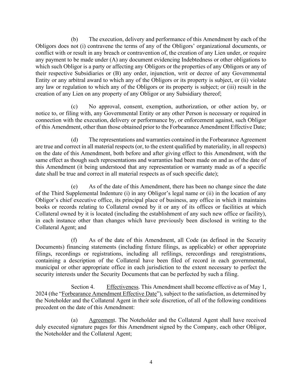 4 (b) The execution, delivery and performance of this Amendment by each of the Obligors does not (i) contravene the terms of any of the Obligors’ organizational documents, or conflict with or result in any breach or contravention of, the creation of any Lien under, or require any payment to be made under (A) any document evidencing Indebtedness or other obligations to which such Obligor is a party or affecting any Obligors or the properties of any Obligors or any of their respective Subsidiaries or (B) any order, injunction, writ or decree of any Governmental Entity or any arbitral award to which any of the Obligors or its property is subject, or (ii) violate any law or regulation to which any of the Obligors or its property is subject; or (iii) result in the creation of any Lien on any property of any Obligor or any Subsidiary thereof; (c) No approval, consent, exemption, authorization, or other action by, or notice to, or filing with, any Governmental Entity or any other Person is necessary or required in connection with the execution, delivery or performance by, or enforcement against, such Obligor of this Amendment, other than those obtained prior to the Forbearance Amendment Effective Date; (d) The representations and warranties contained in the Forbearance Agreement are true and correct in all material respects (or, to the extent qualified by materiality, in all respects) on the date of this Amendment, both before and after giving effect to this Amendment, with the same effect as though such representations and warranties had been made on and as of the date of this Amendment (it being understood that any representation or warranty made as of a specific date shall be true and correct in all material respects as of such specific date); (e) As of the date of this Amendment, there has been no change since the date of the Third Supplemental Indenture (i) in any Obligor’s legal name or (ii) in the location of any Obligor’s chief executive office, its principal place of business, any office in which it maintains books or records relating to Collateral owned by it or any of its offices or facilities at which Collateral owned by it is located (including the establishment of any such new office or facility), in each instance other than changes which have previously been disclosed in writing to the Collateral Agent; and (f) As of the date of this Amendment, all Code (as defined in the Security Documents) financing statements (including fixture filings, as applicable) or other appropriate filings, recordings or registrations, including all refilings, rerecordings and reregistrations, containing a description of the Collateral have been filed of record in each governmental, municipal or other appropriate office in each jurisdiction to the extent necessary to perfect the security interests under the Security Documents that can be perfected by such a filing. Section 4. Effectiveness. This Amendment shall become effective as of May 1, 2024 (the “Forbearance Amendment Effective Date”), subject to the satisfaction, as determined by the Noteholder and the Collateral Agent in their sole discretion, of all of the following conditions precedent on the date of this Amendment: (a) Agreement. The Noteholder and the Collateral Agent shall have received duly executed signature pages for this Amendment signed by the Company, each other Obligor, the Noteholder and the Collateral Agent;