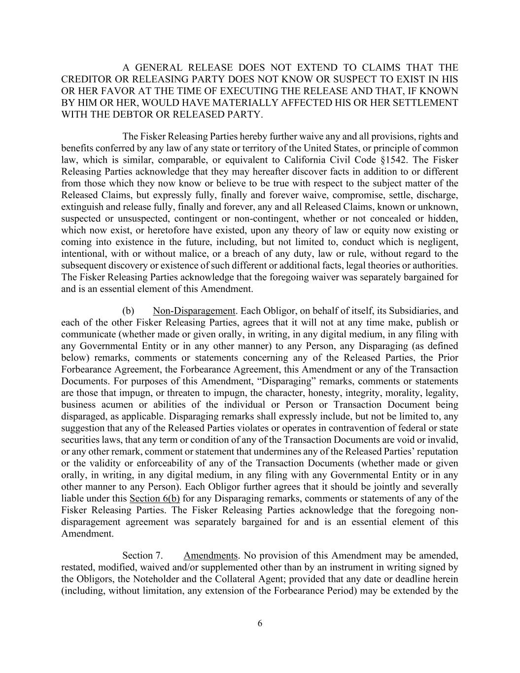 6 A GENERAL RELEASE DOES NOT EXTEND TO CLAIMS THAT THE CREDITOR OR RELEASING PARTY DOES NOT KNOW OR SUSPECT TO EXIST IN HIS OR HER FAVOR AT THE TIME OF EXECUTING THE RELEASE AND THAT, IF KNOWN BY HIM OR HER, WOULD HAVE MATERIALLY AFFECTED HIS OR HER SETTLEMENT WITH THE DEBTOR OR RELEASED PARTY. The Fisker Releasing Parties hereby further waive any and all provisions, rights and benefits conferred by any law of any state or territory of the United States, or principle of common law, which is similar, comparable, or equivalent to California Civil Code §1542. The Fisker Releasing Parties acknowledge that they may hereafter discover facts in addition to or different from those which they now know or believe to be true with respect to the subject matter of the Released Claims, but expressly fully, finally and forever waive, compromise, settle, discharge, extinguish and release fully, finally and forever, any and all Released Claims, known or unknown, suspected or unsuspected, contingent or non-contingent, whether or not concealed or hidden, which now exist, or heretofore have existed, upon any theory of law or equity now existing or coming into existence in the future, including, but not limited to, conduct which is negligent, intentional, with or without malice, or a breach of any duty, law or rule, without regard to the subsequent discovery or existence of such different or additional facts, legal theories or authorities. The Fisker Releasing Parties acknowledge that the foregoing waiver was separately bargained for and is an essential element of this Amendment. (b) Non-Disparagement. Each Obligor, on behalf of itself, its Subsidiaries, and each of the other Fisker Releasing Parties, agrees that it will not at any time make, publish or communicate (whether made or given orally, in writing, in any digital medium, in any filing with any Governmental Entity or in any other manner) to any Person, any Disparaging (as defined below) remarks, comments or statements concerning any of the Released Parties, the Prior Forbearance Agreement, the Forbearance Agreement, this Amendment or any of the Transaction Documents. For purposes of this Amendment, “Disparaging” remarks, comments or statements are those that impugn, or threaten to impugn, the character, honesty, integrity, morality, legality, business acumen or abilities of the individual or Person or Transaction Document being disparaged, as applicable. Disparaging remarks shall expressly include, but not be limited to, any suggestion that any of the Released Parties violates or operates in contravention of federal or state securities laws, that any term or condition of any of the Transaction Documents are void or invalid, or any other remark, comment or statement that undermines any of the Released Parties’ reputation or the validity or enforceability of any of the Transaction Documents (whether made or given orally, in writing, in any digital medium, in any filing with any Governmental Entity or in any other manner to any Person). Each Obligor further agrees that it should be jointly and severally liable under this Section 6(b) for any Disparaging remarks, comments or statements of any of the Fisker Releasing Parties. The Fisker Releasing Parties acknowledge that the foregoing non- disparagement agreement was separately bargained for and is an essential element of this Amendment. Section 7. Amendments. No provision of this Amendment may be amended, restated, modified, waived and/or supplemented other than by an instrument in writing signed by the Obligors, the Noteholder and the Collateral Agent; provided that any date or deadline herein (including, without limitation, any extension of the Forbearance Period) may be extended by the