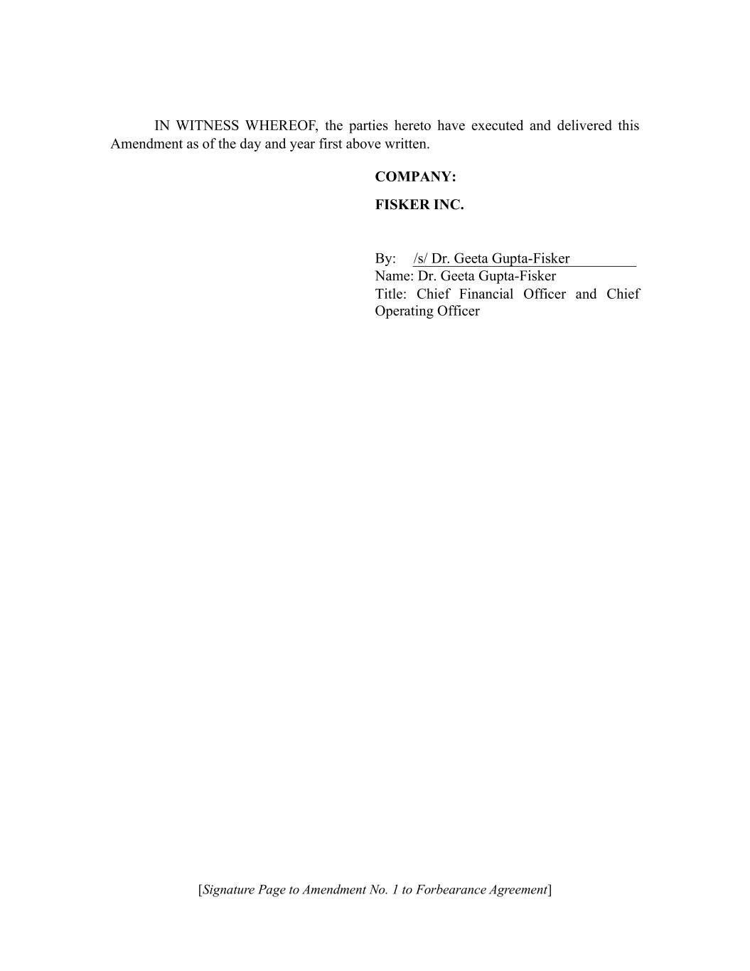 [Signature Page to Amendment No. 1 to Forbearance Agreement] IN WITNESS WHEREOF, the parties hereto have executed and delivered this Amendment as of the day and year first above written. COMPANY: FISKER INC. By: /s/ Dr. Geeta Gupta-Fisker Name: Dr. Geeta Gupta-Fisker Title: Chief Financial Officer and Chief Operating Officer