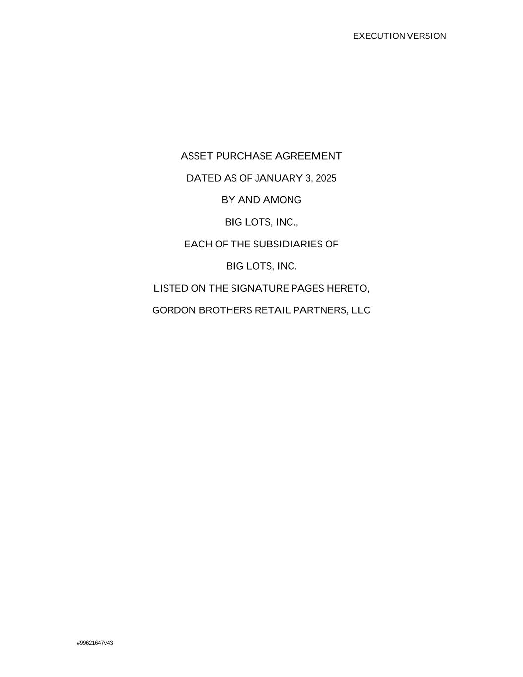 EXECUTION VERSION #99621647v43 ASSET PURCHASE AGREEMENT DATED AS OF JANUARY 3, 2025 BY AND AMONG BIG LOTS, INC., EACH OF THE SUBSIDIARIES OF BIG LOTS, INC. LISTED ON THE SIGNATURE PAGES HERETO, GORDON BROTHERS RETAIL PARTNERS, LLC