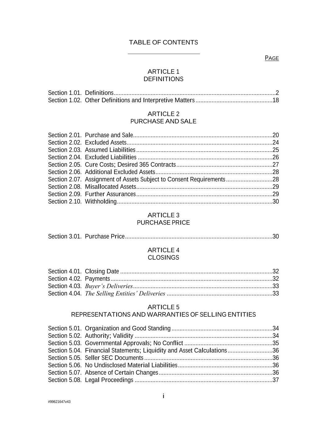 i #99621647v43 TABLE OF CONTENTS PAGE ARTICLE 1 DEFINITIONS Section 1.01. Definitions .....................................................................................................2 Section 1.02. Other Definitions and Interpretive Matters ................................................18 ARTICLE 2 PURCHASE AND SALE Section 2.01. Purchase and Sale .......................................................................................20 Section 2.02. Excluded Assets ...........................................................................................24 Section 2.03. Assumed Liabilities .....................................................................................25 Section 2.04. Excluded Liabilities ....................................................................................26 Section 2.05. Cure Costs; Desired 365 Contracts ............................................................27 Section 2.06. Additional Excluded Assets .........................................................................28 Section 2.07. Assignment of Assets Subject to Consent Requirements .............................28 Section 2.08. Misallocated Assets .....................................................................................29 Section 2.09. Further Assurances .....................................................................................29 Section 2.10. Withholding .................................................................................................30 ARTICLE 3 PURCHASE PRICE Section 3.01. Purchase Price ............................................................................................30 ARTICLE 4 CLOSINGS Section 4.01. Closing Date ...............................................................................................32 Section 4.02. Payments .....................................................................................................32 Section 4.03. Buyer’s Deliveries .......................................................................................33 Section 4.04. The Selling Entities’ Deliveries ..................................................................33 ARTICLE 5 REPRESENTATIONS AND WARRANTIES OF SELLING ENTITIES Section 5.01. Organization and Good Standing ...............................................................34 Section 5.02. Authority; Validity ......................................................................................34 Section 5.03. Governmental Approvals; No Conflict .......................................................35 Section 5.04. Financial Statements; Liquidity and Asset Calculations ............................36 Section 5.05. Seller SEC Documents ................................................................................36 Section 5.06. No Undisclosed Material Liabilities ...........................................................36 Section 5.07. Absence of Certain Changes .......................................................................36 Section 5.08. Legal Proceedings ......................................................................................37