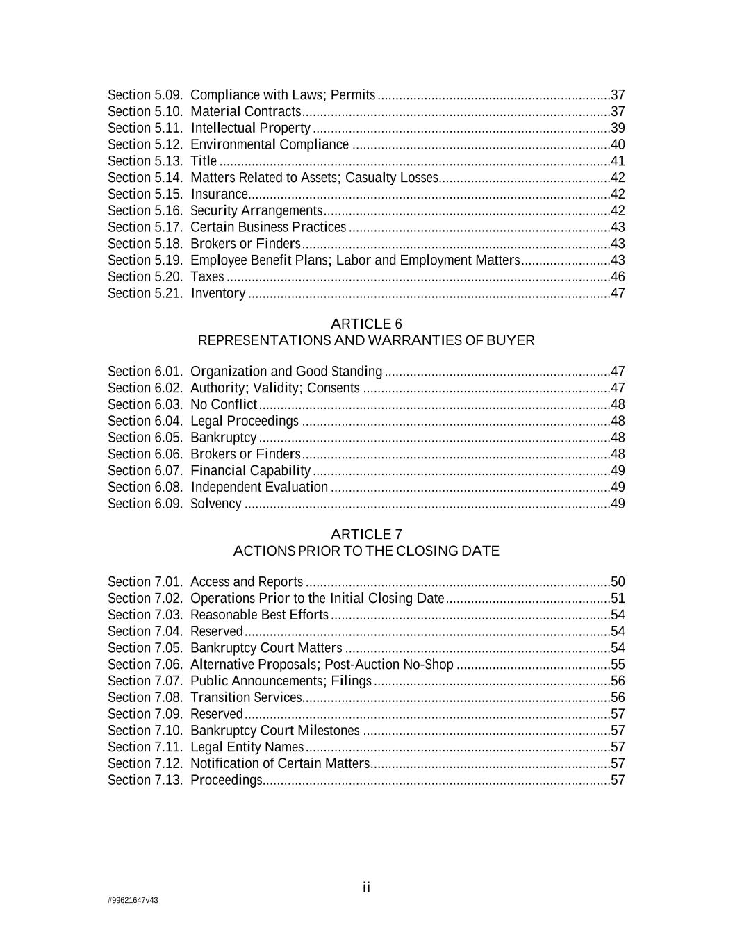 ii #99621647v43 Section 5.09. Compliance with Laws; Permits .................................................................37 Section 5.10. Material Contracts ......................................................................................37 Section 5.11. Intellectual Property ...................................................................................39 Section 5.12. Environmental Compliance ........................................................................40 Section 5.13. Title .............................................................................................................41 Section 5.14. Matters Related to Assets; Casualty Losses ................................................42 Section 5.15. Insurance.....................................................................................................42 Section 5.16. Security Arrangements ................................................................................42 Section 5.17. Certain Business Practices .........................................................................43 Section 5.18. Brokers or Finders ......................................................................................43 Section 5.19. Employee Benefit Plans; Labor and Employment Matters .........................43 Section 5.20. Taxes ...........................................................................................................46 Section 5.21. Inventory .....................................................................................................47 ARTICLE 6 REPRESENTATIONS AND WARRANTIES OF BUYER Section 6.01. Organization and Good Standing ...............................................................47 Section 6.02. Authority; Validity; Consents .....................................................................47 Section 6.03. No Conflict ..................................................................................................48 Section 6.04. Legal Proceedings ......................................................................................48 Section 6.05. Bankruptcy ..................................................................................................48 Section 6.06. Brokers or Finders ......................................................................................48 Section 6.07. Financial Capability ...................................................................................49 Section 6.08. Independent Evaluation ..............................................................................49 Section 6.09. Solvency ......................................................................................................49 ARTICLE 7 ACTIONS PRIOR TO THE CLOSING DATE Section 7.01. Access and Reports .....................................................................................50 Section 7.02. Operations Prior to the Initial Closing Date ..............................................51 Section 7.03. Reasonable Best Efforts ..............................................................................54 Section 7.04. Reserved ......................................................................................................54 Section 7.05. Bankruptcy Court Matters ..........................................................................54 Section 7.06. Alternative Proposals; Post-Auction No-Shop ...........................................55 Section 7.07. Public Announcements; Filings ..................................................................56 Section 7.08. Transition Services......................................................................................56 Section 7.09. Reserved ......................................................................................................57 Section 7.10. Bankruptcy Court Milestones .....................................................................57 Section 7.11. Legal Entity Names .....................................................................................57 Section 7.12. Notification of Certain Matters ...................................................................57 Section 7.13. Proceedings.................................................................................................57
