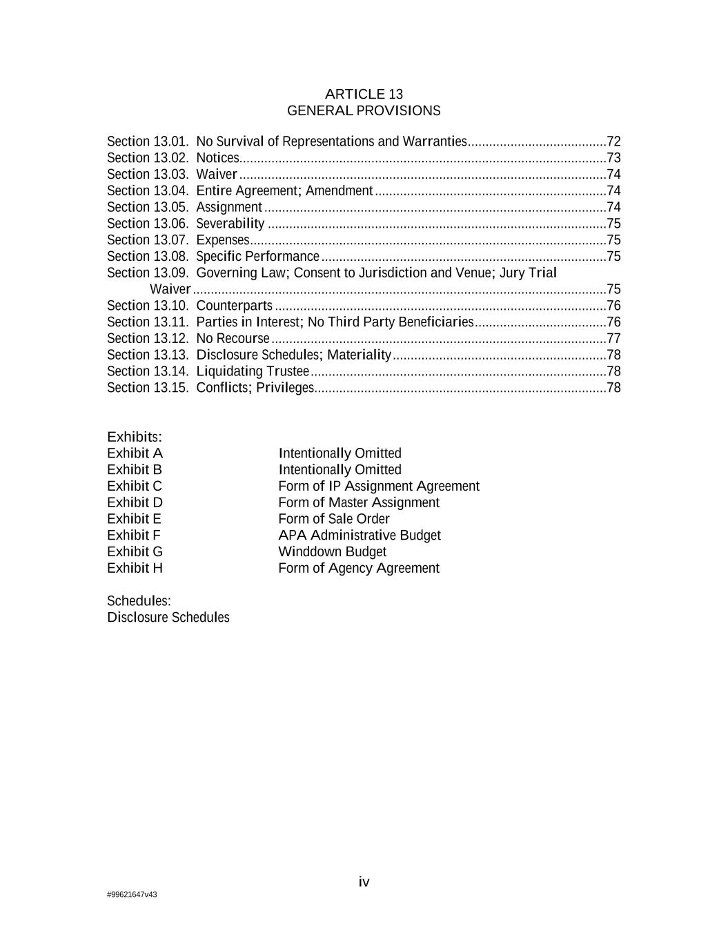 iv #99621647v43 ARTICLE 13 GENERAL PROVISIONS Section 13.01. No Survival of Representations and Warranties .......................................72 Section 13.02. Notices.......................................................................................................73 Section 13.03. Waiver .......................................................................................................74 Section 13.04. Entire Agreement; Amendment .................................................................74 Section 13.05. Assignment ................................................................................................74 Section 13.06. Severability ...............................................................................................75 Section 13.07. Expenses ....................................................................................................75 Section 13.08. Specific Performance ................................................................................75 Section 13.09. Governing Law; Consent to Jurisdiction and Venue; Jury Trial Waiver ....................................................................................................................75 Section 13.10. Counterparts .............................................................................................76 Section 13.11. Parties in Interest; No Third Party Beneficiaries .....................................76 Section 13.12. No Recourse ..............................................................................................77 Section 13.13. Disclosure Schedules; Materiality ............................................................78 Section 13.14. Liquidating Trustee ...................................................................................78 Section 13.15. Conflicts; Privileges ..................................................................................78 Exhibits: Exhibit A Intentionally Omitted Exhibit B Intentionally Omitted Exhibit C Form of IP Assignment Agreement Exhibit D Form of Master Assignment Exhibit E Form of Sale Order Exhibit F APA Administrative Budget Exhibit G Winddown Budget Exhibit H Form of Agency Agreement Schedules: Disclosure Schedules