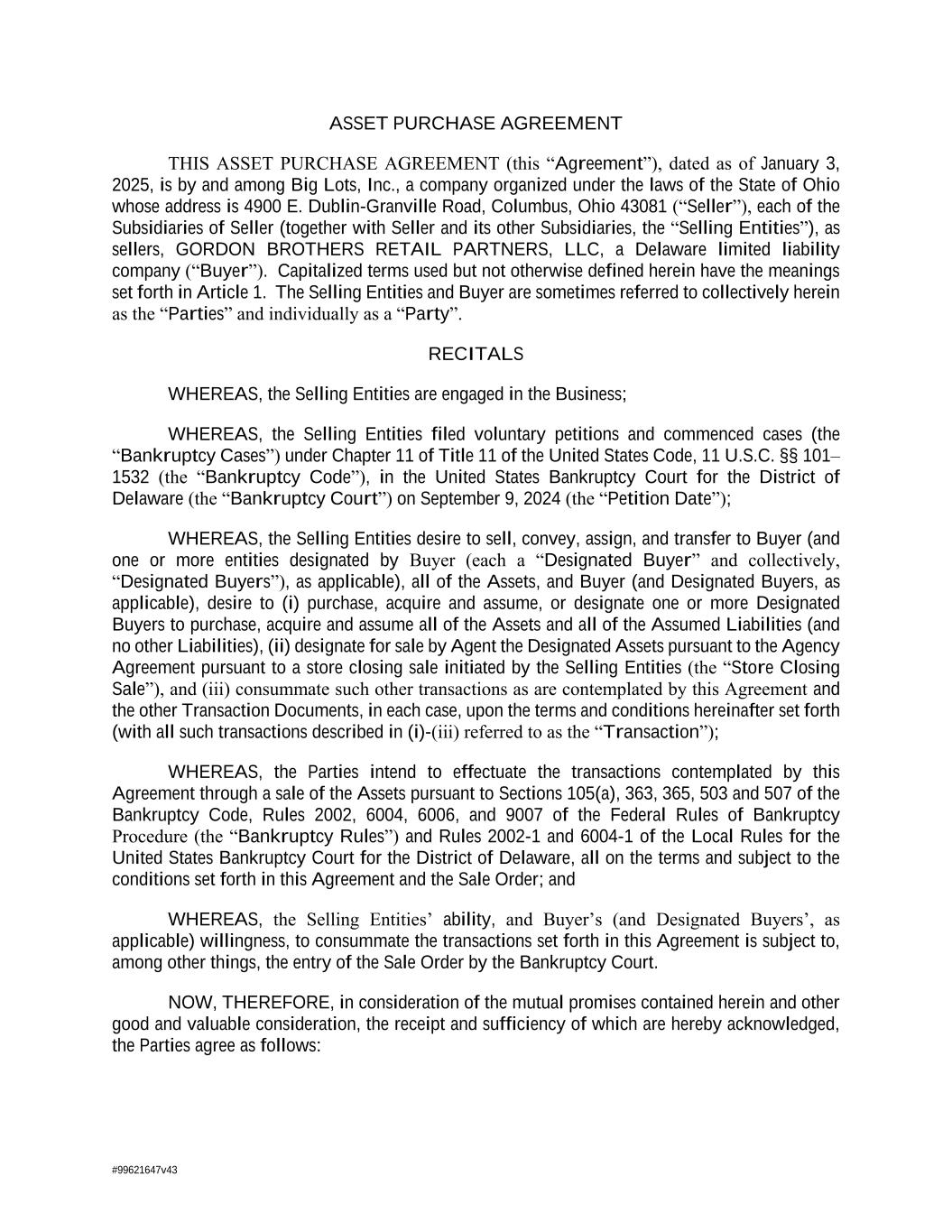 #99621647v43 ASSET PURCHASE AGREEMENT THIS ASSET PURCHASE AGREEMENT (this “Agreement”), dated as of January 3, 2025, is by and among Big Lots, Inc., a company organized under the laws of the State of Ohio whose address is 4900 E. Dublin-Granville Road, Columbus, Ohio 43081 (“Seller”), each of the Subsidiaries of Seller (together with Seller and its other Subsidiaries, the “Selling Entities”), as sellers, GORDON BROTHERS RETAIL PARTNERS, LLC, a Delaware limited liability company (“Buyer”). Capitalized terms used but not otherwise defined herein have the meanings set forth in Article 1. The Selling Entities and Buyer are sometimes referred to collectively herein as the “Parties” and individually as a “Party”. RECITALS WHEREAS, the Selling Entities are engaged in the Business; WHEREAS, the Selling Entities filed voluntary petitions and commenced cases (the “Bankruptcy Cases”) under Chapter 11 of Title 11 of the United States Code, 11 U.S.C. §§ 101– 1532 (the “Bankruptcy Code”), in the United States Bankruptcy Court for the District of Delaware (the “Bankruptcy Court”) on September 9, 2024 (the “Petition Date”); WHEREAS, the Selling Entities desire to sell, convey, assign, and transfer to Buyer (and one or more entities designated by Buyer (each a “Designated Buyer” and collectively, “Designated Buyers”), as applicable), all of the Assets, and Buyer (and Designated Buyers, as applicable), desire to (i) purchase, acquire and assume, or designate one or more Designated Buyers to purchase, acquire and assume all of the Assets and all of the Assumed Liabilities (and no other Liabilities), (ii) designate for sale by Agent the Designated Assets pursuant to the Agency Agreement pursuant to a store closing sale initiated by the Selling Entities (the “Store Closing Sale”), and (iii) consummate such other transactions as are contemplated by this Agreement and the other Transaction Documents, in each case, upon the terms and conditions hereinafter set forth (with all such transactions described in (i)-(iii) referred to as the “Transaction”); WHEREAS, the Parties intend to effectuate the transactions contemplated by this Agreement through a sale of the Assets pursuant to Sections 105(a), 363, 365, 503 and 507 of the Bankruptcy Code, Rules 2002, 6004, 6006, and 9007 of the Federal Rules of Bankruptcy Procedure (the “Bankruptcy Rules”) and Rules 2002-1 and 6004-1 of the Local Rules for the United States Bankruptcy Court for the District of Delaware, all on the terms and subject to the conditions set forth in this Agreement and the Sale Order; and WHEREAS, the Selling Entities’ ability, and Buyer’s (and Designated Buyers’, as applicable) willingness, to consummate the transactions set forth in this Agreement is subject to, among other things, the entry of the Sale Order by the Bankruptcy Court. NOW, THEREFORE, in consideration of the mutual promises contained herein and other good and valuable consideration, the receipt and sufficiency of which are hereby acknowledged, the Parties agree as follows: