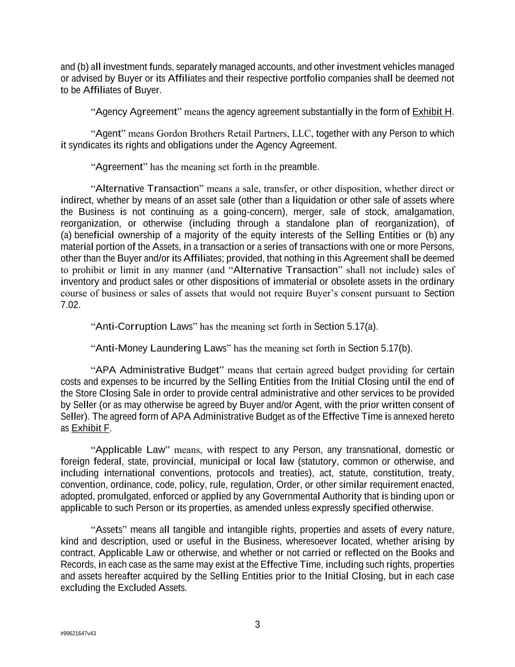 3 #99621647v43 and (b) all investment funds, separately managed accounts, and other investment vehicles managed or advised by Buyer or its Affiliates and their respective portfolio companies shall be deemed not to be Affiliates of Buyer. “Agency Agreement” means the agency agreement substantially in the form of Exhibit H. “Agent” means Gordon Brothers Retail Partners, LLC, together with any Person to which it syndicates its rights and obligations under the Agency Agreement. “Agreement” has the meaning set forth in the preamble. “Alternative Transaction” means a sale, transfer, or other disposition, whether direct or indirect, whether by means of an asset sale (other than a liquidation or other sale of assets where the Business is not continuing as a going-concern), merger, sale of stock, amalgamation, reorganization, or otherwise (including through a standalone plan of reorganization), of (a) beneficial ownership of a majority of the equity interests of the Selling Entities or (b) any material portion of the Assets, in a transaction or a series of transactions with one or more Persons, other than the Buyer and/or its Affiliates; provided, that nothing in this Agreement shall be deemed to prohibit or limit in any manner (and “Alternative Transaction” shall not include) sales of inventory and product sales or other dispositions of immaterial or obsolete assets in the ordinary course of business or sales of assets that would not require Buyer’s consent pursuant to Section 7.02. “Anti-Corruption Laws” has the meaning set forth in Section 5.17(a). “Anti-Money Laundering Laws” has the meaning set forth in Section 5.17(b). “APA Administrative Budget” means that certain agreed budget providing for certain costs and expenses to be incurred by the Selling Entities from the Initial Closing until the end of the Store Closing Sale in order to provide central administrative and other services to be provided by Seller (or as may otherwise be agreed by Buyer and/or Agent, with the prior written consent of Seller). The agreed form of APA Administrative Budget as of the Effective Time is annexed hereto as Exhibit F. “Applicable Law” means, with respect to any Person, any transnational, domestic or foreign federal, state, provincial, municipal or local law (statutory, common or otherwise, and including international conventions, protocols and treaties), act, statute, constitution, treaty, convention, ordinance, code, policy, rule, regulation, Order, or other similar requirement enacted, adopted, promulgated, enforced or applied by any Governmental Authority that is binding upon or applicable to such Person or its properties, as amended unless expressly specified otherwise. “Assets” means all tangible and intangible rights, properties and assets of every nature, kind and description, used or useful in the Business, wheresoever located, whether arising by contract, Applicable Law or otherwise, and whether or not carried or reflected on the Books and Records, in each case as the same may exist at the Effective Time, including such rights, properties and assets hereafter acquired by the Selling Entities prior to the Initial Closing, but in each case excluding the Excluded Assets.