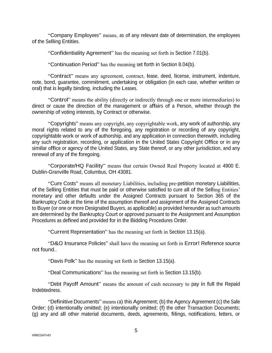 5 #99621647v43 “Company Employees” means, as of any relevant date of determination, the employees of the Selling Entities. “Confidentiality Agreement” has the meaning set forth in Section 7.01(b). “Continuation Period” has the meaning set forth in Section 8.04(b). “Contract” means any agreement, contract, lease, deed, license, instrument, indenture, note, bond, guarantee, commitment, undertaking or obligation (in each case, whether written or oral) that is legally binding, including the Leases. “Control” means the ability (directly or indirectly through one or more intermediaries) to direct or cause the direction of the management or affairs of a Person, whether through the ownership of voting interests, by Contract or otherwise. “Copyrights” means any copyright, any copyrightable work, any work of authorship, any moral rights related to any of the foregoing, any registration or recording of any copyright, copyrightable work or work of authorship, and any application in connection therewith, including any such registration, recording, or application in the United States Copyright Office or in any similar office or agency of the United States, any State thereof, or any other jurisdiction, and any renewal of any of the foregoing. “Corporate/HQ Facility” means that certain Owned Real Property located at 4900 E. Dublin-Granville Road, Columbus, OH 43081. “Cure Costs” means all monetary Liabilities, including pre-petition monetary Liabilities, of the Selling Entities that must be paid or otherwise satisfied to cure all of the Selling Entities’ monetary and other defaults under the Assigned Contracts pursuant to Section 365 of the Bankruptcy Code at the time of the assumption thereof and assignment of the Assigned Contracts to Buyer (or one or more Designated Buyers, as applicable) as provided hereunder as such amounts are determined by the Bankruptcy Court or approved pursuant to the Assignment and Assumption Procedures as defined and provided for in the Bidding Procedures Order. “Current Representation” has the meaning set forth in Section 13.15(a). “D&O Insurance Policies” shall have the meaning set forth in Error! Reference source not found.. “Davis Polk” has the meaning set forth in Section 13.15(a). “Deal Communications” has the meaning set forth in Section 13.15(b). “Debt Payoff Amount” means the amount of cash necessary to pay in full the Repaid Indebtedness. “Definitive Documents” means (a) this Agreement; (b) the Agency Agreement (c) the Sale Order; (d) intentionally omitted; (e) intentionally omitted; (f) the other Transaction Documents; (g) any and all other material documents, deeds, agreements, filings, notifications, letters, or