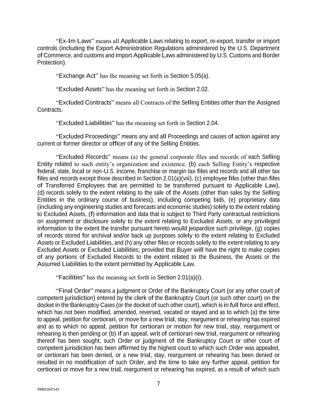 7 #99621647v43 “Ex-Im Laws” means all Applicable Laws relating to export, re-export, transfer or import controls (including the Export Administration Regulations administered by the U.S. Department of Commerce, and customs and import Applicable Laws administered by U.S. Customs and Border Protection). “Exchange Act” has the meaning set forth in Section 5.05(a). “Excluded Assets” has the meaning set forth in Section 2.02. “Excluded Contracts” means all Contracts of the Selling Entities other than the Assigned Contracts. “Excluded Liabilities” has the meaning set forth in Section 2.04. “Excluded Proceedings” means any and all Proceedings and causes of action against any current or former director or officer of any of the Selling Entities. “Excluded Records” means (a) the general corporate files and records of each Selling Entity related to such entity’s organization and existence, (b) each Selling Entity’s respective federal, state, local or non-U.S. income, franchise or margin tax files and records and all other tax files and records except those described in Section 2.01(a)(vii), (c) employee files (other than files of Transferred Employees that are permitted to be transferred pursuant to Applicable Law), (d) records solely to the extent relating to the sale of the Assets (other than sales by the Selling Entities in the ordinary course of business), including competing bids, (e) proprietary data (including any engineering studies and forecasts and economic studies) solely to the extent relating to Excluded Assets, (f) information and data that is subject to Third Party contractual restrictions on assignment or disclosure solely to the extent relating to Excluded Assets, or any privileged information to the extent the transfer pursuant hereto would jeopardize such privilege, (g) copies of records stored for archival and/or back up purposes solely to the extent relating to Excluded Assets or Excluded Liabilities, and (h) any other files or records solely to the extent relating to any Excluded Assets or Excluded Liabilities; provided that Buyer will have the right to make copies of any portions of Excluded Records to the extent related to the Business, the Assets or the Assumed Liabilities to the extent permitted by Applicable Law. “Facilities” has the meaning set forth in Section 2.01(a)(i). “Final Order” means a judgment or Order of the Bankruptcy Court (or any other court of competent jurisdiction) entered by the clerk of the Bankruptcy Court (or such other court) on the docket in the Bankruptcy Cases (or the docket of such other court), which is in full force and effect, which has not been modified, amended, reversed, vacated or stayed and as to which (a) the time to appeal, petition for certiorari, or move for a new trial, stay, reargument or rehearing has expired and as to which no appeal, petition for certiorari or motion for new trial, stay, reargument or rehearing is then pending or (b) if an appeal, writ of certiorari new trial, reargument or rehearing thereof has been sought, such Order or judgment of the Bankruptcy Court or other court of competent jurisdiction has been affirmed by the highest court to which such Order was appealed, or certiorari has been denied, or a new trial, stay, reargument or rehearing has been denied or resulted in no modification of such Order, and the time to take any further appeal, petition for certiorari or move for a new trial, reargument or rehearing has expired, as a result of which such