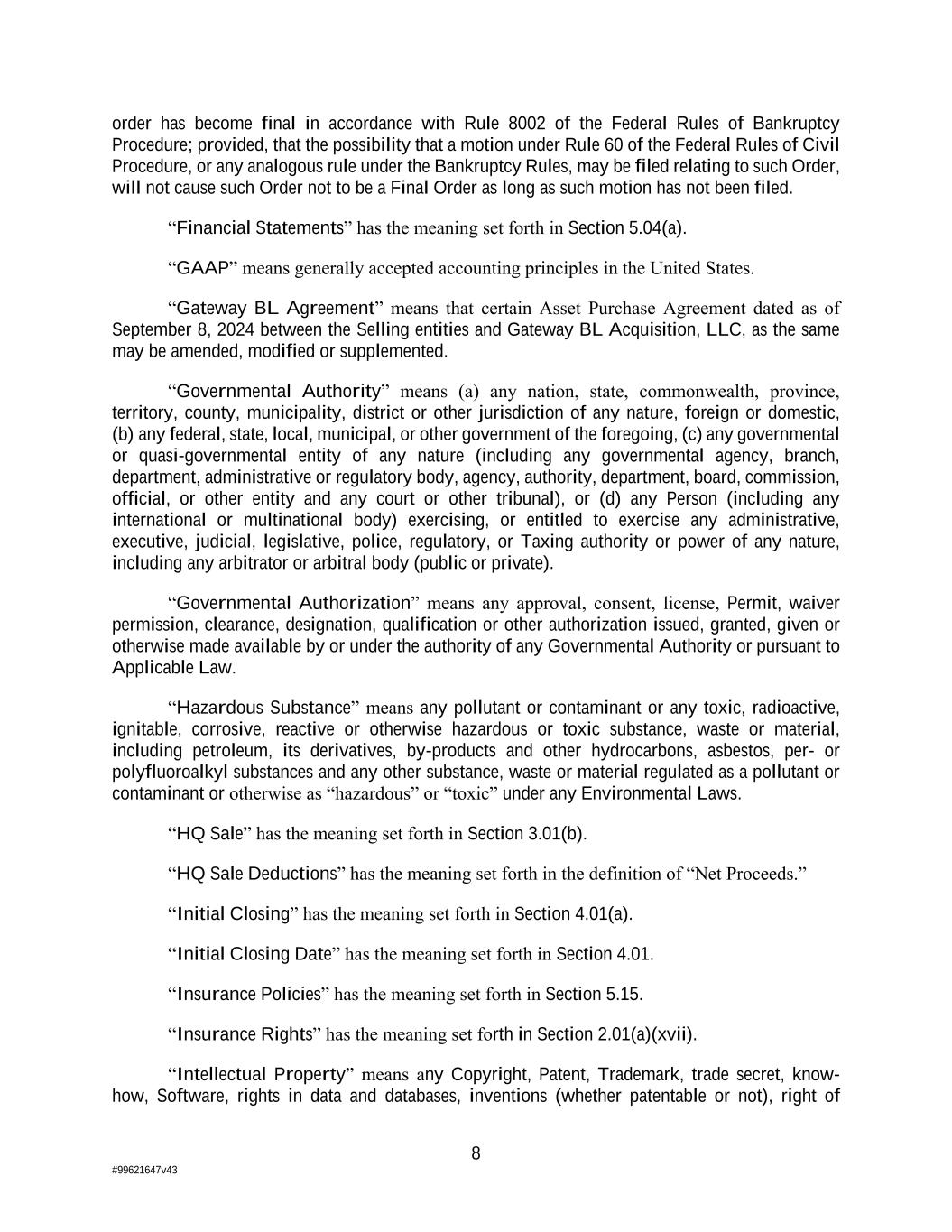 8 #99621647v43 order has become final in accordance with Rule 8002 of the Federal Rules of Bankruptcy Procedure; provided, that the possibility that a motion under Rule 60 of the Federal Rules of Civil Procedure, or any analogous rule under the Bankruptcy Rules, may be filed relating to such Order, will not cause such Order not to be a Final Order as long as such motion has not been filed. “Financial Statements” has the meaning set forth in Section 5.04(a). “GAAP” means generally accepted accounting principles in the United States. “Gateway BL Agreement” means that certain Asset Purchase Agreement dated as of September 8, 2024 between the Selling entities and Gateway BL Acquisition, LLC, as the same may be amended, modified or supplemented. “Governmental Authority” means (a) any nation, state, commonwealth, province, territory, county, municipality, district or other jurisdiction of any nature, foreign or domestic, (b) any federal, state, local, municipal, or other government of the foregoing, (c) any governmental or quasi-governmental entity of any nature (including any governmental agency, branch, department, administrative or regulatory body, agency, authority, department, board, commission, official, or other entity and any court or other tribunal), or (d) any Person (including any international or multinational body) exercising, or entitled to exercise any administrative, executive, judicial, legislative, police, regulatory, or Taxing authority or power of any nature, including any arbitrator or arbitral body (public or private). “Governmental Authorization” means any approval, consent, license, Permit, waiver permission, clearance, designation, qualification or other authorization issued, granted, given or otherwise made available by or under the authority of any Governmental Authority or pursuant to Applicable Law. “Hazardous Substance” means any pollutant or contaminant or any toxic, radioactive, ignitable, corrosive, reactive or otherwise hazardous or toxic substance, waste or material, including petroleum, its derivatives, by-products and other hydrocarbons, asbestos, per- or polyfluoroalkyl substances and any other substance, waste or material regulated as a pollutant or contaminant or otherwise as “hazardous” or “toxic” under any Environmental Laws. “HQ Sale” has the meaning set forth in Section 3.01(b). “HQ Sale Deductions” has the meaning set forth in the definition of “Net Proceeds.” “Initial Closing” has the meaning set forth in Section 4.01(a). “Initial Closing Date” has the meaning set forth in Section 4.01. “Insurance Policies” has the meaning set forth in Section 5.15. “Insurance Rights” has the meaning set forth in Section 2.01(a)(xvii). “Intellectual Property” means any Copyright, Patent, Trademark, trade secret, know- how, Software, rights in data and databases, inventions (whether patentable or not), right of