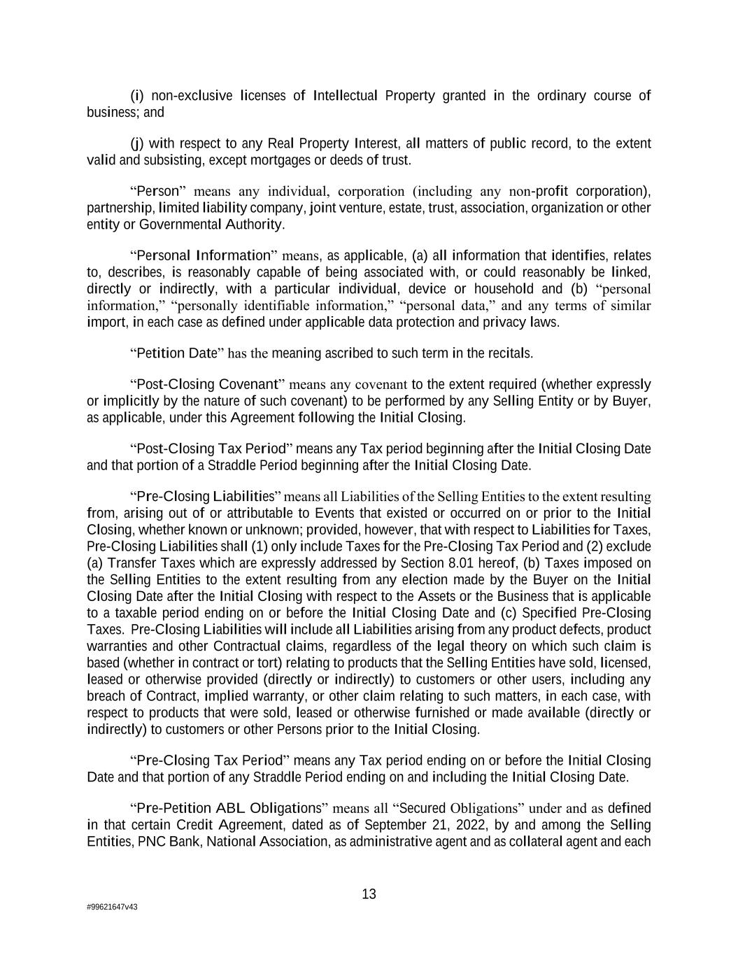 13 #99621647v43 (i) non-exclusive licenses of Intellectual Property granted in the ordinary course of business; and (j) with respect to any Real Property Interest, all matters of public record, to the extent valid and subsisting, except mortgages or deeds of trust. “Person” means any individual, corporation (including any non-profit corporation), partnership, limited liability company, joint venture, estate, trust, association, organization or other entity or Governmental Authority. “Personal Information” means, as applicable, (a) all information that identifies, relates to, describes, is reasonably capable of being associated with, or could reasonably be linked, directly or indirectly, with a particular individual, device or household and (b) “personal information,” “personally identifiable information,” “personal data,” and any terms of similar import, in each case as defined under applicable data protection and privacy laws. “Petition Date” has the meaning ascribed to such term in the recitals. “Post-Closing Covenant” means any covenant to the extent required (whether expressly or implicitly by the nature of such covenant) to be performed by any Selling Entity or by Buyer, as applicable, under this Agreement following the Initial Closing. “Post-Closing Tax Period” means any Tax period beginning after the Initial Closing Date and that portion of a Straddle Period beginning after the Initial Closing Date. “Pre-Closing Liabilities” means all Liabilities of the Selling Entities to the extent resulting from, arising out of or attributable to Events that existed or occurred on or prior to the Initial Closing, whether known or unknown; provided, however, that with respect to Liabilities for Taxes, Pre-Closing Liabilities shall (1) only include Taxes for the Pre-Closing Tax Period and (2) exclude (a) Transfer Taxes which are expressly addressed by Section 8.01 hereof, (b) Taxes imposed on the Selling Entities to the extent resulting from any election made by the Buyer on the Initial Closing Date after the Initial Closing with respect to the Assets or the Business that is applicable to a taxable period ending on or before the Initial Closing Date and (c) Specified Pre-Closing Taxes. Pre-Closing Liabilities will include all Liabilities arising from any product defects, product warranties and other Contractual claims, regardless of the legal theory on which such claim is based (whether in contract or tort) relating to products that the Selling Entities have sold, licensed, leased or otherwise provided (directly or indirectly) to customers or other users, including any breach of Contract, implied warranty, or other claim relating to such matters, in each case, with respect to products that were sold, leased or otherwise furnished or made available (directly or indirectly) to customers or other Persons prior to the Initial Closing. “Pre-Closing Tax Period” means any Tax period ending on or before the Initial Closing Date and that portion of any Straddle Period ending on and including the Initial Closing Date. “Pre-Petition ABL Obligations” means all “Secured Obligations” under and as defined in that certain Credit Agreement, dated as of September 21, 2022, by and among the Selling Entities, PNC Bank, National Association, as administrative agent and as collateral agent and each