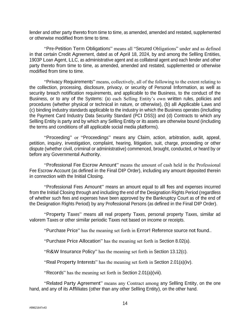14 #99621647v43 lender and other party thereto from time to time, as amended, amended and restated, supplemented or otherwise modified from time to time. “Pre-Petition Term Obligations” means all “Secured Obligations” under and as defined in that certain Credit Agreement, dated as of April 18, 2024, by and among the Selling Entities, 1903P Loan Agent, LLC, as administrative agent and as collateral agent and each lender and other party thereto from time to time, as amended, amended and restated, supplemented or otherwise modified from time to time. “Privacy Requirements” means, collectively, all of the following to the extent relating to the collection, processing, disclosure, privacy, or security of Personal Information, as well as security breach notification requirements, and applicable to the Business, to the conduct of the Business, or to any of the Systems: (a) each Selling Entity’s own written rules, policies and procedures (whether physical or technical in nature, or otherwise), (b) all Applicable Laws and (c) binding industry standards applicable to the industry in which the Business operates (including the Payment Card Industry Data Security Standard (PCI DSS)) and (d) Contracts to which any Selling Entity is party and by which any Selling Entity or its assets are otherwise bound (including the terms and conditions of all applicable social media platforms). “Proceeding” or “Proceedings” means any Claim, action, arbitration, audit, appeal, petition, inquiry, investigation, complaint, hearing, litigation, suit, charge, proceeding or other dispute (whether civil, criminal or administrative) commenced, brought, conducted, or heard by or before any Governmental Authority. “Professional Fee Escrow Amount” means the amount of cash held in the Professional Fee Escrow Account (as defined in the Final DIP Order), including any amount deposited therein in connection with the Initial Closing. “Professional Fees Amount” means an amount equal to all fees and expenses incurred from the Initial Closing through and including the end of the Designation Rights Period (regardless of whether such fees and expenses have been approved by the Bankruptcy Court as of the end of the Designation Rights Period) by any Professional Persons (as defined in the Final DIP Order). “Property Taxes” means all real property Taxes, personal property Taxes, similar ad valorem Taxes or other similar periodic Taxes not based on income or receipts. “Purchase Price” has the meaning set forth in Error! Reference source not found.. “Purchase Price Allocation” has the meaning set forth in Section 8.02(a). “R&W Insurance Policy” has the meaning set forth in Section 13.12(c). “Real Property Interests” has the meaning set forth in Section 2.01(a)(iv). “Records” has the meaning set forth in Section 2.01(a)(vii). “Related Party Agreement” means any Contract among any Selling Entity, on the one hand, and any of its Affiliates (other than any other Selling Entity), on the other hand.