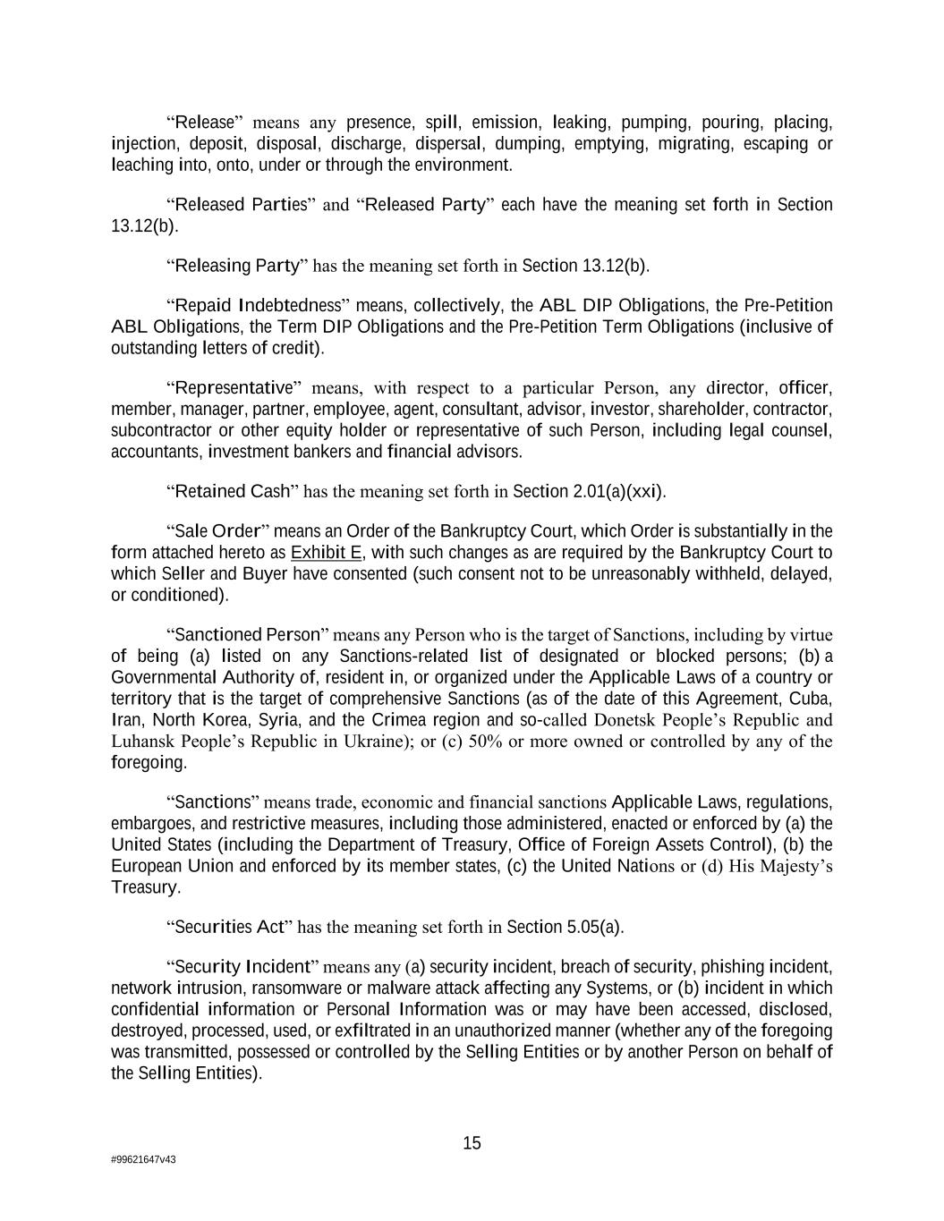 15 #99621647v43 “Release” means any presence, spill, emission, leaking, pumping, pouring, placing, injection, deposit, disposal, discharge, dispersal, dumping, emptying, migrating, escaping or leaching into, onto, under or through the environment. “Released Parties” and “Released Party” each have the meaning set forth in Section 13.12(b). “Releasing Party” has the meaning set forth in Section 13.12(b). “Repaid Indebtedness” means, collectively, the ABL DIP Obligations, the Pre-Petition ABL Obligations, the Term DIP Obligations and the Pre-Petition Term Obligations (inclusive of outstanding letters of credit). “Representative” means, with respect to a particular Person, any director, officer, member, manager, partner, employee, agent, consultant, advisor, investor, shareholder, contractor, subcontractor or other equity holder or representative of such Person, including legal counsel, accountants, investment bankers and financial advisors. “Retained Cash” has the meaning set forth in Section 2.01(a)(xxi). “Sale Order” means an Order of the Bankruptcy Court, which Order is substantially in the form attached hereto as Exhibit E, with such changes as are required by the Bankruptcy Court to which Seller and Buyer have consented (such consent not to be unreasonably withheld, delayed, or conditioned). “Sanctioned Person” means any Person who is the target of Sanctions, including by virtue of being (a) listed on any Sanctions-related list of designated or blocked persons; (b) a Governmental Authority of, resident in, or organized under the Applicable Laws of a country or territory that is the target of comprehensive Sanctions (as of the date of this Agreement, Cuba, Iran, North Korea, Syria, and the Crimea region and so-called Donetsk People’s Republic and Luhansk People’s Republic in Ukraine); or (c) 50% or more owned or controlled by any of the foregoing. “Sanctions” means trade, economic and financial sanctions Applicable Laws, regulations, embargoes, and restrictive measures, including those administered, enacted or enforced by (a) the United States (including the Department of Treasury, Office of Foreign Assets Control), (b) the European Union and enforced by its member states, (c) the United Nations or (d) His Majesty’s Treasury. “Securities Act” has the meaning set forth in Section 5.05(a). “Security Incident” means any (a) security incident, breach of security, phishing incident, network intrusion, ransomware or malware attack affecting any Systems, or (b) incident in which confidential information or Personal Information was or may have been accessed, disclosed, destroyed, processed, used, or exfiltrated in an unauthorized manner (whether any of the foregoing was transmitted, possessed or controlled by the Selling Entities or by another Person on behalf of the Selling Entities).