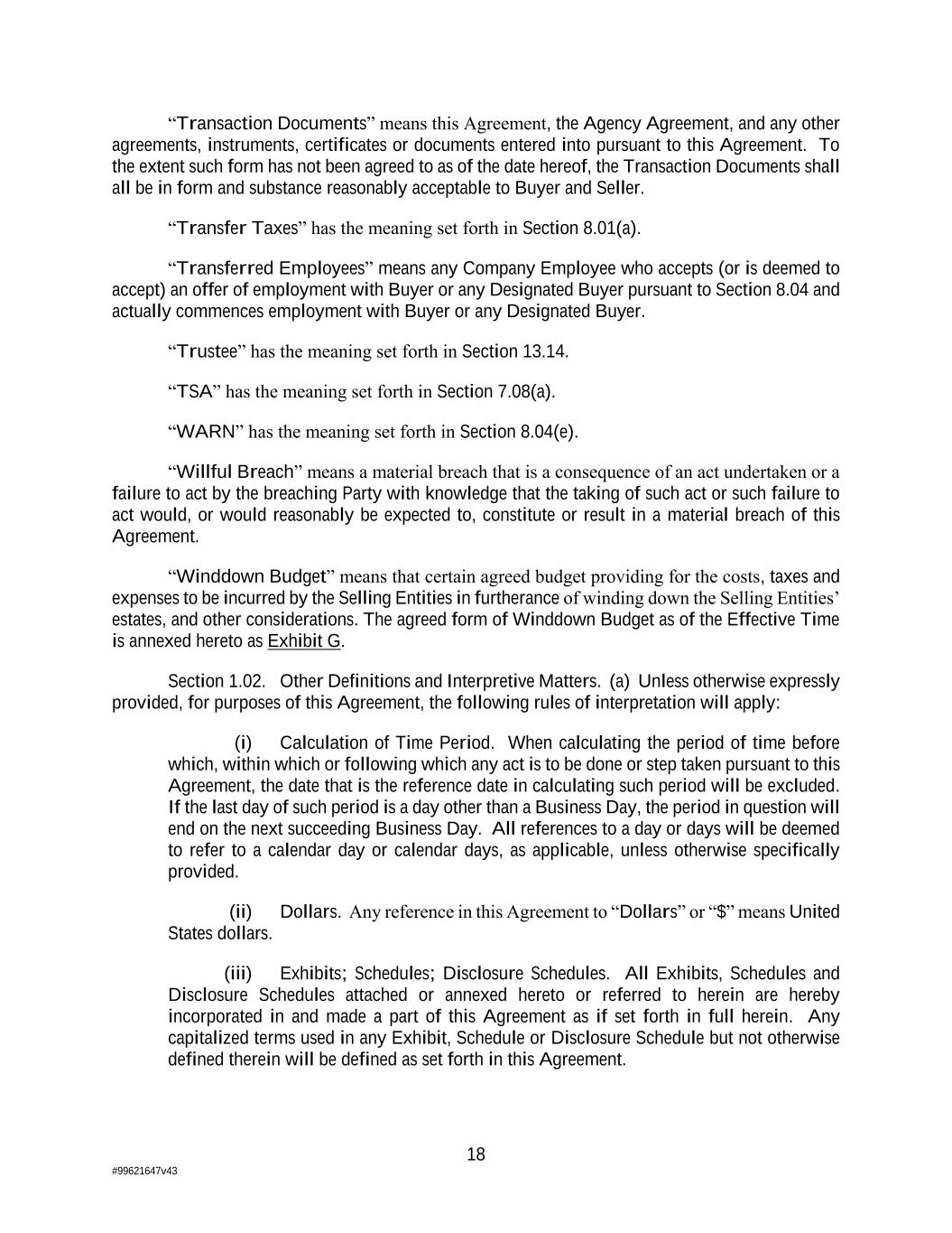 18 #99621647v43 “Transaction Documents” means this Agreement, the Agency Agreement, and any other agreements, instruments, certificates or documents entered into pursuant to this Agreement. To the extent such form has not been agreed to as of the date hereof, the Transaction Documents shall all be in form and substance reasonably acceptable to Buyer and Seller. “Transfer Taxes” has the meaning set forth in Section 8.01(a). “Transferred Employees” means any Company Employee who accepts (or is deemed to accept) an offer of employment with Buyer or any Designated Buyer pursuant to Section 8.04 and actually commences employment with Buyer or any Designated Buyer. “Trustee” has the meaning set forth in Section 13.14. “TSA” has the meaning set forth in Section 7.08(a). “WARN” has the meaning set forth in Section 8.04(e). “Willful Breach” means a material breach that is a consequence of an act undertaken or a failure to act by the breaching Party with knowledge that the taking of such act or such failure to act would, or would reasonably be expected to, constitute or result in a material breach of this Agreement. “Winddown Budget” means that certain agreed budget providing for the costs, taxes and expenses to be incurred by the Selling Entities in furtherance of winding down the Selling Entities’ estates, and other considerations. The agreed form of Winddown Budget as of the Effective Time is annexed hereto as Exhibit G. Section 1.02. Other Definitions and Interpretive Matters. (a) Unless otherwise expressly provided, for purposes of this Agreement, the following rules of interpretation will apply: (i) Calculation of Time Period. When calculating the period of time before which, within which or following which any act is to be done or step taken pursuant to this Agreement, the date that is the reference date in calculating such period will be excluded. If the last day of such period is a day other than a Business Day, the period in question will end on the next succeeding Business Day. All references to a day or days will be deemed to refer to a calendar day or calendar days, as applicable, unless otherwise specifically provided. (ii) Dollars. Any reference in this Agreement to “Dollars” or “$” means United States dollars. (iii) Exhibits; Schedules; Disclosure Schedules. All Exhibits, Schedules and Disclosure Schedules attached or annexed hereto or referred to herein are hereby incorporated in and made a part of this Agreement as if set forth in full herein. Any capitalized terms used in any Exhibit, Schedule or Disclosure Schedule but not otherwise defined therein will be defined as set forth in this Agreement.