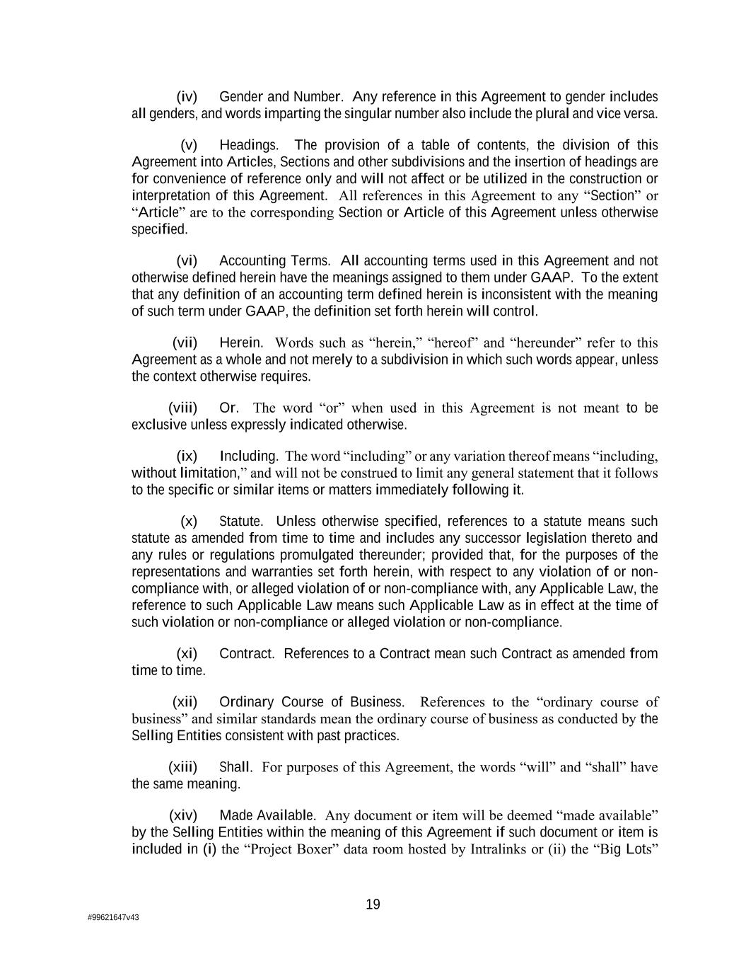 19 #99621647v43 (iv) Gender and Number. Any reference in this Agreement to gender includes all genders, and words imparting the singular number also include the plural and vice versa. (v) Headings. The provision of a table of contents, the division of this Agreement into Articles, Sections and other subdivisions and the insertion of headings are for convenience of reference only and will not affect or be utilized in the construction or interpretation of this Agreement. All references in this Agreement to any “Section” or “Article” are to the corresponding Section or Article of this Agreement unless otherwise specified. (vi) Accounting Terms. All accounting terms used in this Agreement and not otherwise defined herein have the meanings assigned to them under GAAP. To the extent that any definition of an accounting term defined herein is inconsistent with the meaning of such term under GAAP, the definition set forth herein will control. (vii) Herein. Words such as “herein,” “hereof” and “hereunder” refer to this Agreement as a whole and not merely to a subdivision in which such words appear, unless the context otherwise requires. (viii) Or. The word “or” when used in this Agreement is not meant to be exclusive unless expressly indicated otherwise. (ix) Including. The word “including” or any variation thereof means “including, without limitation,” and will not be construed to limit any general statement that it follows to the specific or similar items or matters immediately following it. (x) Statute. Unless otherwise specified, references to a statute means such statute as amended from time to time and includes any successor legislation thereto and any rules or regulations promulgated thereunder; provided that, for the purposes of the representations and warranties set forth herein, with respect to any violation of or non- compliance with, or alleged violation of or non-compliance with, any Applicable Law, the reference to such Applicable Law means such Applicable Law as in effect at the time of such violation or non-compliance or alleged violation or non-compliance. (xi) Contract. References to a Contract mean such Contract as amended from time to time. (xii) Ordinary Course of Business. References to the “ordinary course of business” and similar standards mean the ordinary course of business as conducted by the Selling Entities consistent with past practices. (xiii) Shall. For purposes of this Agreement, the words “will” and “shall” have the same meaning. (xiv) Made Available. Any document or item will be deemed “made available” by the Selling Entities within the meaning of this Agreement if such document or item is included in (i) the “Project Boxer” data room hosted by Intralinks or (ii) the “Big Lots”