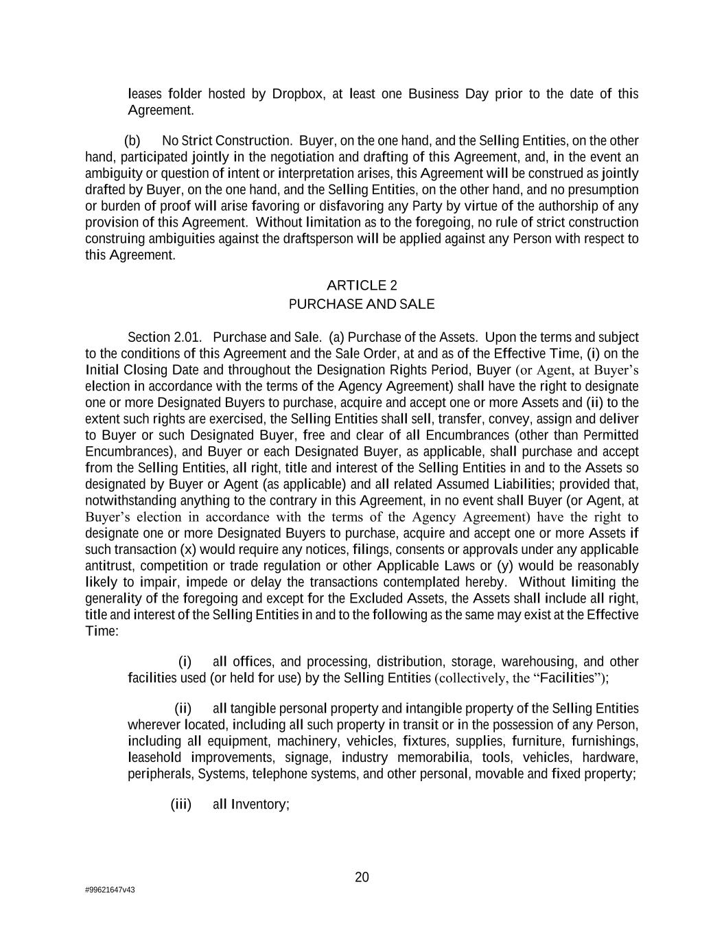 20 #99621647v43 leases folder hosted by Dropbox, at least one Business Day prior to the date of this Agreement. (b) No Strict Construction. Buyer, on the one hand, and the Selling Entities, on the other hand, participated jointly in the negotiation and drafting of this Agreement, and, in the event an ambiguity or question of intent or interpretation arises, this Agreement will be construed as jointly drafted by Buyer, on the one hand, and the Selling Entities, on the other hand, and no presumption or burden of proof will arise favoring or disfavoring any Party by virtue of the authorship of any provision of this Agreement. Without limitation as to the foregoing, no rule of strict construction construing ambiguities against the draftsperson will be applied against any Person with respect to this Agreement. ARTICLE 2 PURCHASE AND SALE Section 2.01. Purchase and Sale. (a) Purchase of the Assets. Upon the terms and subject to the conditions of this Agreement and the Sale Order, at and as of the Effective Time, (i) on the Initial Closing Date and throughout the Designation Rights Period, Buyer (or Agent, at Buyer’s election in accordance with the terms of the Agency Agreement) shall have the right to designate one or more Designated Buyers to purchase, acquire and accept one or more Assets and (ii) to the extent such rights are exercised, the Selling Entities shall sell, transfer, convey, assign and deliver to Buyer or such Designated Buyer, free and clear of all Encumbrances (other than Permitted Encumbrances), and Buyer or each Designated Buyer, as applicable, shall purchase and accept from the Selling Entities, all right, title and interest of the Selling Entities in and to the Assets so designated by Buyer or Agent (as applicable) and all related Assumed Liabilities; provided that, notwithstanding anything to the contrary in this Agreement, in no event shall Buyer (or Agent, at Buyer’s election in accordance with the terms of the Agency Agreement) have the right to designate one or more Designated Buyers to purchase, acquire and accept one or more Assets if such transaction (x) would require any notices, filings, consents or approvals under any applicable antitrust, competition or trade regulation or other Applicable Laws or (y) would be reasonably likely to impair, impede or delay the transactions contemplated hereby. Without limiting the generality of the foregoing and except for the Excluded Assets, the Assets shall include all right, title and interest of the Selling Entities in and to the following as the same may exist at the Effective Time: (i) all offices, and processing, distribution, storage, warehousing, and other facilities used (or held for use) by the Selling Entities (collectively, the “Facilities”); (ii) all tangible personal property and intangible property of the Selling Entities wherever located, including all such property in transit or in the possession of any Person, including all equipment, machinery, vehicles, fixtures, supplies, furniture, furnishings, leasehold improvements, signage, industry memorabilia, tools, vehicles, hardware, peripherals, Systems, telephone systems, and other personal, movable and fixed property; (iii) all Inventory;
