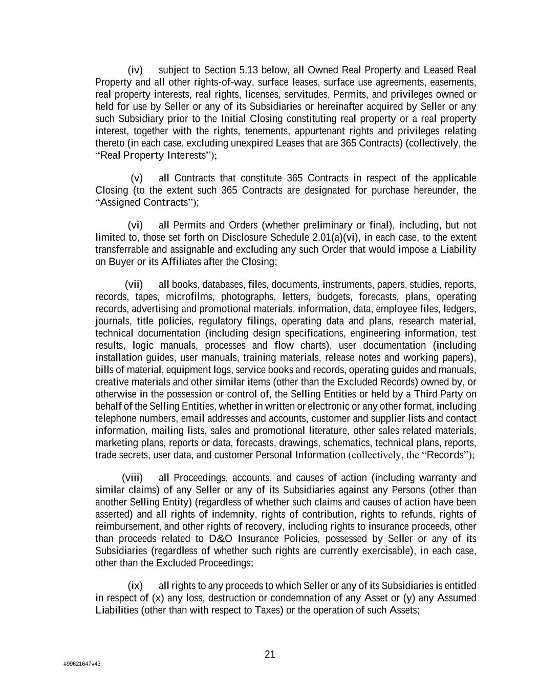 21 #99621647v43 (iv) subject to Section 5.13 below, all Owned Real Property and Leased Real Property and all other rights-of-way, surface leases, surface use agreements, easements, real property interests, real rights, licenses, servitudes, Permits, and privileges owned or held for use by Seller or any of its Subsidiaries or hereinafter acquired by Seller or any such Subsidiary prior to the Initial Closing constituting real property or a real property interest, together with the rights, tenements, appurtenant rights and privileges relating thereto (in each case, excluding unexpired Leases that are 365 Contracts) (collectively, the “Real Property Interests”); (v) all Contracts that constitute 365 Contracts in respect of the applicable Closing (to the extent such 365 Contracts are designated for purchase hereunder, the “Assigned Contracts”); (vi) all Permits and Orders (whether preliminary or final), including, but not limited to, those set forth on Disclosure Schedule 2.01(a)(vi), in each case, to the extent transferrable and assignable and excluding any such Order that would impose a Liability on Buyer or its Affiliates after the Closing; (vii) all books, databases, files, documents, instruments, papers, studies, reports, records, tapes, microfilms, photographs, letters, budgets, forecasts, plans, operating records, advertising and promotional materials, information, data, employee files, ledgers, journals, title policies, regulatory filings, operating data and plans, research material, technical documentation (including design specifications, engineering information, test results, logic manuals, processes and flow charts), user documentation (including installation guides, user manuals, training materials, release notes and working papers), bills of material, equipment logs, service books and records, operating guides and manuals, creative materials and other similar items (other than the Excluded Records) owned by, or otherwise in the possession or control of, the Selling Entities or held by a Third Party on behalf of the Selling Entities, whether in written or electronic or any other format, including telephone numbers, email addresses and accounts, customer and supplier lists and contact information, mailing lists, sales and promotional literature, other sales related materials, marketing plans, reports or data, forecasts, drawings, schematics, technical plans, reports, trade secrets, user data, and customer Personal Information (collectively, the “Records”); (viii) all Proceedings, accounts, and causes of action (including warranty and similar claims) of any Seller or any of its Subsidiaries against any Persons (other than another Selling Entity) (regardless of whether such claims and causes of action have been asserted) and all rights of indemnity, rights of contribution, rights to refunds, rights of reimbursement, and other rights of recovery, including rights to insurance proceeds, other than proceeds related to D&O Insurance Policies, possessed by Seller or any of its Subsidiaries (regardless of whether such rights are currently exercisable), in each case, other than the Excluded Proceedings; (ix) all rights to any proceeds to which Seller or any of its Subsidiaries is entitled in respect of (x) any loss, destruction or condemnation of any Asset or (y) any Assumed Liabilities (other than with respect to Taxes) or the operation of such Assets;