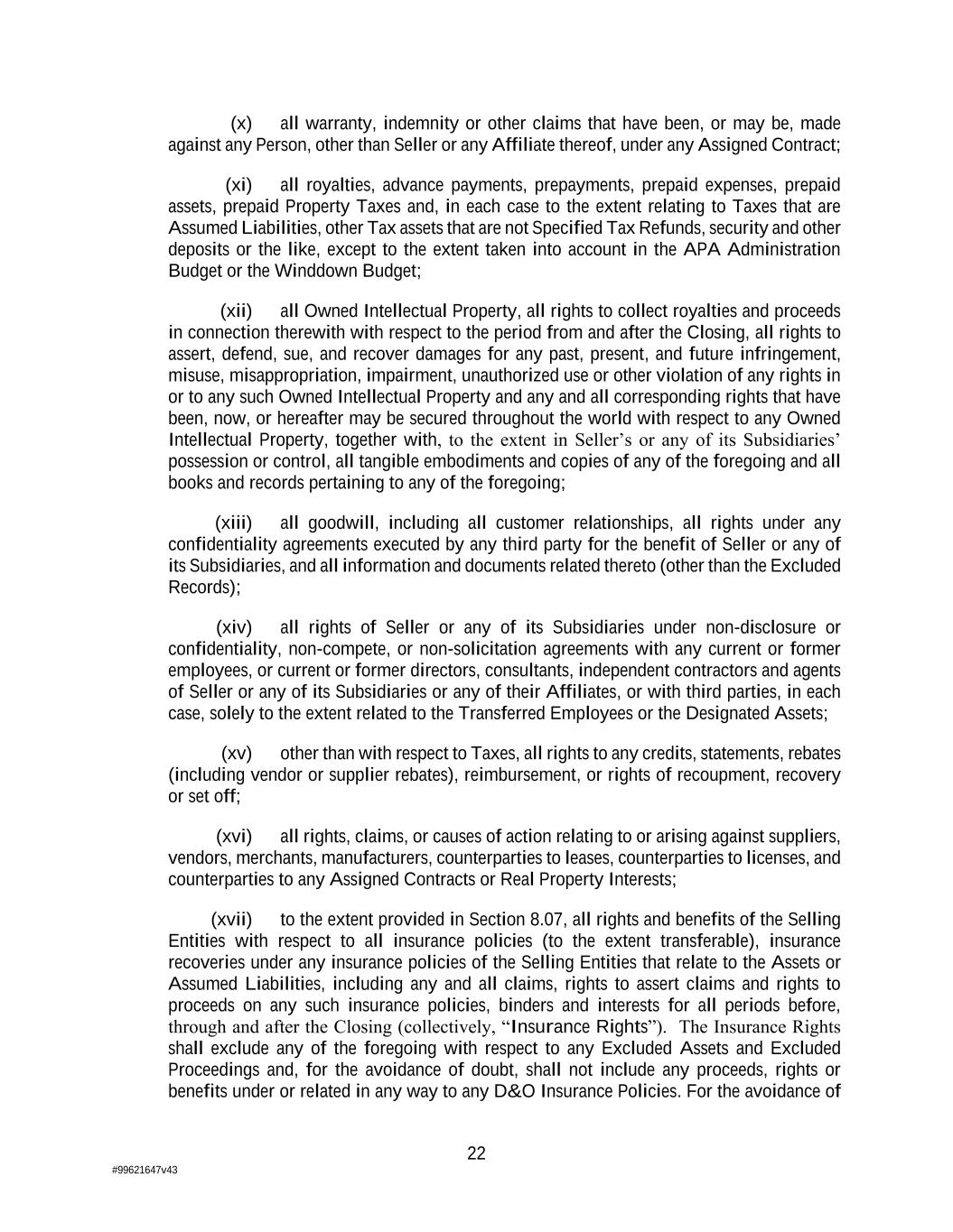22 #99621647v43 (x) all warranty, indemnity or other claims that have been, or may be, made against any Person, other than Seller or any Affiliate thereof, under any Assigned Contract; (xi) all royalties, advance payments, prepayments, prepaid expenses, prepaid assets, prepaid Property Taxes and, in each case to the extent relating to Taxes that are Assumed Liabilities, other Tax assets that are not Specified Tax Refunds, security and other deposits or the like, except to the extent taken into account in the APA Administration Budget or the Winddown Budget; (xii) all Owned Intellectual Property, all rights to collect royalties and proceeds in connection therewith with respect to the period from and after the Closing, all rights to assert, defend, sue, and recover damages for any past, present, and future infringement, misuse, misappropriation, impairment, unauthorized use or other violation of any rights in or to any such Owned Intellectual Property and any and all corresponding rights that have been, now, or hereafter may be secured throughout the world with respect to any Owned Intellectual Property, together with, to the extent in Seller’s or any of its Subsidiaries’ possession or control, all tangible embodiments and copies of any of the foregoing and all books and records pertaining to any of the foregoing; (xiii) all goodwill, including all customer relationships, all rights under any confidentiality agreements executed by any third party for the benefit of Seller or any of its Subsidiaries, and all information and documents related thereto (other than the Excluded Records); (xiv) all rights of Seller or any of its Subsidiaries under non-disclosure or confidentiality, non-compete, or non-solicitation agreements with any current or former employees, or current or former directors, consultants, independent contractors and agents of Seller or any of its Subsidiaries or any of their Affiliates, or with third parties, in each case, solely to the extent related to the Transferred Employees or the Designated Assets; (xv) other than with respect to Taxes, all rights to any credits, statements, rebates (including vendor or supplier rebates), reimbursement, or rights of recoupment, recovery or set off; (xvi) all rights, claims, or causes of action relating to or arising against suppliers, vendors, merchants, manufacturers, counterparties to leases, counterparties to licenses, and counterparties to any Assigned Contracts or Real Property Interests; (xvii) to the extent provided in Section 8.07, all rights and benefits of the Selling Entities with respect to all insurance policies (to the extent transferable), insurance recoveries under any insurance policies of the Selling Entities that relate to the Assets or Assumed Liabilities, including any and all claims, rights to assert claims and rights to proceeds on any such insurance policies, binders and interests for all periods before, through and after the Closing (collectively, “Insurance Rights”). The Insurance Rights shall exclude any of the foregoing with respect to any Excluded Assets and Excluded Proceedings and, for the avoidance of doubt, shall not include any proceeds, rights or benefits under or related in any way to any D&O Insurance Policies. For the avoidance of
