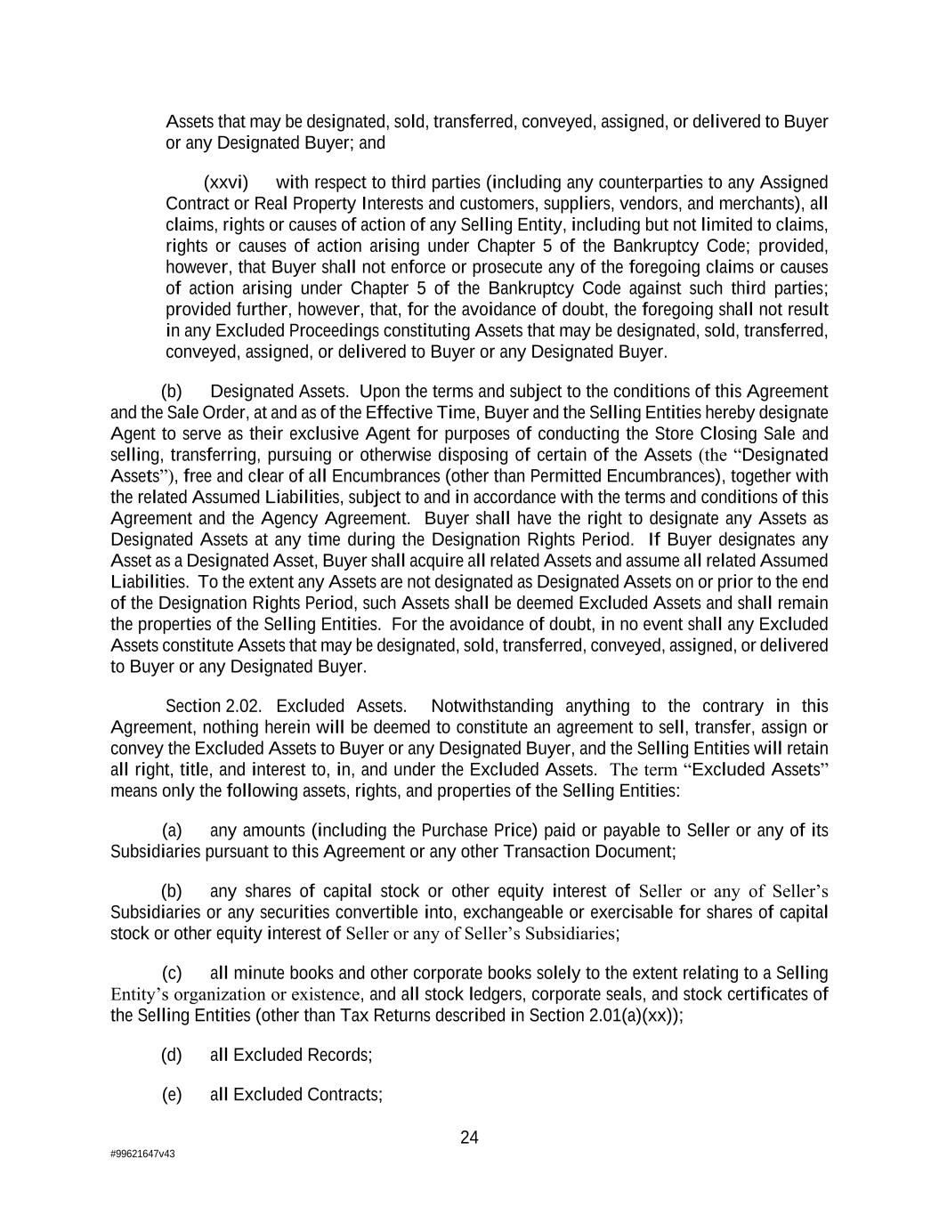24 #99621647v43 Assets that may be designated, sold, transferred, conveyed, assigned, or delivered to Buyer or any Designated Buyer; and (xxvi) with respect to third parties (including any counterparties to any Assigned Contract or Real Property Interests and customers, suppliers, vendors, and merchants), all claims, rights or causes of action of any Selling Entity, including but not limited to claims, rights or causes of action arising under Chapter 5 of the Bankruptcy Code; provided, however, that Buyer shall not enforce or prosecute any of the foregoing claims or causes of action arising under Chapter 5 of the Bankruptcy Code against such third parties; provided further, however, that, for the avoidance of doubt, the foregoing shall not result in any Excluded Proceedings constituting Assets that may be designated, sold, transferred, conveyed, assigned, or delivered to Buyer or any Designated Buyer. (b) Designated Assets. Upon the terms and subject to the conditions of this Agreement and the Sale Order, at and as of the Effective Time, Buyer and the Selling Entities hereby designate Agent to serve as their exclusive Agent for purposes of conducting the Store Closing Sale and selling, transferring, pursuing or otherwise disposing of certain of the Assets (the “Designated Assets”), free and clear of all Encumbrances (other than Permitted Encumbrances), together with the related Assumed Liabilities, subject to and in accordance with the terms and conditions of this Agreement and the Agency Agreement. Buyer shall have the right to designate any Assets as Designated Assets at any time during the Designation Rights Period. If Buyer designates any Asset as a Designated Asset, Buyer shall acquire all related Assets and assume all related Assumed Liabilities. To the extent any Assets are not designated as Designated Assets on or prior to the end of the Designation Rights Period, such Assets shall be deemed Excluded Assets and shall remain the properties of the Selling Entities. For the avoidance of doubt, in no event shall any Excluded Assets constitute Assets that may be designated, sold, transferred, conveyed, assigned, or delivered to Buyer or any Designated Buyer. Section 2.02. Excluded Assets. Notwithstanding anything to the contrary in this Agreement, nothing herein will be deemed to constitute an agreement to sell, transfer, assign or convey the Excluded Assets to Buyer or any Designated Buyer, and the Selling Entities will retain all right, title, and interest to, in, and under the Excluded Assets. The term “Excluded Assets” means only the following assets, rights, and properties of the Selling Entities: (a) any amounts (including the Purchase Price) paid or payable to Seller or any of its Subsidiaries pursuant to this Agreement or any other Transaction Document; (b) any shares of capital stock or other equity interest of Seller or any of Seller’s Subsidiaries or any securities convertible into, exchangeable or exercisable for shares of capital stock or other equity interest of Seller or any of Seller’s Subsidiaries; (c) all minute books and other corporate books solely to the extent relating to a Selling Entity’s organization or existence, and all stock ledgers, corporate seals, and stock certificates of the Selling Entities (other than Tax Returns described in Section 2.01(a)(xx)); (d) all Excluded Records; (e) all Excluded Contracts;