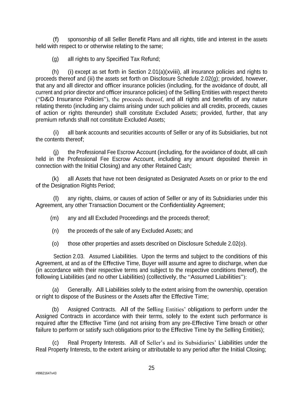 25 #99621647v43 (f) sponsorship of all Seller Benefit Plans and all rights, title and interest in the assets held with respect to or otherwise relating to the same; (g) all rights to any Specified Tax Refund; (h) (i) except as set forth in Section 2.01(a)(xviii), all insurance policies and rights to proceeds thereof and (ii) the assets set forth on Disclosure Schedule 2.02(g); provided, however, that any and all director and officer insurance policies (including, for the avoidance of doubt, all current and prior director and officer insurance policies) of the Selling Entities with respect thereto (“D&O Insurance Policies”), the proceeds thereof, and all rights and benefits of any nature relating thereto (including any claims arising under such policies and all credits, proceeds, causes of action or rights thereunder) shall constitute Excluded Assets; provided, further, that any premium refunds shall not constitute Excluded Assets; (i) all bank accounts and securities accounts of Seller or any of its Subsidiaries, but not the contents thereof; (j) the Professional Fee Escrow Account (including, for the avoidance of doubt, all cash held in the Professional Fee Escrow Account, including any amount deposited therein in connection with the Initial Closing) and any other Retained Cash; (k) all Assets that have not been designated as Designated Assets on or prior to the end of the Designation Rights Period; (l) any rights, claims, or causes of action of Seller or any of its Subsidiaries under this Agreement, any other Transaction Document or the Confidentiality Agreement; (m) any and all Excluded Proceedings and the proceeds thereof; (n) the proceeds of the sale of any Excluded Assets; and (o) those other properties and assets described on Disclosure Schedule 2.02(o). Section 2.03. Assumed Liabilities. Upon the terms and subject to the conditions of this Agreement, at and as of the Effective Time, Buyer will assume and agree to discharge, when due (in accordance with their respective terms and subject to the respective conditions thereof), the following Liabilities (and no other Liabilities) (collectively, the “Assumed Liabilities”): (a) Generally. All Liabilities solely to the extent arising from the ownership, operation or right to dispose of the Business or the Assets after the Effective Time; (b) Assigned Contracts. All of the Selling Entities’ obligations to perform under the Assigned Contracts in accordance with their terms, solely to the extent such performance is required after the Effective Time (and not arising from any pre-Effective Time breach or other failure to perform or satisfy such obligations prior to the Effective Time by the Selling Entities); (c) Real Property Interests. All of Seller’s and its Subsidiaries’ Liabilities under the Real Property Interests, to the extent arising or attributable to any period after the Initial Closing;