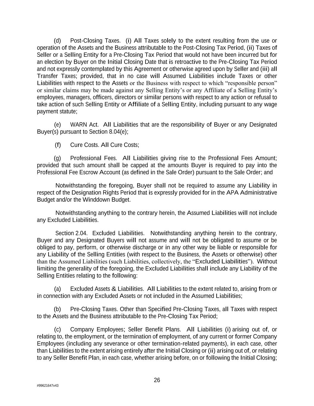 26 #99621647v43 (d) Post-Closing Taxes. (i) All Taxes solely to the extent resulting from the use or operation of the Assets and the Business attributable to the Post-Closing Tax Period, (ii) Taxes of Seller or a Selling Entity for a Pre-Closing Tax Period that would not have been incurred but for an election by Buyer on the Initial Closing Date that is retroactive to the Pre-Closing Tax Period and not expressly contemplated by this Agreement or otherwise agreed upon by Seller and (iii) all Transfer Taxes; provided, that in no case will Assumed Liabilities include Taxes or other Liabilities with respect to the Assets or the Business with respect to which “responsible person” or similar claims may be made against any Selling Entity’s or any Affiliate of a Selling Entity’s employees, managers, officers, directors or similar persons with respect to any action or refusal to take action of such Selling Entity or Affiliate of a Selling Entity, including pursuant to any wage payment statute; (e) WARN Act. All Liabilities that are the responsibility of Buyer or any Designated Buyer(s) pursuant to Section 8.04(e); (f) Cure Costs. All Cure Costs; (g) Professional Fees. All Liabilities giving rise to the Professional Fees Amount; provided that such amount shall be capped at the amounts Buyer is required to pay into the Professional Fee Escrow Account (as defined in the Sale Order) pursuant to the Sale Order; and Notwithstanding the foregoing, Buyer shall not be required to assume any Liability in respect of the Designation Rights Period that is expressly provided for in the APA Administrative Budget and/or the Winddown Budget. Notwithstanding anything to the contrary herein, the Assumed Liabilities will not include any Excluded Liabilities. Section 2.04. Excluded Liabilities. Notwithstanding anything herein to the contrary, Buyer and any Designated Buyers will not assume and will not be obligated to assume or be obliged to pay, perform, or otherwise discharge or in any other way be liable or responsible for any Liability of the Selling Entities (with respect to the Business, the Assets or otherwise) other than the Assumed Liabilities (such Liabilities, collectively, the “Excluded Liabilities”). Without limiting the generality of the foregoing, the Excluded Liabilities shall include any Liability of the Selling Entities relating to the following: (a) Excluded Assets & Liabilities. All Liabilities to the extent related to, arising from or in connection with any Excluded Assets or not included in the Assumed Liabilities; (b) Pre-Closing Taxes. Other than Specified Pre-Closing Taxes, all Taxes with respect to the Assets and the Business attributable to the Pre-Closing Tax Period; (c) Company Employees; Seller Benefit Plans. All Liabilities (i) arising out of, or relating to, the employment, or the termination of employment, of any current or former Company Employees (including any severance or other termination-related payments), in each case, other than Liabilities to the extent arising entirely after the Initial Closing or (ii) arising out of, or relating to any Seller Benefit Plan, in each case, whether arising before, on or following the Initial Closing;