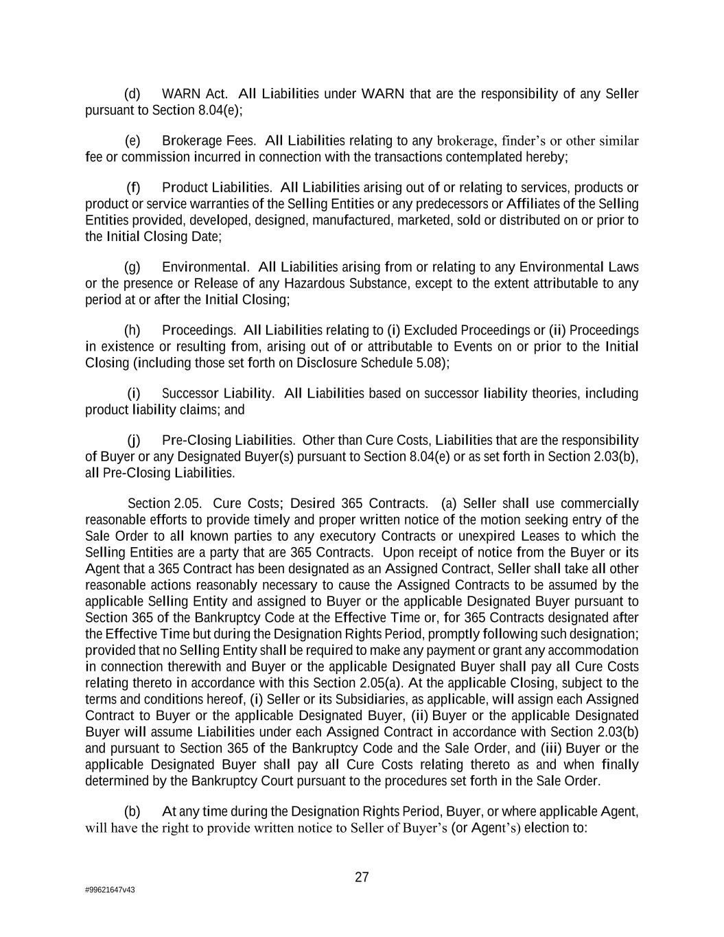 27 #99621647v43 (d) WARN Act. All Liabilities under WARN that are the responsibility of any Seller pursuant to Section 8.04(e); (e) Brokerage Fees. All Liabilities relating to any brokerage, finder’s or other similar fee or commission incurred in connection with the transactions contemplated hereby; (f) Product Liabilities. All Liabilities arising out of or relating to services, products or product or service warranties of the Selling Entities or any predecessors or Affiliates of the Selling Entities provided, developed, designed, manufactured, marketed, sold or distributed on or prior to the Initial Closing Date; (g) Environmental. All Liabilities arising from or relating to any Environmental Laws or the presence or Release of any Hazardous Substance, except to the extent attributable to any period at or after the Initial Closing; (h) Proceedings. All Liabilities relating to (i) Excluded Proceedings or (ii) Proceedings in existence or resulting from, arising out of or attributable to Events on or prior to the Initial Closing (including those set forth on Disclosure Schedule 5.08); (i) Successor Liability. All Liabilities based on successor liability theories, including product liability claims; and (j) Pre-Closing Liabilities. Other than Cure Costs, Liabilities that are the responsibility of Buyer or any Designated Buyer(s) pursuant to Section 8.04(e) or as set forth in Section 2.03(b), all Pre-Closing Liabilities. Section 2.05. Cure Costs; Desired 365 Contracts. (a) Seller shall use commercially reasonable efforts to provide timely and proper written notice of the motion seeking entry of the Sale Order to all known parties to any executory Contracts or unexpired Leases to which the Selling Entities are a party that are 365 Contracts. Upon receipt of notice from the Buyer or its Agent that a 365 Contract has been designated as an Assigned Contract, Seller shall take all other reasonable actions reasonably necessary to cause the Assigned Contracts to be assumed by the applicable Selling Entity and assigned to Buyer or the applicable Designated Buyer pursuant to Section 365 of the Bankruptcy Code at the Effective Time or, for 365 Contracts designated after the Effective Time but during the Designation Rights Period, promptly following such designation; provided that no Selling Entity shall be required to make any payment or grant any accommodation in connection therewith and Buyer or the applicable Designated Buyer shall pay all Cure Costs relating thereto in accordance with this Section 2.05(a). At the applicable Closing, subject to the terms and conditions hereof, (i) Seller or its Subsidiaries, as applicable, will assign each Assigned Contract to Buyer or the applicable Designated Buyer, (ii) Buyer or the applicable Designated Buyer will assume Liabilities under each Assigned Contract in accordance with Section 2.03(b) and pursuant to Section 365 of the Bankruptcy Code and the Sale Order, and (iii) Buyer or the applicable Designated Buyer shall pay all Cure Costs relating thereto as and when finally determined by the Bankruptcy Court pursuant to the procedures set forth in the Sale Order. (b) At any time during the Designation Rights Period, Buyer, or where applicable Agent, will have the right to provide written notice to Seller of Buyer’s (or Agent’s) election to: