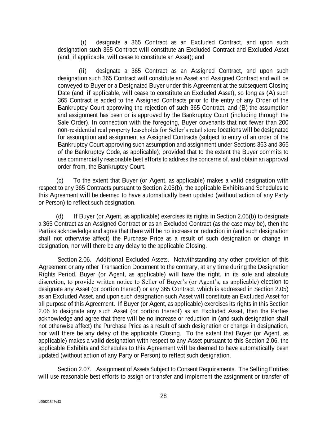 28 #99621647v43 (i) designate a 365 Contract as an Excluded Contract, and upon such designation such 365 Contract will constitute an Excluded Contract and Excluded Asset (and, if applicable, will cease to constitute an Asset); and (ii) designate a 365 Contract as an Assigned Contract, and upon such designation such 365 Contract will constitute an Asset and Assigned Contract and will be conveyed to Buyer or a Designated Buyer under this Agreement at the subsequent Closing Date (and, if applicable, will cease to constitute an Excluded Asset), so long as (A) such 365 Contract is added to the Assigned Contracts prior to the entry of any Order of the Bankruptcy Court approving the rejection of such 365 Contract, and (B) the assumption and assignment has been or is approved by the Bankruptcy Court (including through the Sale Order). In connection with the foregoing, Buyer covenants that not fewer than 200 non-residential real property leaseholds for Seller’s retail store locations will be designated for assumption and assignment as Assigned Contracts (subject to entry of an order of the Bankruptcy Court approving such assumption and assignment under Sections 363 and 365 of the Bankruptcy Code, as applicable); provided that to the extent the Buyer commits to use commercially reasonable best efforts to address the concerns of, and obtain an approval order from, the Bankruptcy Court. (c) To the extent that Buyer (or Agent, as applicable) makes a valid designation with respect to any 365 Contracts pursuant to Section 2.05(b), the applicable Exhibits and Schedules to this Agreement will be deemed to have automatically been updated (without action of any Party or Person) to reflect such designation. (d) If Buyer (or Agent, as applicable) exercises its rights in Section 2.05(b) to designate a 365 Contract as an Assigned Contract or as an Excluded Contract (as the case may be), then the Parties acknowledge and agree that there will be no increase or reduction in (and such designation shall not otherwise affect) the Purchase Price as a result of such designation or change in designation, nor will there be any delay to the applicable Closing. Section 2.06. Additional Excluded Assets. Notwithstanding any other provision of this Agreement or any other Transaction Document to the contrary, at any time during the Designation Rights Period, Buyer (or Agent, as applicable) will have the right, in its sole and absolute discretion, to provide written notice to Seller of Buyer’s (or Agent’s, as applicable) election to designate any Asset (or portion thereof) or any 365 Contract, which is addressed in Section 2.05) as an Excluded Asset, and upon such designation such Asset will constitute an Excluded Asset for all purpose of this Agreement. If Buyer (or Agent, as applicable) exercises its rights in this Section 2.06 to designate any such Asset (or portion thereof) as an Excluded Asset, then the Parties acknowledge and agree that there will be no increase or reduction in (and such designation shall not otherwise affect) the Purchase Price as a result of such designation or change in designation, nor will there be any delay of the applicable Closing. To the extent that Buyer (or Agent, as applicable) makes a valid designation with respect to any Asset pursuant to this Section 2.06, the applicable Exhibits and Schedules to this Agreement will be deemed to have automatically been updated (without action of any Party or Person) to reflect such designation. Section 2.07. Assignment of Assets Subject to Consent Requirements. The Selling Entities will use reasonable best efforts to assign or transfer and implement the assignment or transfer of