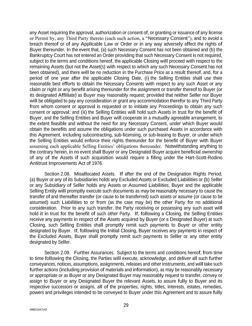 29 #99621647v43 any Asset requiring the approval, authorization or consent of, or granting or issuance of any license or Permit by, any Third Party thereto (each such action, a “Necessary Consent”), and to avoid a breach thereof or of any Applicable Law or Order or in any way adversely affect the rights of Buyer thereunder. In the event that, (a) such Necessary Consent has not been obtained and (b) the Bankruptcy Court has not entered an Order providing that such Necessary Consent is not required, subject to the terms and conditions hereof, the applicable Closing will proceed with respect to the remaining Assets (but not the Asset(s) with respect to which any such Necessary Consent has not been obtained), and there will be no reduction in the Purchase Price as a result thereof, and, for a period of one year after the applicable Closing Date, (i) the Selling Entities shall use their reasonable best efforts to obtain the Necessary Consents with respect to any such Asset or any claim or right or any benefit arising thereunder for the assignment or transfer thereof to Buyer (or its designated Affiliate) as Buyer may reasonably request; provided that neither Seller nor Buyer will be obligated to pay any consideration or grant any accommodation therefor to any Third Party from whom consent or approval is requested or to initiate any Proceedings to obtain any such consent or approval; and (ii) the Selling Entities will hold such Assets in trust for the benefit of Buyer, and the Selling Entities and Buyer will cooperate in a mutually agreeable arrangement, to the extent feasible and without the need for any Necessary Consent, under which Buyer would obtain the benefits and assume the obligations under such purchased Assets in accordance with this Agreement, including subcontracting, sub-licensing, or sub-leasing to Buyer, or under which the Selling Entities would enforce their rights thereunder for the benefit of Buyer with Buyer assuming each applicable Selling Entities’ obligations thereunder. Notwithstanding anything to the contrary herein, in no event shall Buyer or any Designated Buyer acquire beneficial ownership of any of the Assets if such acquisition would require a filing under the Hart-Scott-Rodino Antitrust Improvements Act of 1976. Section 2.08. Misallocated Assets. If after the end of the Designation Rights Period, (a) Buyer or any of its Subsidiaries holds any Excluded Assets or Excluded Liabilities or (b) Seller or any Subsidiary of Seller holds any Assets or Assumed Liabilities, Buyer and the applicable Selling Entity will promptly execute such documents as may be reasonably necessary to cause the transfer of and thereafter transfer (or cause to be transferred) such assets or assume (or cause to be assumed) such Liabilities to or from (as the case may be) the other Party for no additional consideration. Prior to any such transfer, the Party receiving or possessing any such asset will hold it in trust for the benefit of such other Party. If, following a Closing, the Selling Entities receive any payments in respect of the Assets acquired by Buyer (or a Designated Buyer) at such Closing, such Selling Entities shall promptly remit such payments to Buyer or other entity designated by Buyer. If, following the Initial Closing, Buyer receives any payments in respect of the Excluded Assets, Buyer shall promptly remit such payments to Seller or any other entity designated by Seller. Section 2.09. Further Assurances. Subject to the terms and conditions hereof, from time to time following the Closing, the Parties will execute, acknowledge, and deliver all such further conveyances, notices, assumptions, assignments, releases and other instruments, and will take such further actions (including provision of materials and information), as may be reasonably necessary or appropriate or as Buyer or any Designated Buyer may reasonably request to transfer, convey or assign to Buyer or any Designated Buyer the relevant Assets, to assure fully to Buyer and its respective successors or assigns, all of the properties, rights, titles, interests, estates, remedies, powers and privileges intended to be conveyed to Buyer under this Agreement and to assure fully
