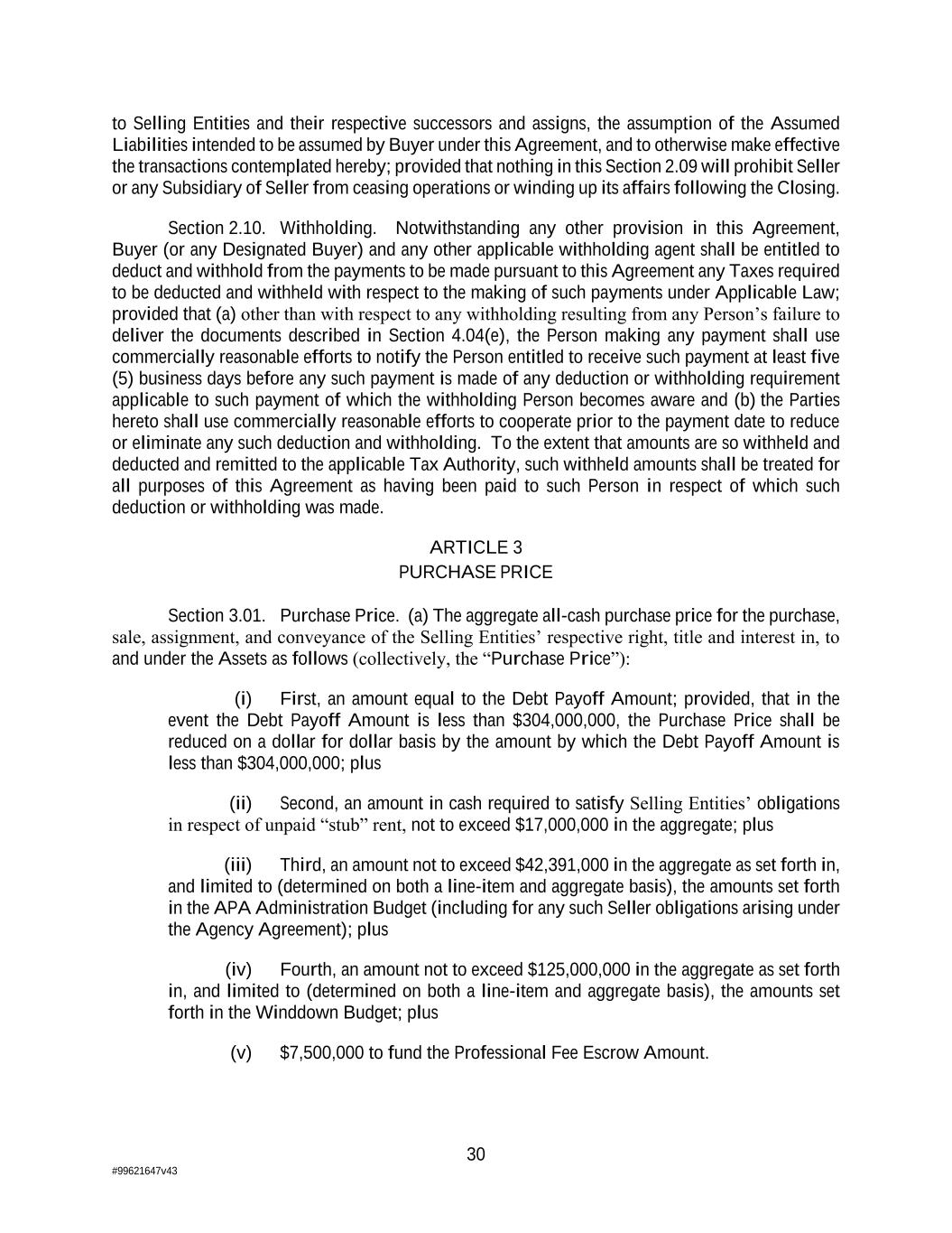 30 #99621647v43 to Selling Entities and their respective successors and assigns, the assumption of the Assumed Liabilities intended to be assumed by Buyer under this Agreement, and to otherwise make effective the transactions contemplated hereby; provided that nothing in this Section 2.09 will prohibit Seller or any Subsidiary of Seller from ceasing operations or winding up its affairs following the Closing. Section 2.10. Withholding. Notwithstanding any other provision in this Agreement, Buyer (or any Designated Buyer) and any other applicable withholding agent shall be entitled to deduct and withhold from the payments to be made pursuant to this Agreement any Taxes required to be deducted and withheld with respect to the making of such payments under Applicable Law; provided that (a) other than with respect to any withholding resulting from any Person’s failure to deliver the documents described in Section 4.04(e), the Person making any payment shall use commercially reasonable efforts to notify the Person entitled to receive such payment at least five (5) business days before any such payment is made of any deduction or withholding requirement applicable to such payment of which the withholding Person becomes aware and (b) the Parties hereto shall use commercially reasonable efforts to cooperate prior to the payment date to reduce or eliminate any such deduction and withholding. To the extent that amounts are so withheld and deducted and remitted to the applicable Tax Authority, such withheld amounts shall be treated for all purposes of this Agreement as having been paid to such Person in respect of which such deduction or withholding was made. ARTICLE 3 PURCHASE PRICE Section 3.01. Purchase Price. (a) The aggregate all-cash purchase price for the purchase, sale, assignment, and conveyance of the Selling Entities’ respective right, title and interest in, to and under the Assets as follows (collectively, the “Purchase Price”): (i) First, an amount equal to the Debt Payoff Amount; provided, that in the event the Debt Payoff Amount is less than $304,000,000, the Purchase Price shall be reduced on a dollar for dollar basis by the amount by which the Debt Payoff Amount is less than $304,000,000; plus (ii) Second, an amount in cash required to satisfy Selling Entities’ obligations in respect of unpaid “stub” rent, not to exceed $17,000,000 in the aggregate; plus (iii) Third, an amount not to exceed $42,391,000 in the aggregate as set forth in, and limited to (determined on both a line-item and aggregate basis), the amounts set forth in the APA Administration Budget (including for any such Seller obligations arising under the Agency Agreement); plus (iv) Fourth, an amount not to exceed $125,000,000 in the aggregate as set forth in, and limited to (determined on both a line-item and aggregate basis), the amounts set forth in the Winddown Budget; plus (v) $7,500,000 to fund the Professional Fee Escrow Amount.