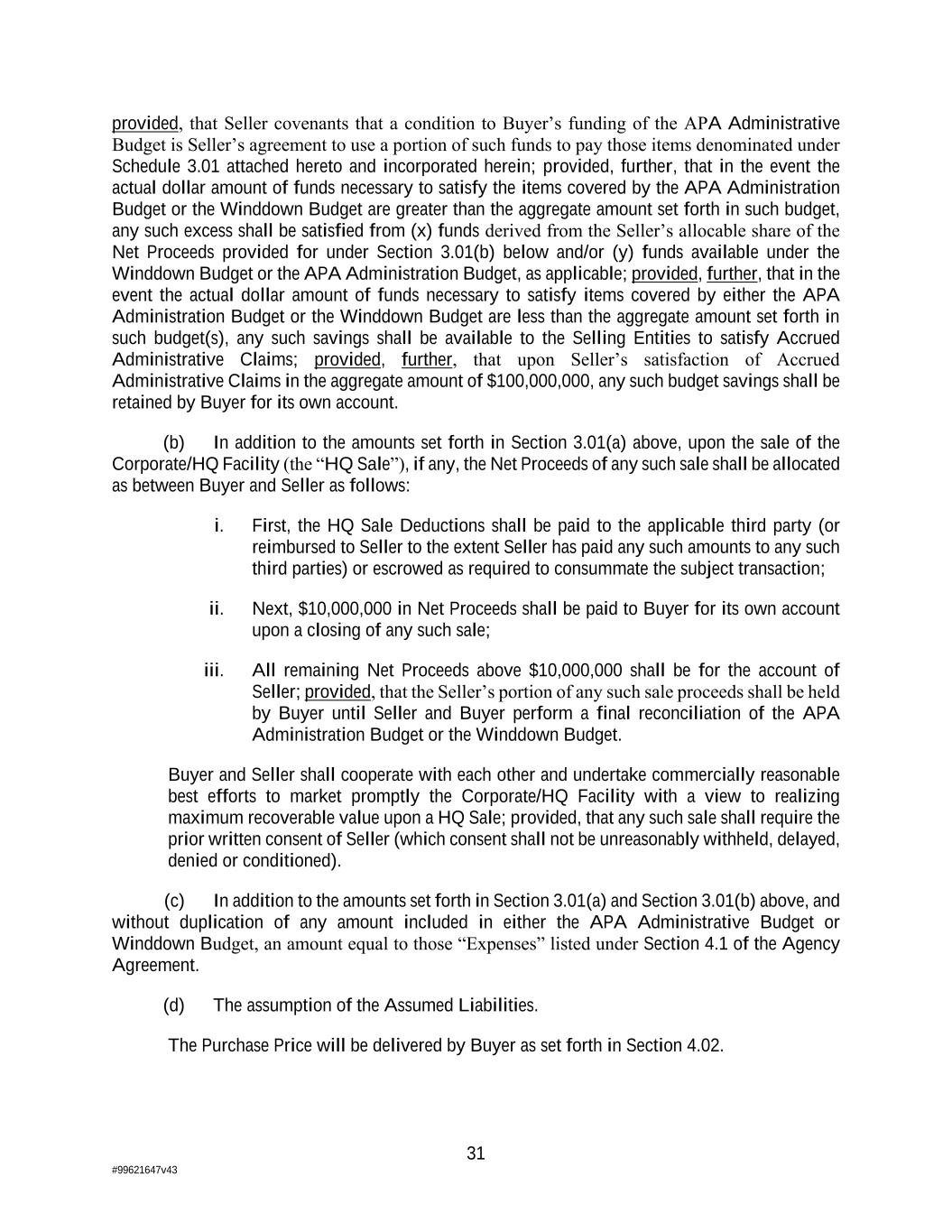 31 #99621647v43 provided, that Seller covenants that a condition to Buyer’s funding of the APA Administrative Budget is Seller’s agreement to use a portion of such funds to pay those items denominated under Schedule 3.01 attached hereto and incorporated herein; provided, further, that in the event the actual dollar amount of funds necessary to satisfy the items covered by the APA Administration Budget or the Winddown Budget are greater than the aggregate amount set forth in such budget, any such excess shall be satisfied from (x) funds derived from the Seller’s allocable share of the Net Proceeds provided for under Section 3.01(b) below and/or (y) funds available under the Winddown Budget or the APA Administration Budget, as applicable; provided, further, that in the event the actual dollar amount of funds necessary to satisfy items covered by either the APA Administration Budget or the Winddown Budget are less than the aggregate amount set forth in such budget(s), any such savings shall be available to the Selling Entities to satisfy Accrued Administrative Claims; provided, further, that upon Seller’s satisfaction of Accrued Administrative Claims in the aggregate amount of $100,000,000, any such budget savings shall be retained by Buyer for its own account. (b) In addition to the amounts set forth in Section 3.01(a) above, upon the sale of the Corporate/HQ Facility (the “HQ Sale”), if any, the Net Proceeds of any such sale shall be allocated as between Buyer and Seller as follows: i. First, the HQ Sale Deductions shall be paid to the applicable third party (or reimbursed to Seller to the extent Seller has paid any such amounts to any such third parties) or escrowed as required to consummate the subject transaction; ii. Next, $10,000,000 in Net Proceeds shall be paid to Buyer for its own account upon a closing of any such sale; iii. All remaining Net Proceeds above $10,000,000 shall be for the account of Seller; provided, that the Seller’s portion of any such sale proceeds shall be held by Buyer until Seller and Buyer perform a final reconciliation of the APA Administration Budget or the Winddown Budget. Buyer and Seller shall cooperate with each other and undertake commercially reasonable best efforts to market promptly the Corporate/HQ Facility with a view to realizing maximum recoverable value upon a HQ Sale; provided, that any such sale shall require the prior written consent of Seller (which consent shall not be unreasonably withheld, delayed, denied or conditioned). (c) In addition to the amounts set forth in Section 3.01(a) and Section 3.01(b) above, and without duplication of any amount included in either the APA Administrative Budget or Winddown Budget, an amount equal to those “Expenses” listed under Section 4.1 of the Agency Agreement. (d) The assumption of the Assumed Liabilities. The Purchase Price will be delivered by Buyer as set forth in Section 4.02.
