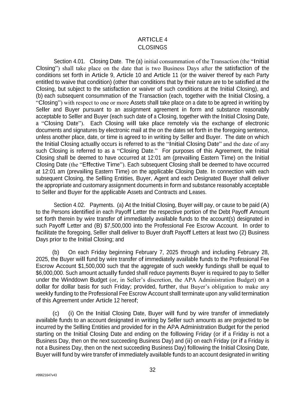 32 #99621647v43 ARTICLE 4 CLOSINGS Section 4.01. Closing Date. The (a) initial consummation of the Transaction (the “Initial Closing”) shall take place on the date that is two Business Days after the satisfaction of the conditions set forth in Article 9, Article 10 and Article 11 (or the waiver thereof by each Party entitled to waive that condition) (other than conditions that by their nature are to be satisfied at the Closing, but subject to the satisfaction or waiver of such conditions at the Initial Closing), and (b) each subsequent consummation of the Transaction (each, together with the Initial Closing, a “Closing”) with respect to one or more Assets shall take place on a date to be agreed in writing by Seller and Buyer pursuant to an assignment agreement in form and substance reasonably acceptable to Seller and Buyer (each such date of a Closing, together with the Initial Closing Date, a “Closing Date”). Each Closing will take place remotely via the exchange of electronic documents and signatures by electronic mail at the on the dates set forth in the foregoing sentence, unless another place, date, or time is agreed to in writing by Seller and Buyer. The date on which the Initial Closing actually occurs is referred to as the “Initial Closing Date” and the date of any such Closing is referred to as a “Closing Date.” For purposes of this Agreement, the Initial Closing shall be deemed to have occurred at 12:01 am (prevailing Eastern Time) on the Initial Closing Date (the “Effective Time”). Each subsequent Closing shall be deemed to have occurred at 12:01 am (prevailing Eastern Time) on the applicable Closing Date. In connection with each subsequent Closing, the Selling Entities, Buyer, Agent and each Designated Buyer shall deliver the appropriate and customary assignment documents in form and substance reasonably acceptable to Seller and Buyer for the applicable Assets and Contracts and Leases. Section 4.02. Payments. (a) At the Initial Closing, Buyer will pay, or cause to be paid (A) to the Persons identified in each Payoff Letter the respective portion of the Debt Payoff Amount set forth therein by wire transfer of immediately available funds to the account(s) designated in such Payoff Letter and (B) $7,500,000 into the Professional Fee Escrow Account. In order to facilitate the foregoing, Seller shall deliver to Buyer draft Payoff Letters at least two (2) Business Days prior to the Initial Closing; and (b) On each Friday beginning February 7, 2025 through and including February 28, 2025, the Buyer will fund by wire transfer of immediately available funds to the Professional Fee Escrow Account $1,500,000 such that the aggregate of such weekly fundings shall be equal to $6,000,000. Such amount actually funded shall reduce payments Buyer is required to pay to Seller under the Winddown Budget (or, in Seller’s discretion, the APA Administration Budget) on a dollar for dollar basis for such Friday; provided, further, that Buyer’s obligation to make any weekly funding to the Professional Fee Escrow Account shall terminate upon any valid termination of this Agreement under Article 12 hereof; (c) (i) On the Initial Closing Date, Buyer will fund by wire transfer of immediately available funds to an account designated in writing by Seller such amounts as are projected to be incurred by the Selling Entities and provided for in the APA Administration Budget for the period starting on the Initial Closing Date and ending on the following Friday (or if a Friday is not a Business Day, then on the next succeeding Business Day) and (ii) on each Friday (or if a Friday is not a Business Day, then on the next succeeding Business Day) following the Initial Closing Date, Buyer will fund by wire transfer of immediately available funds to an account designated in writing