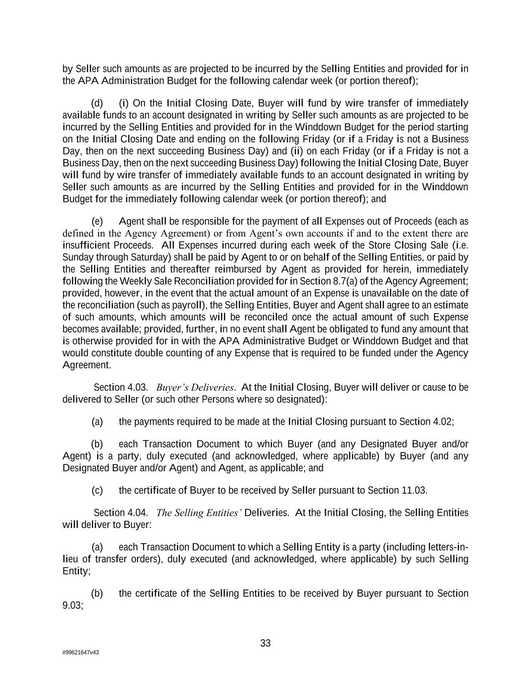 33 #99621647v43 by Seller such amounts as are projected to be incurred by the Selling Entities and provided for in the APA Administration Budget for the following calendar week (or portion thereof); (d) (i) On the Initial Closing Date, Buyer will fund by wire transfer of immediately available funds to an account designated in writing by Seller such amounts as are projected to be incurred by the Selling Entities and provided for in the Winddown Budget for the period starting on the Initial Closing Date and ending on the following Friday (or if a Friday is not a Business Day, then on the next succeeding Business Day) and (ii) on each Friday (or if a Friday is not a Business Day, then on the next succeeding Business Day) following the Initial Closing Date, Buyer will fund by wire transfer of immediately available funds to an account designated in writing by Seller such amounts as are incurred by the Selling Entities and provided for in the Winddown Budget for the immediately following calendar week (or portion thereof); and (e) Agent shall be responsible for the payment of all Expenses out of Proceeds (each as defined in the Agency Agreement) or from Agent’s own accounts if and to the extent there are insufficient Proceeds. All Expenses incurred during each week of the Store Closing Sale (i.e. Sunday through Saturday) shall be paid by Agent to or on behalf of the Selling Entities, or paid by the Selling Entities and thereafter reimbursed by Agent as provided for herein, immediately following the Weekly Sale Reconciliation provided for in Section 8.7(a) of the Agency Agreement; provided, however, in the event that the actual amount of an Expense is unavailable on the date of the reconciliation (such as payroll), the Selling Entities, Buyer and Agent shall agree to an estimate of such amounts, which amounts will be reconciled once the actual amount of such Expense becomes available; provided, further, in no event shall Agent be obligated to fund any amount that is otherwise provided for in with the APA Administrative Budget or Winddown Budget and that would constitute double counting of any Expense that is required to be funded under the Agency Agreement. Section 4.03. Buyer’s Deliveries. At the Initial Closing, Buyer will deliver or cause to be delivered to Seller (or such other Persons where so designated): (a) the payments required to be made at the Initial Closing pursuant to Section 4.02; (b) each Transaction Document to which Buyer (and any Designated Buyer and/or Agent) is a party, duly executed (and acknowledged, where applicable) by Buyer (and any Designated Buyer and/or Agent) and Agent, as applicable; and (c) the certificate of Buyer to be received by Seller pursuant to Section 11.03. Section 4.04. The Selling Entities’ Deliveries. At the Initial Closing, the Selling Entities will deliver to Buyer: (a) each Transaction Document to which a Selling Entity is a party (including letters-in- lieu of transfer orders), duly executed (and acknowledged, where applicable) by such Selling Entity; (b) the certificate of the Selling Entities to be received by Buyer pursuant to Section 9.03;