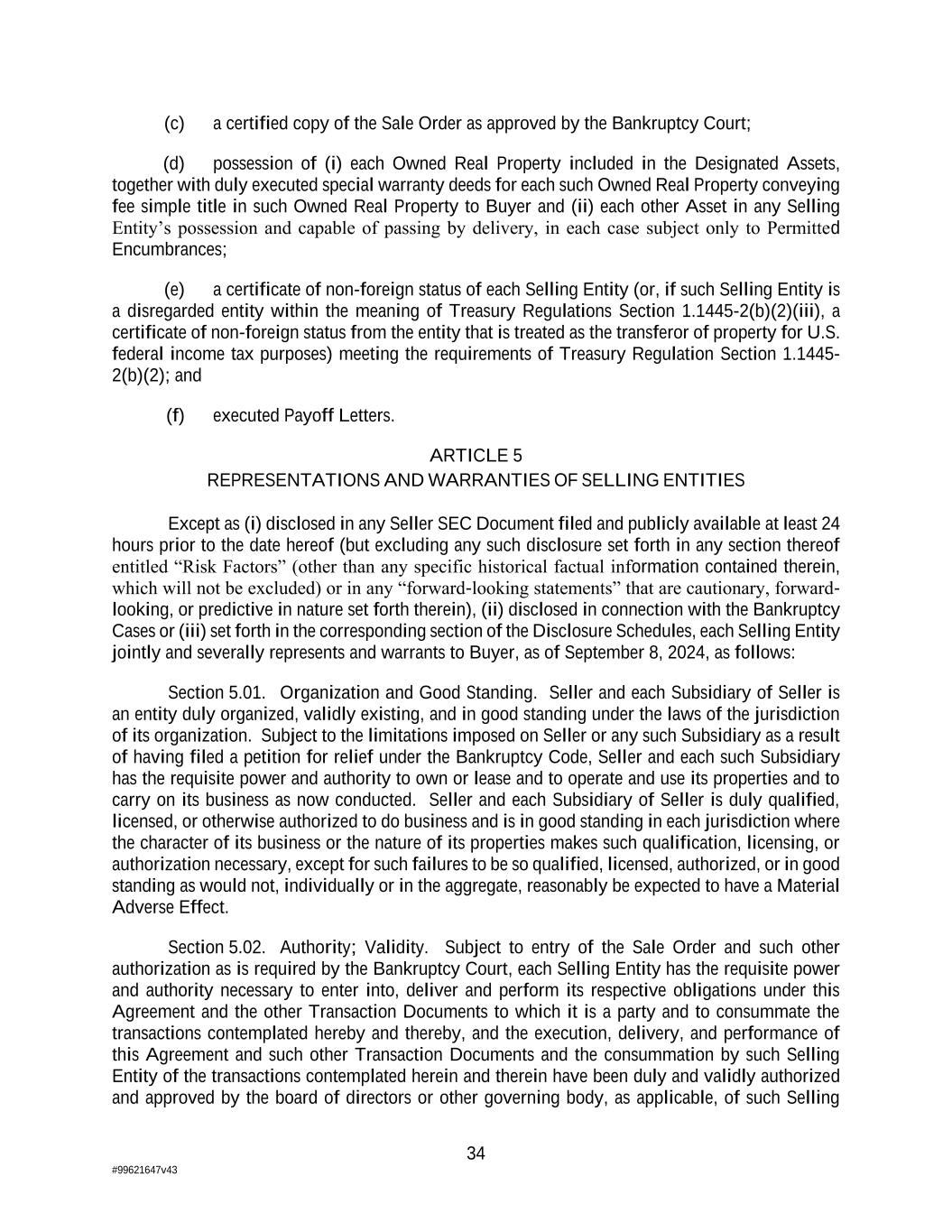 34 #99621647v43 (c) a certified copy of the Sale Order as approved by the Bankruptcy Court; (d) possession of (i) each Owned Real Property included in the Designated Assets, together with duly executed special warranty deeds for each such Owned Real Property conveying fee simple title in such Owned Real Property to Buyer and (ii) each other Asset in any Selling Entity’s possession and capable of passing by delivery, in each case subject only to Permitted Encumbrances; (e) a certificate of non-foreign status of each Selling Entity (or, if such Selling Entity is a disregarded entity within the meaning of Treasury Regulations Section 1.1445-2(b)(2)(iii), a certificate of non-foreign status from the entity that is treated as the transferor of property for U.S. federal income tax purposes) meeting the requirements of Treasury Regulation Section 1.1445- 2(b)(2); and (f) executed Payoff Letters. ARTICLE 5 REPRESENTATIONS AND WARRANTIES OF SELLING ENTITIES Except as (i) disclosed in any Seller SEC Document filed and publicly available at least 24 hours prior to the date hereof (but excluding any such disclosure set forth in any section thereof entitled “Risk Factors” (other than any specific historical factual information contained therein, which will not be excluded) or in any “forward-looking statements” that are cautionary, forward- looking, or predictive in nature set forth therein), (ii) disclosed in connection with the Bankruptcy Cases or (iii) set forth in the corresponding section of the Disclosure Schedules, each Selling Entity jointly and severally represents and warrants to Buyer, as of September 8, 2024, as follows: Section 5.01. Organization and Good Standing. Seller and each Subsidiary of Seller is an entity duly organized, validly existing, and in good standing under the laws of the jurisdiction of its organization. Subject to the limitations imposed on Seller or any such Subsidiary as a result of having filed a petition for relief under the Bankruptcy Code, Seller and each such Subsidiary has the requisite power and authority to own or lease and to operate and use its properties and to carry on its business as now conducted. Seller and each Subsidiary of Seller is duly qualified, licensed, or otherwise authorized to do business and is in good standing in each jurisdiction where the character of its business or the nature of its properties makes such qualification, licensing, or authorization necessary, except for such failures to be so qualified, licensed, authorized, or in good standing as would not, individually or in the aggregate, reasonably be expected to have a Material Adverse Effect. Section 5.02. Authority; Validity. Subject to entry of the Sale Order and such other authorization as is required by the Bankruptcy Court, each Selling Entity has the requisite power and authority necessary to enter into, deliver and perform its respective obligations under this Agreement and the other Transaction Documents to which it is a party and to consummate the transactions contemplated hereby and thereby, and the execution, delivery, and performance of this Agreement and such other Transaction Documents and the consummation by such Selling Entity of the transactions contemplated herein and therein have been duly and validly authorized and approved by the board of directors or other governing body, as applicable, of such Selling