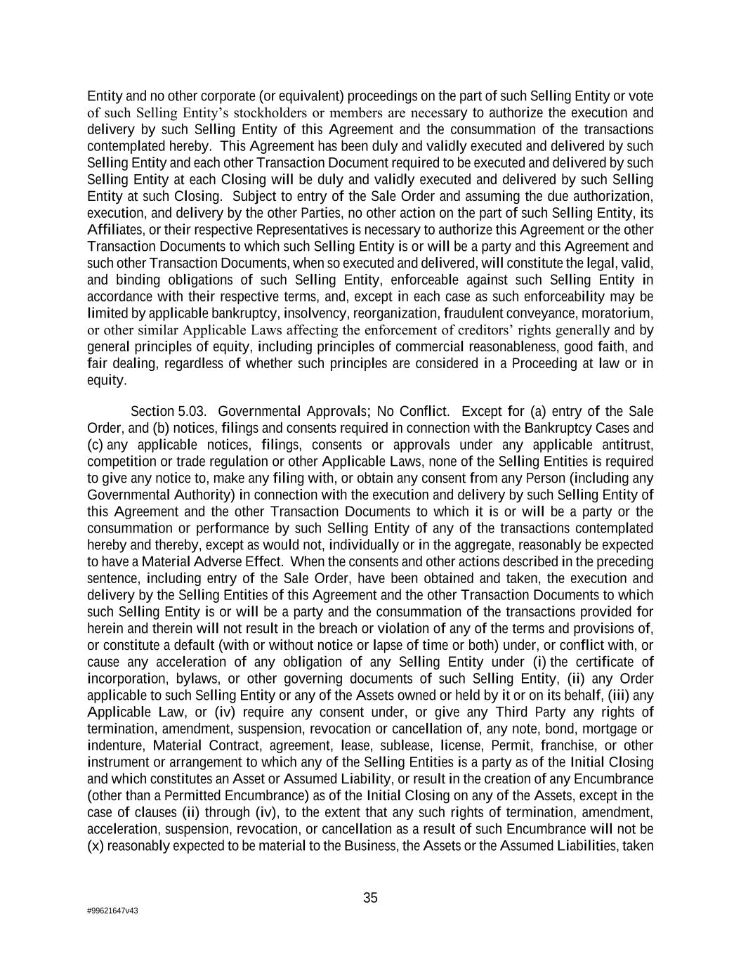 35 #99621647v43 Entity and no other corporate (or equivalent) proceedings on the part of such Selling Entity or vote of such Selling Entity’s stockholders or members are necessary to authorize the execution and delivery by such Selling Entity of this Agreement and the consummation of the transactions contemplated hereby. This Agreement has been duly and validly executed and delivered by such Selling Entity and each other Transaction Document required to be executed and delivered by such Selling Entity at each Closing will be duly and validly executed and delivered by such Selling Entity at such Closing. Subject to entry of the Sale Order and assuming the due authorization, execution, and delivery by the other Parties, no other action on the part of such Selling Entity, its Affiliates, or their respective Representatives is necessary to authorize this Agreement or the other Transaction Documents to which such Selling Entity is or will be a party and this Agreement and such other Transaction Documents, when so executed and delivered, will constitute the legal, valid, and binding obligations of such Selling Entity, enforceable against such Selling Entity in accordance with their respective terms, and, except in each case as such enforceability may be limited by applicable bankruptcy, insolvency, reorganization, fraudulent conveyance, moratorium, or other similar Applicable Laws affecting the enforcement of creditors’ rights generally and by general principles of equity, including principles of commercial reasonableness, good faith, and fair dealing, regardless of whether such principles are considered in a Proceeding at law or in equity. Section 5.03. Governmental Approvals; No Conflict. Except for (a) entry of the Sale Order, and (b) notices, filings and consents required in connection with the Bankruptcy Cases and (c) any applicable notices, filings, consents or approvals under any applicable antitrust, competition or trade regulation or other Applicable Laws, none of the Selling Entities is required to give any notice to, make any filing with, or obtain any consent from any Person (including any Governmental Authority) in connection with the execution and delivery by such Selling Entity of this Agreement and the other Transaction Documents to which it is or will be a party or the consummation or performance by such Selling Entity of any of the transactions contemplated hereby and thereby, except as would not, individually or in the aggregate, reasonably be expected to have a Material Adverse Effect. When the consents and other actions described in the preceding sentence, including entry of the Sale Order, have been obtained and taken, the execution and delivery by the Selling Entities of this Agreement and the other Transaction Documents to which such Selling Entity is or will be a party and the consummation of the transactions provided for herein and therein will not result in the breach or violation of any of the terms and provisions of, or constitute a default (with or without notice or lapse of time or both) under, or conflict with, or cause any acceleration of any obligation of any Selling Entity under (i) the certificate of incorporation, bylaws, or other governing documents of such Selling Entity, (ii) any Order applicable to such Selling Entity or any of the Assets owned or held by it or on its behalf, (iii) any Applicable Law, or (iv) require any consent under, or give any Third Party any rights of termination, amendment, suspension, revocation or cancellation of, any note, bond, mortgage or indenture, Material Contract, agreement, lease, sublease, license, Permit, franchise, or other instrument or arrangement to which any of the Selling Entities is a party as of the Initial Closing and which constitutes an Asset or Assumed Liability, or result in the creation of any Encumbrance (other than a Permitted Encumbrance) as of the Initial Closing on any of the Assets, except in the case of clauses (ii) through (iv), to the extent that any such rights of termination, amendment, acceleration, suspension, revocation, or cancellation as a result of such Encumbrance will not be (x) reasonably expected to be material to the Business, the Assets or the Assumed Liabilities, taken
