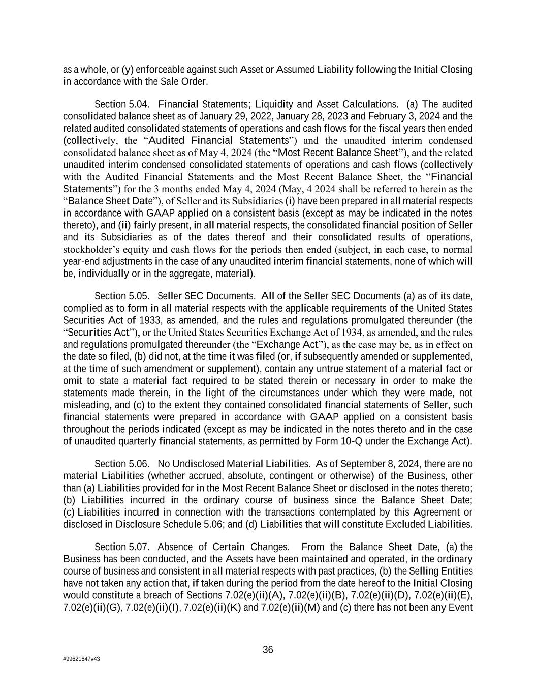 36 #99621647v43 as a whole, or (y) enforceable against such Asset or Assumed Liability following the Initial Closing in accordance with the Sale Order. Section 5.04. Financial Statements; Liquidity and Asset Calculations. (a) The audited consolidated balance sheet as of January 29, 2022, January 28, 2023 and February 3, 2024 and the related audited consolidated statements of operations and cash flows for the fiscal years then ended (collectively, the “Audited Financial Statements”) and the unaudited interim condensed consolidated balance sheet as of May 4, 2024 (the “Most Recent Balance Sheet”), and the related unaudited interim condensed consolidated statements of operations and cash flows (collectively with the Audited Financial Statements and the Most Recent Balance Sheet, the “Financial Statements”) for the 3 months ended May 4, 2024 (May, 4 2024 shall be referred to herein as the “Balance Sheet Date”), of Seller and its Subsidiaries (i) have been prepared in all material respects in accordance with GAAP applied on a consistent basis (except as may be indicated in the notes thereto), and (ii) fairly present, in all material respects, the consolidated financial position of Seller and its Subsidiaries as of the dates thereof and their consolidated results of operations, stockholder’s equity and cash flows for the periods then ended (subject, in each case, to normal year-end adjustments in the case of any unaudited interim financial statements, none of which will be, individually or in the aggregate, material). Section 5.05. Seller SEC Documents. All of the Seller SEC Documents (a) as of its date, complied as to form in all material respects with the applicable requirements of the United States Securities Act of 1933, as amended, and the rules and regulations promulgated thereunder (the “Securities Act”), or the United States Securities Exchange Act of 1934, as amended, and the rules and regulations promulgated thereunder (the “Exchange Act”), as the case may be, as in effect on the date so filed, (b) did not, at the time it was filed (or, if subsequently amended or supplemented, at the time of such amendment or supplement), contain any untrue statement of a material fact or omit to state a material fact required to be stated therein or necessary in order to make the statements made therein, in the light of the circumstances under which they were made, not misleading, and (c) to the extent they contained consolidated financial statements of Seller, such financial statements were prepared in accordance with GAAP applied on a consistent basis throughout the periods indicated (except as may be indicated in the notes thereto and in the case of unaudited quarterly financial statements, as permitted by Form 10-Q under the Exchange Act). Section 5.06. No Undisclosed Material Liabilities. As of September 8, 2024, there are no material Liabilities (whether accrued, absolute, contingent or otherwise) of the Business, other than (a) Liabilities provided for in the Most Recent Balance Sheet or disclosed in the notes thereto; (b) Liabilities incurred in the ordinary course of business since the Balance Sheet Date; (c) Liabilities incurred in connection with the transactions contemplated by this Agreement or disclosed in Disclosure Schedule 5.06; and (d) Liabilities that will constitute Excluded Liabilities. Section 5.07. Absence of Certain Changes. From the Balance Sheet Date, (a) the Business has been conducted, and the Assets have been maintained and operated, in the ordinary course of business and consistent in all material respects with past practices, (b) the Selling Entities have not taken any action that, if taken during the period from the date hereof to the Initial Closing would constitute a breach of Sections 7.02(e)(ii)(A), 7.02(e)(ii)(B), 7.02(e)(ii)(D), 7.02(e)(ii)(E), 7.02(e)(ii)(G), 7.02(e)(ii)(I), 7.02(e)(ii)(K) and 7.02(e)(ii)(M) and (c) there has not been any Event