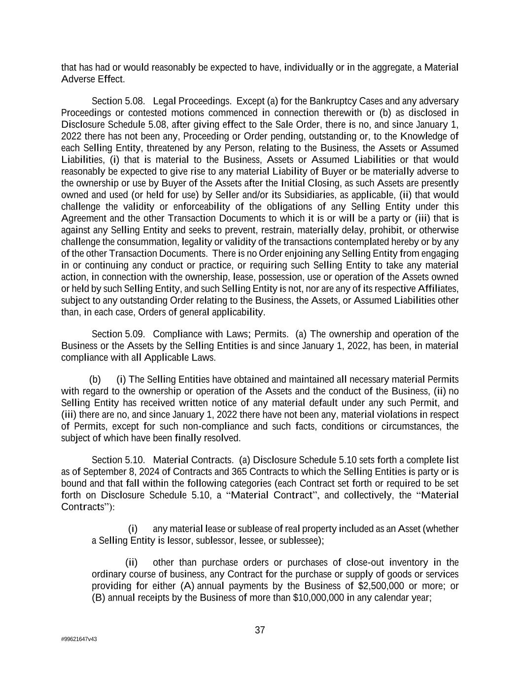 37 #99621647v43 that has had or would reasonably be expected to have, individually or in the aggregate, a Material Adverse Effect. Section 5.08. Legal Proceedings. Except (a) for the Bankruptcy Cases and any adversary Proceedings or contested motions commenced in connection therewith or (b) as disclosed in Disclosure Schedule 5.08, after giving effect to the Sale Order, there is no, and since January 1, 2022 there has not been any, Proceeding or Order pending, outstanding or, to the Knowledge of each Selling Entity, threatened by any Person, relating to the Business, the Assets or Assumed Liabilities, (i) that is material to the Business, Assets or Assumed Liabilities or that would reasonably be expected to give rise to any material Liability of Buyer or be materially adverse to the ownership or use by Buyer of the Assets after the Initial Closing, as such Assets are presently owned and used (or held for use) by Seller and/or its Subsidiaries, as applicable, (ii) that would challenge the validity or enforceability of the obligations of any Selling Entity under this Agreement and the other Transaction Documents to which it is or will be a party or (iii) that is against any Selling Entity and seeks to prevent, restrain, materially delay, prohibit, or otherwise challenge the consummation, legality or validity of the transactions contemplated hereby or by any of the other Transaction Documents. There is no Order enjoining any Selling Entity from engaging in or continuing any conduct or practice, or requiring such Selling Entity to take any material action, in connection with the ownership, lease, possession, use or operation of the Assets owned or held by such Selling Entity, and such Selling Entity is not, nor are any of its respective Affiliates, subject to any outstanding Order relating to the Business, the Assets, or Assumed Liabilities other than, in each case, Orders of general applicability. Section 5.09. Compliance with Laws; Permits. (a) The ownership and operation of the Business or the Assets by the Selling Entities is and since January 1, 2022, has been, in material compliance with all Applicable Laws. (b) (i) The Selling Entities have obtained and maintained all necessary material Permits with regard to the ownership or operation of the Assets and the conduct of the Business, (ii) no Selling Entity has received written notice of any material default under any such Permit, and (iii) there are no, and since January 1, 2022 there have not been any, material violations in respect of Permits, except for such non-compliance and such facts, conditions or circumstances, the subject of which have been finally resolved. Section 5.10. Material Contracts. (a) Disclosure Schedule 5.10 sets forth a complete list as of September 8, 2024 of Contracts and 365 Contracts to which the Selling Entities is party or is bound and that fall within the following categories (each Contract set forth or required to be set forth on Disclosure Schedule 5.10, a “Material Contract”, and collectively, the “Material Contracts”): (i) any material lease or sublease of real property included as an Asset (whether a Selling Entity is lessor, sublessor, lessee, or sublessee); (ii) other than purchase orders or purchases of close-out inventory in the ordinary course of business, any Contract for the purchase or supply of goods or services providing for either (A) annual payments by the Business of $2,500,000 or more; or (B) annual receipts by the Business of more than $10,000,000 in any calendar year;