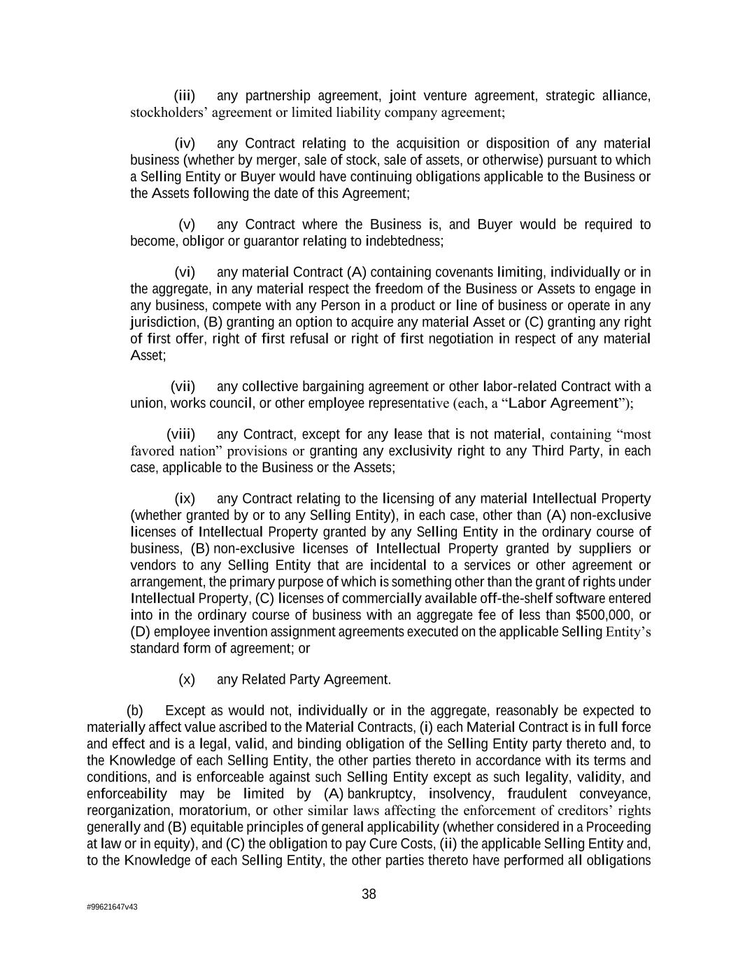 38 #99621647v43 (iii) any partnership agreement, joint venture agreement, strategic alliance, stockholders’ agreement or limited liability company agreement; (iv) any Contract relating to the acquisition or disposition of any material business (whether by merger, sale of stock, sale of assets, or otherwise) pursuant to which a Selling Entity or Buyer would have continuing obligations applicable to the Business or the Assets following the date of this Agreement; (v) any Contract where the Business is, and Buyer would be required to become, obligor or guarantor relating to indebtedness; (vi) any material Contract (A) containing covenants limiting, individually or in the aggregate, in any material respect the freedom of the Business or Assets to engage in any business, compete with any Person in a product or line of business or operate in any jurisdiction, (B) granting an option to acquire any material Asset or (C) granting any right of first offer, right of first refusal or right of first negotiation in respect of any material Asset; (vii) any collective bargaining agreement or other labor-related Contract with a union, works council, or other employee representative (each, a “Labor Agreement”); (viii) any Contract, except for any lease that is not material, containing “most favored nation” provisions or granting any exclusivity right to any Third Party, in each case, applicable to the Business or the Assets; (ix) any Contract relating to the licensing of any material Intellectual Property (whether granted by or to any Selling Entity), in each case, other than (A) non-exclusive licenses of Intellectual Property granted by any Selling Entity in the ordinary course of business, (B) non-exclusive licenses of Intellectual Property granted by suppliers or vendors to any Selling Entity that are incidental to a services or other agreement or arrangement, the primary purpose of which is something other than the grant of rights under Intellectual Property, (C) licenses of commercially available off-the-shelf software entered into in the ordinary course of business with an aggregate fee of less than $500,000, or (D) employee invention assignment agreements executed on the applicable Selling Entity’s standard form of agreement; or (x) any Related Party Agreement. (b) Except as would not, individually or in the aggregate, reasonably be expected to materially affect value ascribed to the Material Contracts, (i) each Material Contract is in full force and effect and is a legal, valid, and binding obligation of the Selling Entity party thereto and, to the Knowledge of each Selling Entity, the other parties thereto in accordance with its terms and conditions, and is enforceable against such Selling Entity except as such legality, validity, and enforceability may be limited by (A) bankruptcy, insolvency, fraudulent conveyance, reorganization, moratorium, or other similar laws affecting the enforcement of creditors’ rights generally and (B) equitable principles of general applicability (whether considered in a Proceeding at law or in equity), and (C) the obligation to pay Cure Costs, (ii) the applicable Selling Entity and, to the Knowledge of each Selling Entity, the other parties thereto have performed all obligations