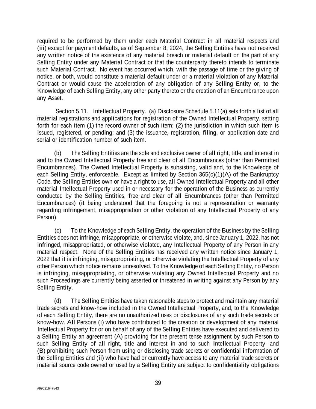 39 #99621647v43 required to be performed by them under each Material Contract in all material respects and (iii) except for payment defaults, as of September 8, 2024, the Selling Entities have not received any written notice of the existence of any material breach or material default on the part of any Selling Entity under any Material Contract or that the counterparty thereto intends to terminate such Material Contract. No event has occurred which, with the passage of time or the giving of notice, or both, would constitute a material default under or a material violation of any Material Contract or would cause the acceleration of any obligation of any Selling Entity or, to the Knowledge of each Selling Entity, any other party thereto or the creation of an Encumbrance upon any Asset. Section 5.11. Intellectual Property. (a) Disclosure Schedule 5.11(a) sets forth a list of all material registrations and applications for registration of the Owned Intellectual Property, setting forth for each item (1) the record owner of such item; (2) the jurisdiction in which such item is issued, registered, or pending; and (3) the issuance, registration, filing, or application date and serial or identification number of such item. (b) The Selling Entities are the sole and exclusive owner of all right, title, and interest in and to the Owned Intellectual Property free and clear of all Encumbrances (other than Permitted Encumbrances). The Owned Intellectual Property is subsisting, valid and, to the Knowledge of each Selling Entity, enforceable. Except as limited by Section 365(c)(1)(A) of the Bankruptcy Code, the Selling Entities own or have a right to use, all Owned Intellectual Property and all other material Intellectual Property used in or necessary for the operation of the Business as currently conducted by the Selling Entities, free and clear of all Encumbrances (other than Permitted Encumbrances) (it being understood that the foregoing is not a representation or warranty regarding infringement, misappropriation or other violation of any Intellectual Property of any Person). (c) To the Knowledge of each Selling Entity, the operation of the Business by the Selling Entities does not infringe, misappropriate, or otherwise violate, and, since January 1, 2022, has not infringed, misappropriated, or otherwise violated, any Intellectual Property of any Person in any material respect. None of the Selling Entities has received any written notice since January 1, 2022 that it is infringing, misappropriating, or otherwise violating the Intellectual Property of any other Person which notice remains unresolved. To the Knowledge of each Selling Entity, no Person is infringing, misappropriating, or otherwise violating any Owned Intellectual Property and no such Proceedings are currently being asserted or threatened in writing against any Person by any Selling Entity. (d) The Selling Entities have taken reasonable steps to protect and maintain any material trade secrets and know-how included in the Owned Intellectual Property, and, to the Knowledge of each Selling Entity, there are no unauthorized uses or disclosures of any such trade secrets or know-how. All Persons (i) who have contributed to the creation or development of any material Intellectual Property for or on behalf of any of the Selling Entities have executed and delivered to a Selling Entity an agreement (A) providing for the present tense assignment by such Person to such Selling Entity of all right, title and interest in and to such Intellectual Property, and (B) prohibiting such Person from using or disclosing trade secrets or confidential information of the Selling Entities and (ii) who have had or currently have access to any material trade secrets or material source code owned or used by a Selling Entity are subject to confidentiality obligations