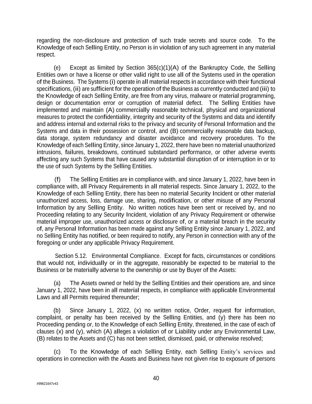 40 #99621647v43 regarding the non-disclosure and protection of such trade secrets and source code. To the Knowledge of each Selling Entity, no Person is in violation of any such agreement in any material respect. (e) Except as limited by Section 365(c)(1)(A) of the Bankruptcy Code, the Selling Entities own or have a license or other valid right to use all of the Systems used in the operation of the Business. The Systems (i) operate in all material respects in accordance with their functional specifications, (ii) are sufficient for the operation of the Business as currently conducted and (iii) to the Knowledge of each Selling Entity, are free from any virus, malware or material programming, design or documentation error or corruption of material defect. The Selling Entities have implemented and maintain (A) commercially reasonable technical, physical and organizational measures to protect the confidentiality, integrity and security of the Systems and data and identify and address internal and external risks to the privacy and security of Personal Information and the Systems and data in their possession or control, and (B) commercially reasonable data backup, data storage, system redundancy and disaster avoidance and recovery procedures. To the Knowledge of each Selling Entity, since January 1, 2022, there have been no material unauthorized intrusions, failures, breakdowns, continued substandard performance, or other adverse events affecting any such Systems that have caused any substantial disruption of or interruption in or to the use of such Systems by the Selling Entities. (f) The Selling Entities are in compliance with, and since January 1, 2022, have been in compliance with, all Privacy Requirements in all material respects. Since January 1, 2022, to the Knowledge of each Selling Entity, there has been no material Security Incident or other material unauthorized access, loss, damage use, sharing, modification, or other misuse of any Personal Information by any Selling Entity. No written notices have been sent or received by, and no Proceeding relating to any Security Incident, violation of any Privacy Requirement or otherwise material improper use, unauthorized access or disclosure of, or a material breach in the security of, any Personal Information has been made against any Selling Entity since January 1, 2022, and no Selling Entity has notified, or been required to notify, any Person in connection with any of the foregoing or under any applicable Privacy Requirement. Section 5.12. Environmental Compliance. Except for facts, circumstances or conditions that would not, individually or in the aggregate, reasonably be expected to be material to the Business or be materially adverse to the ownership or use by Buyer of the Assets: (a) The Assets owned or held by the Selling Entities and their operations are, and since January 1, 2022, have been in all material respects, in compliance with applicable Environmental Laws and all Permits required thereunder; (b) Since January 1, 2022, (x) no written notice, Order, request for information, complaint, or penalty has been received by the Selling Entities, and (y) there has been no Proceeding pending or, to the Knowledge of each Selling Entity, threatened, in the case of each of clauses (x) and (y), which (A) alleges a violation of or Liability under any Environmental Law, (B) relates to the Assets and (C) has not been settled, dismissed, paid, or otherwise resolved; (c) To the Knowledge of each Selling Entity, each Selling Entity’s services and operations in connection with the Assets and Business have not given rise to exposure of persons