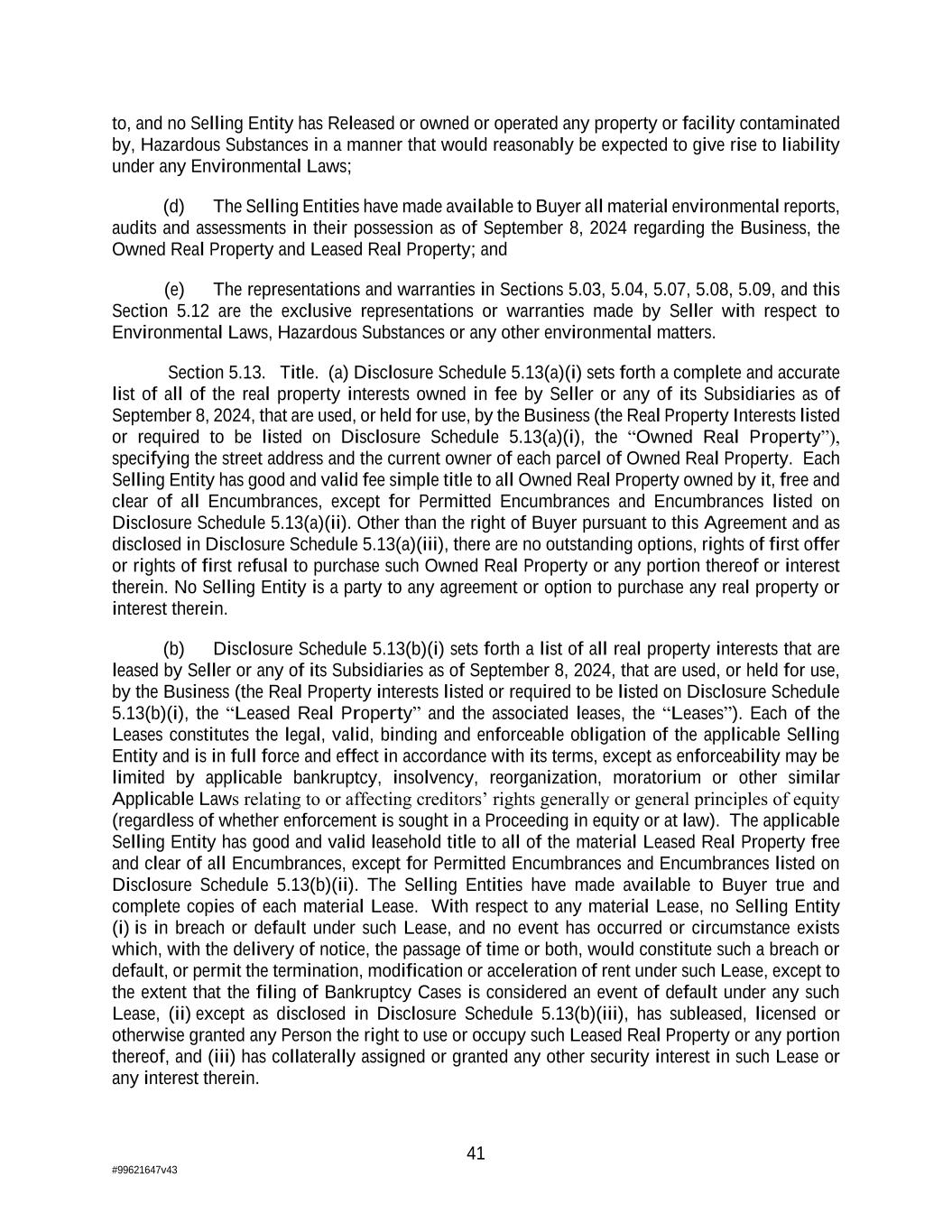 41 #99621647v43 to, and no Selling Entity has Released or owned or operated any property or facility contaminated by, Hazardous Substances in a manner that would reasonably be expected to give rise to liability under any Environmental Laws; (d) The Selling Entities have made available to Buyer all material environmental reports, audits and assessments in their possession as of September 8, 2024 regarding the Business, the Owned Real Property and Leased Real Property; and (e) The representations and warranties in Sections 5.03, 5.04, 5.07, 5.08, 5.09, and this Section 5.12 are the exclusive representations or warranties made by Seller with respect to Environmental Laws, Hazardous Substances or any other environmental matters. Section 5.13. Title. (a) Disclosure Schedule 5.13(a)(i) sets forth a complete and accurate list of all of the real property interests owned in fee by Seller or any of its Subsidiaries as of September 8, 2024, that are used, or held for use, by the Business (the Real Property Interests listed or required to be listed on Disclosure Schedule 5.13(a)(i), the “Owned Real Property”), specifying the street address and the current owner of each parcel of Owned Real Property. Each Selling Entity has good and valid fee simple title to all Owned Real Property owned by it, free and clear of all Encumbrances, except for Permitted Encumbrances and Encumbrances listed on Disclosure Schedule 5.13(a)(ii). Other than the right of Buyer pursuant to this Agreement and as disclosed in Disclosure Schedule 5.13(a)(iii), there are no outstanding options, rights of first offer or rights of first refusal to purchase such Owned Real Property or any portion thereof or interest therein. No Selling Entity is a party to any agreement or option to purchase any real property or interest therein. (b) Disclosure Schedule 5.13(b)(i) sets forth a list of all real property interests that are leased by Seller or any of its Subsidiaries as of September 8, 2024, that are used, or held for use, by the Business (the Real Property interests listed or required to be listed on Disclosure Schedule 5.13(b)(i), the “Leased Real Property” and the associated leases, the “Leases”). Each of the Leases constitutes the legal, valid, binding and enforceable obligation of the applicable Selling Entity and is in full force and effect in accordance with its terms, except as enforceability may be limited by applicable bankruptcy, insolvency, reorganization, moratorium or other similar Applicable Laws relating to or affecting creditors’ rights generally or general principles of equity (regardless of whether enforcement is sought in a Proceeding in equity or at law). The applicable Selling Entity has good and valid leasehold title to all of the material Leased Real Property free and clear of all Encumbrances, except for Permitted Encumbrances and Encumbrances listed on Disclosure Schedule 5.13(b)(ii). The Selling Entities have made available to Buyer true and complete copies of each material Lease. With respect to any material Lease, no Selling Entity (i) is in breach or default under such Lease, and no event has occurred or circumstance exists which, with the delivery of notice, the passage of time or both, would constitute such a breach or default, or permit the termination, modification or acceleration of rent under such Lease, except to the extent that the filing of Bankruptcy Cases is considered an event of default under any such Lease, (ii) except as disclosed in Disclosure Schedule 5.13(b)(iii), has subleased, licensed or otherwise granted any Person the right to use or occupy such Leased Real Property or any portion thereof, and (iii) has collaterally assigned or granted any other security interest in such Lease or any interest therein.