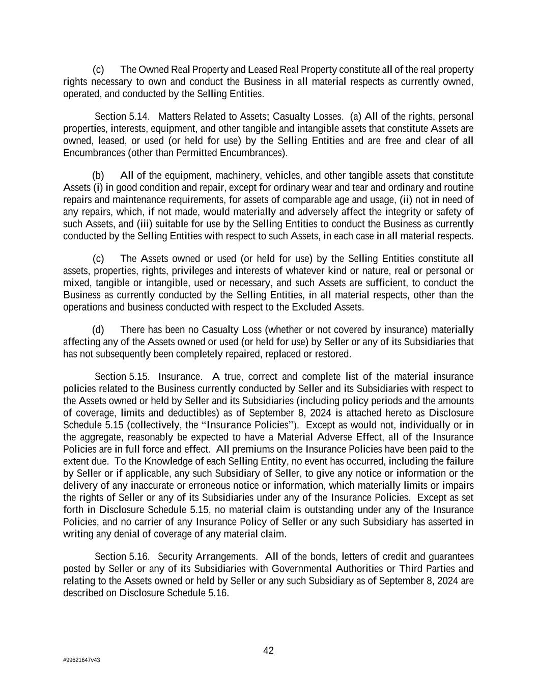 42 #99621647v43 (c) The Owned Real Property and Leased Real Property constitute all of the real property rights necessary to own and conduct the Business in all material respects as currently owned, operated, and conducted by the Selling Entities. Section 5.14. Matters Related to Assets; Casualty Losses. (a) All of the rights, personal properties, interests, equipment, and other tangible and intangible assets that constitute Assets are owned, leased, or used (or held for use) by the Selling Entities and are free and clear of all Encumbrances (other than Permitted Encumbrances). (b) All of the equipment, machinery, vehicles, and other tangible assets that constitute Assets (i) in good condition and repair, except for ordinary wear and tear and ordinary and routine repairs and maintenance requirements, for assets of comparable age and usage, (ii) not in need of any repairs, which, if not made, would materially and adversely affect the integrity or safety of such Assets, and (iii) suitable for use by the Selling Entities to conduct the Business as currently conducted by the Selling Entities with respect to such Assets, in each case in all material respects. (c) The Assets owned or used (or held for use) by the Selling Entities constitute all assets, properties, rights, privileges and interests of whatever kind or nature, real or personal or mixed, tangible or intangible, used or necessary, and such Assets are sufficient, to conduct the Business as currently conducted by the Selling Entities, in all material respects, other than the operations and business conducted with respect to the Excluded Assets. (d) There has been no Casualty Loss (whether or not covered by insurance) materially affecting any of the Assets owned or used (or held for use) by Seller or any of its Subsidiaries that has not subsequently been completely repaired, replaced or restored. Section 5.15. Insurance. A true, correct and complete list of the material insurance policies related to the Business currently conducted by Seller and its Subsidiaries with respect to the Assets owned or held by Seller and its Subsidiaries (including policy periods and the amounts of coverage, limits and deductibles) as of September 8, 2024 is attached hereto as Disclosure Schedule 5.15 (collectively, the “Insurance Policies”). Except as would not, individually or in the aggregate, reasonably be expected to have a Material Adverse Effect, all of the Insurance Policies are in full force and effect. All premiums on the Insurance Policies have been paid to the extent due. To the Knowledge of each Selling Entity, no event has occurred, including the failure by Seller or if applicable, any such Subsidiary of Seller, to give any notice or information or the delivery of any inaccurate or erroneous notice or information, which materially limits or impairs the rights of Seller or any of its Subsidiaries under any of the Insurance Policies. Except as set forth in Disclosure Schedule 5.15, no material claim is outstanding under any of the Insurance Policies, and no carrier of any Insurance Policy of Seller or any such Subsidiary has asserted in writing any denial of coverage of any material claim. Section 5.16. Security Arrangements. All of the bonds, letters of credit and guarantees posted by Seller or any of its Subsidiaries with Governmental Authorities or Third Parties and relating to the Assets owned or held by Seller or any such Subsidiary as of September 8, 2024 are described on Disclosure Schedule 5.16.