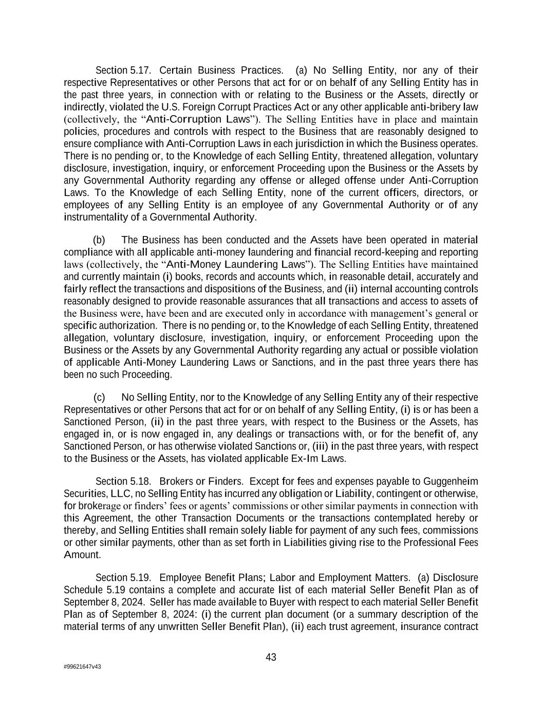 43 #99621647v43 Section 5.17. Certain Business Practices. (a) No Selling Entity, nor any of their respective Representatives or other Persons that act for or on behalf of any Selling Entity has in the past three years, in connection with or relating to the Business or the Assets, directly or indirectly, violated the U.S. Foreign Corrupt Practices Act or any other applicable anti-bribery law (collectively, the “Anti-Corruption Laws”). The Selling Entities have in place and maintain policies, procedures and controls with respect to the Business that are reasonably designed to ensure compliance with Anti-Corruption Laws in each jurisdiction in which the Business operates. There is no pending or, to the Knowledge of each Selling Entity, threatened allegation, voluntary disclosure, investigation, inquiry, or enforcement Proceeding upon the Business or the Assets by any Governmental Authority regarding any offense or alleged offense under Anti-Corruption Laws. To the Knowledge of each Selling Entity, none of the current officers, directors, or employees of any Selling Entity is an employee of any Governmental Authority or of any instrumentality of a Governmental Authority. (b) The Business has been conducted and the Assets have been operated in material compliance with all applicable anti-money laundering and financial record-keeping and reporting laws (collectively, the “Anti-Money Laundering Laws”). The Selling Entities have maintained and currently maintain (i) books, records and accounts which, in reasonable detail, accurately and fairly reflect the transactions and dispositions of the Business, and (ii) internal accounting controls reasonably designed to provide reasonable assurances that all transactions and access to assets of the Business were, have been and are executed only in accordance with management’s general or specific authorization. There is no pending or, to the Knowledge of each Selling Entity, threatened allegation, voluntary disclosure, investigation, inquiry, or enforcement Proceeding upon the Business or the Assets by any Governmental Authority regarding any actual or possible violation of applicable Anti-Money Laundering Laws or Sanctions, and in the past three years there has been no such Proceeding. (c) No Selling Entity, nor to the Knowledge of any Selling Entity any of their respective Representatives or other Persons that act for or on behalf of any Selling Entity, (i) is or has been a Sanctioned Person, (ii) in the past three years, with respect to the Business or the Assets, has engaged in, or is now engaged in, any dealings or transactions with, or for the benefit of, any Sanctioned Person, or has otherwise violated Sanctions or, (iii) in the past three years, with respect to the Business or the Assets, has violated applicable Ex-Im Laws. Section 5.18. Brokers or Finders. Except for fees and expenses payable to Guggenheim Securities, LLC, no Selling Entity has incurred any obligation or Liability, contingent or otherwise, for brokerage or finders’ fees or agents’ commissions or other similar payments in connection with this Agreement, the other Transaction Documents or the transactions contemplated hereby or thereby, and Selling Entities shall remain solely liable for payment of any such fees, commissions or other similar payments, other than as set forth in Liabilities giving rise to the Professional Fees Amount. Section 5.19. Employee Benefit Plans; Labor and Employment Matters. (a) Disclosure Schedule 5.19 contains a complete and accurate list of each material Seller Benefit Plan as of September 8, 2024. Seller has made available to Buyer with respect to each material Seller Benefit Plan as of September 8, 2024: (i) the current plan document (or a summary description of the material terms of any unwritten Seller Benefit Plan), (ii) each trust agreement, insurance contract