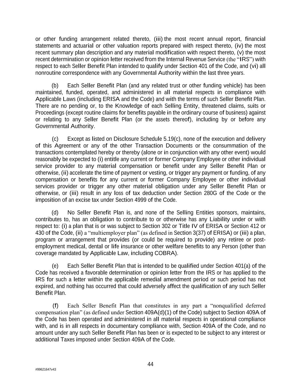 44 #99621647v43 or other funding arrangement related thereto, (iii) the most recent annual report, financial statements and actuarial or other valuation reports prepared with respect thereto, (iv) the most recent summary plan description and any material modification with respect thereto, (v) the most recent determination or opinion letter received from the Internal Revenue Service (the “IRS”) with respect to each Seller Benefit Plan intended to qualify under Section 401 of the Code, and (vi) all nonroutine correspondence with any Governmental Authority within the last three years. (b) Each Seller Benefit Plan (and any related trust or other funding vehicle) has been maintained, funded, operated, and administered in all material respects in compliance with Applicable Laws (including ERISA and the Code) and with the terms of such Seller Benefit Plan. There are no pending or, to the Knowledge of each Selling Entity, threatened claims, suits or Proceedings (except routine claims for benefits payable in the ordinary course of business) against or relating to any Seller Benefit Plan (or the assets thereof), including by or before any Governmental Authority. (c) Except as listed on Disclosure Schedule 5.19(c), none of the execution and delivery of this Agreement or any of the other Transaction Documents or the consummation of the transactions contemplated hereby or thereby (alone or in conjunction with any other event) would reasonably be expected to (i) entitle any current or former Company Employee or other individual service provider to any material compensation or benefit under any Seller Benefit Plan or otherwise, (ii) accelerate the time of payment or vesting, or trigger any payment or funding, of any compensation or benefits for any current or former Company Employee or other individual services provider or trigger any other material obligation under any Seller Benefit Plan or otherwise, or (iii) result in any loss of tax deduction under Section 280G of the Code or the imposition of an excise tax under Section 4999 of the Code. (d) No Seller Benefit Plan is, and none of the Selling Entities sponsors, maintains, contributes to, has an obligation to contribute to or otherwise has any Liability under or with respect to: (i) a plan that is or was subject to Section 302 or Title IV of ERISA or Section 412 or 430 of the Code, (ii) a “multiemployer plan” (as defined in Section 3(37) of ERISA) or (iii) a plan, program or arrangement that provides (or could be required to provide) any retiree or post- employment medical, dental or life insurance or other welfare benefits to any Person (other than coverage mandated by Applicable Law, including COBRA). (e) Each Seller Benefit Plan that is intended to be qualified under Section 401(a) of the Code has received a favorable determination or opinion letter from the IRS or has applied to the IRS for such a letter within the applicable remedial amendment period or such period has not expired, and nothing has occurred that could adversely affect the qualification of any such Seller Benefit Plan. (f) Each Seller Benefit Plan that constitutes in any part a “nonqualified deferred compensation plan” (as defined under Section 409A(d)(1) of the Code) subject to Section 409A of the Code has been operated and administered in all material respects in operational compliance with, and is in all respects in documentary compliance with, Section 409A of the Code, and no amount under any such Seller Benefit Plan has been or is expected to be subject to any interest or additional Taxes imposed under Section 409A of the Code.