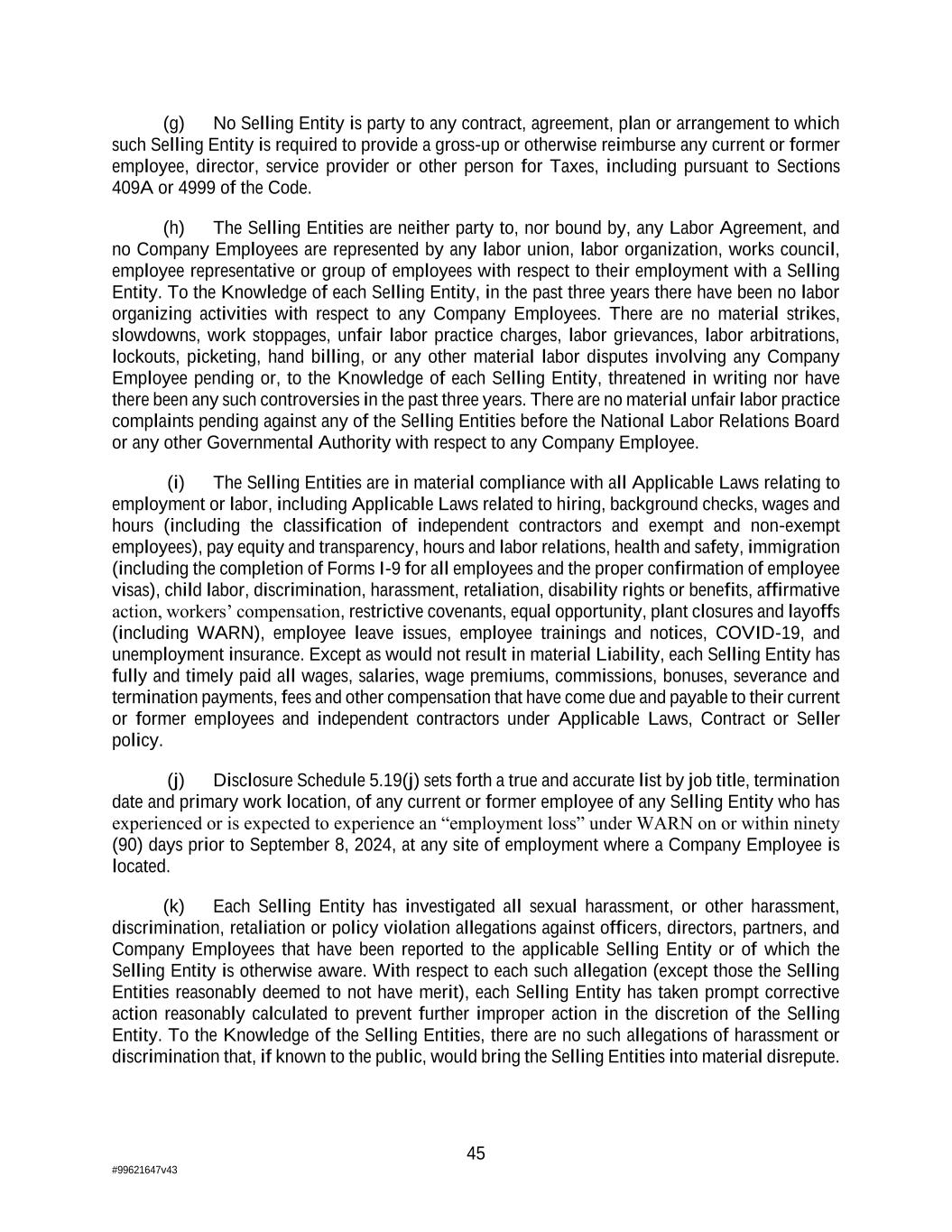45 #99621647v43 (g) No Selling Entity is party to any contract, agreement, plan or arrangement to which such Selling Entity is required to provide a gross-up or otherwise reimburse any current or former employee, director, service provider or other person for Taxes, including pursuant to Sections 409A or 4999 of the Code. (h) The Selling Entities are neither party to, nor bound by, any Labor Agreement, and no Company Employees are represented by any labor union, labor organization, works council, employee representative or group of employees with respect to their employment with a Selling Entity. To the Knowledge of each Selling Entity, in the past three years there have been no labor organizing activities with respect to any Company Employees. There are no material strikes, slowdowns, work stoppages, unfair labor practice charges, labor grievances, labor arbitrations, lockouts, picketing, hand billing, or any other material labor disputes involving any Company Employee pending or, to the Knowledge of each Selling Entity, threatened in writing nor have there been any such controversies in the past three years. There are no material unfair labor practice complaints pending against any of the Selling Entities before the National Labor Relations Board or any other Governmental Authority with respect to any Company Employee. (i) The Selling Entities are in material compliance with all Applicable Laws relating to employment or labor, including Applicable Laws related to hiring, background checks, wages and hours (including the classification of independent contractors and exempt and non-exempt employees), pay equity and transparency, hours and labor relations, health and safety, immigration (including the completion of Forms I-9 for all employees and the proper confirmation of employee visas), child labor, discrimination, harassment, retaliation, disability rights or benefits, affirmative action, workers’ compensation, restrictive covenants, equal opportunity, plant closures and layoffs (including WARN), employee leave issues, employee trainings and notices, COVID-19, and unemployment insurance. Except as would not result in material Liability, each Selling Entity has fully and timely paid all wages, salaries, wage premiums, commissions, bonuses, severance and termination payments, fees and other compensation that have come due and payable to their current or former employees and independent contractors under Applicable Laws, Contract or Seller policy. (j) Disclosure Schedule 5.19(j) sets forth a true and accurate list by job title, termination date and primary work location, of any current or former employee of any Selling Entity who has experienced or is expected to experience an “employment loss” under WARN on or within ninety (90) days prior to September 8, 2024, at any site of employment where a Company Employee is located. (k) Each Selling Entity has investigated all sexual harassment, or other harassment, discrimination, retaliation or policy violation allegations against officers, directors, partners, and Company Employees that have been reported to the applicable Selling Entity or of which the Selling Entity is otherwise aware. With respect to each such allegation (except those the Selling Entities reasonably deemed to not have merit), each Selling Entity has taken prompt corrective action reasonably calculated to prevent further improper action in the discretion of the Selling Entity. To the Knowledge of the Selling Entities, there are no such allegations of harassment or discrimination that, if known to the public, would bring the Selling Entities into material disrepute.
