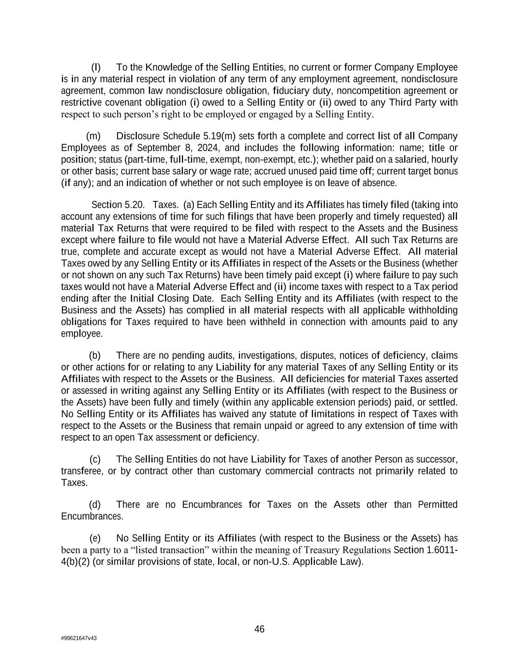 46 #99621647v43 (l) To the Knowledge of the Selling Entities, no current or former Company Employee is in any material respect in violation of any term of any employment agreement, nondisclosure agreement, common law nondisclosure obligation, fiduciary duty, noncompetition agreement or restrictive covenant obligation (i) owed to a Selling Entity or (ii) owed to any Third Party with respect to such person’s right to be employed or engaged by a Selling Entity. (m) Disclosure Schedule 5.19(m) sets forth a complete and correct list of all Company Employees as of September 8, 2024, and includes the following information: name; title or position; status (part-time, full-time, exempt, non-exempt, etc.); whether paid on a salaried, hourly or other basis; current base salary or wage rate; accrued unused paid time off; current target bonus (if any); and an indication of whether or not such employee is on leave of absence. Section 5.20. Taxes. (a) Each Selling Entity and its Affiliates has timely filed (taking into account any extensions of time for such filings that have been properly and timely requested) all material Tax Returns that were required to be filed with respect to the Assets and the Business except where failure to file would not have a Material Adverse Effect. All such Tax Returns are true, complete and accurate except as would not have a Material Adverse Effect. All material Taxes owed by any Selling Entity or its Affiliates in respect of the Assets or the Business (whether or not shown on any such Tax Returns) have been timely paid except (i) where failure to pay such taxes would not have a Material Adverse Effect and (ii) income taxes with respect to a Tax period ending after the Initial Closing Date. Each Selling Entity and its Affiliates (with respect to the Business and the Assets) has complied in all material respects with all applicable withholding obligations for Taxes required to have been withheld in connection with amounts paid to any employee. (b) There are no pending audits, investigations, disputes, notices of deficiency, claims or other actions for or relating to any Liability for any material Taxes of any Selling Entity or its Affiliates with respect to the Assets or the Business. All deficiencies for material Taxes asserted or assessed in writing against any Selling Entity or its Affiliates (with respect to the Business or the Assets) have been fully and timely (within any applicable extension periods) paid, or settled. No Selling Entity or its Affiliates has waived any statute of limitations in respect of Taxes with respect to the Assets or the Business that remain unpaid or agreed to any extension of time with respect to an open Tax assessment or deficiency. (c) The Selling Entities do not have Liability for Taxes of another Person as successor, transferee, or by contract other than customary commercial contracts not primarily related to Taxes. (d) There are no Encumbrances for Taxes on the Assets other than Permitted Encumbrances. (e) No Selling Entity or its Affiliates (with respect to the Business or the Assets) has been a party to a “listed transaction” within the meaning of Treasury Regulations Section 1.6011- 4(b)(2) (or similar provisions of state, local, or non-U.S. Applicable Law).