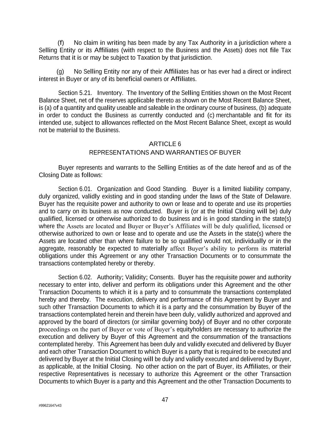 47 #99621647v43 (f) No claim in writing has been made by any Tax Authority in a jurisdiction where a Selling Entity or its Affiliates (with respect to the Business and the Assets) does not file Tax Returns that it is or may be subject to Taxation by that jurisdiction. (g) No Selling Entity nor any of their Affiliates has or has ever had a direct or indirect interest in Buyer or any of its beneficial owners or Affiliates. Section 5.21. Inventory. The Inventory of the Selling Entities shown on the Most Recent Balance Sheet, net of the reserves applicable thereto as shown on the Most Recent Balance Sheet, is (a) of a quantity and quality useable and saleable in the ordinary course of business, (b) adequate in order to conduct the Business as currently conducted and (c) merchantable and fit for its intended use, subject to allowances reflected on the Most Recent Balance Sheet, except as would not be material to the Business. ARTICLE 6 REPRESENTATIONS AND WARRANTIES OF BUYER Buyer represents and warrants to the Selling Entities as of the date hereof and as of the Closing Date as follows: Section 6.01. Organization and Good Standing. Buyer is a limited liability company, duly organized, validly existing and in good standing under the laws of the State of Delaware. Buyer has the requisite power and authority to own or lease and to operate and use its properties and to carry on its business as now conducted. Buyer is (or at the Initial Closing will be) duly qualified, licensed or otherwise authorized to do business and is in good standing in the state(s) where the Assets are located and Buyer or Buyer’s Affiliates will be duly qualified, licensed or otherwise authorized to own or lease and to operate and use the Assets in the state(s) where the Assets are located other than where failure to be so qualified would not, individually or in the aggregate, reasonably be expected to materially affect Buyer’s ability to perform its material obligations under this Agreement or any other Transaction Documents or to consummate the transactions contemplated hereby or thereby. Section 6.02. Authority; Validity; Consents. Buyer has the requisite power and authority necessary to enter into, deliver and perform its obligations under this Agreement and the other Transaction Documents to which it is a party and to consummate the transactions contemplated hereby and thereby. The execution, delivery and performance of this Agreement by Buyer and such other Transaction Documents to which it is a party and the consummation by Buyer of the transactions contemplated herein and therein have been duly, validly authorized and approved and approved by the board of directors (or similar governing body) of Buyer and no other corporate proceedings on the part of Buyer or vote of Buyer’s equityholders are necessary to authorize the execution and delivery by Buyer of this Agreement and the consummation of the transactions contemplated hereby. This Agreement has been duly and validly executed and delivered by Buyer and each other Transaction Document to which Buyer is a party that is required to be executed and delivered by Buyer at the Initial Closing will be duly and validly executed and delivered by Buyer, as applicable, at the Initial Closing. No other action on the part of Buyer, its Affiliates, or their respective Representatives is necessary to authorize this Agreement or the other Transaction Documents to which Buyer is a party and this Agreement and the other Transaction Documents to