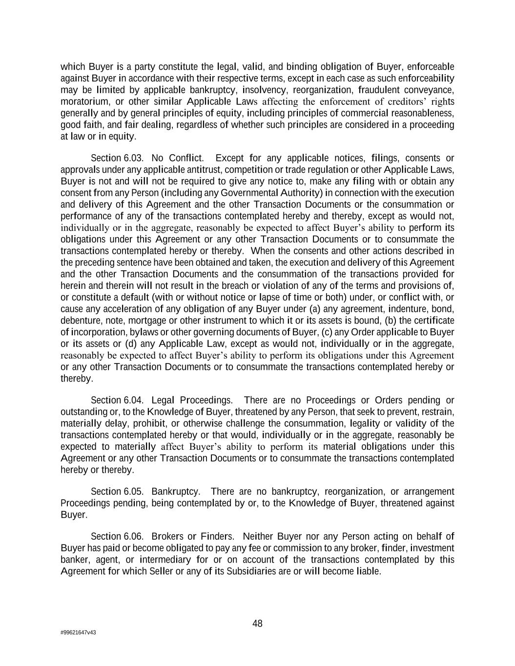 48 #99621647v43 which Buyer is a party constitute the legal, valid, and binding obligation of Buyer, enforceable against Buyer in accordance with their respective terms, except in each case as such enforceability may be limited by applicable bankruptcy, insolvency, reorganization, fraudulent conveyance, moratorium, or other similar Applicable Laws affecting the enforcement of creditors’ rights generally and by general principles of equity, including principles of commercial reasonableness, good faith, and fair dealing, regardless of whether such principles are considered in a proceeding at law or in equity. Section 6.03. No Conflict. Except for any applicable notices, filings, consents or approvals under any applicable antitrust, competition or trade regulation or other Applicable Laws, Buyer is not and will not be required to give any notice to, make any filing with or obtain any consent from any Person (including any Governmental Authority) in connection with the execution and delivery of this Agreement and the other Transaction Documents or the consummation or performance of any of the transactions contemplated hereby and thereby, except as would not, individually or in the aggregate, reasonably be expected to affect Buyer’s ability to perform its obligations under this Agreement or any other Transaction Documents or to consummate the transactions contemplated hereby or thereby. When the consents and other actions described in the preceding sentence have been obtained and taken, the execution and delivery of this Agreement and the other Transaction Documents and the consummation of the transactions provided for herein and therein will not result in the breach or violation of any of the terms and provisions of, or constitute a default (with or without notice or lapse of time or both) under, or conflict with, or cause any acceleration of any obligation of any Buyer under (a) any agreement, indenture, bond, debenture, note, mortgage or other instrument to which it or its assets is bound, (b) the certificate of incorporation, bylaws or other governing documents of Buyer, (c) any Order applicable to Buyer or its assets or (d) any Applicable Law, except as would not, individually or in the aggregate, reasonably be expected to affect Buyer’s ability to perform its obligations under this Agreement or any other Transaction Documents or to consummate the transactions contemplated hereby or thereby. Section 6.04. Legal Proceedings. There are no Proceedings or Orders pending or outstanding or, to the Knowledge of Buyer, threatened by any Person, that seek to prevent, restrain, materially delay, prohibit, or otherwise challenge the consummation, legality or validity of the transactions contemplated hereby or that would, individually or in the aggregate, reasonably be expected to materially affect Buyer’s ability to perform its material obligations under this Agreement or any other Transaction Documents or to consummate the transactions contemplated hereby or thereby. Section 6.05. Bankruptcy. There are no bankruptcy, reorganization, or arrangement Proceedings pending, being contemplated by or, to the Knowledge of Buyer, threatened against Buyer. Section 6.06. Brokers or Finders. Neither Buyer nor any Person acting on behalf of Buyer has paid or become obligated to pay any fee or commission to any broker, finder, investment banker, agent, or intermediary for or on account of the transactions contemplated by this Agreement for which Seller or any of its Subsidiaries are or will become liable.
