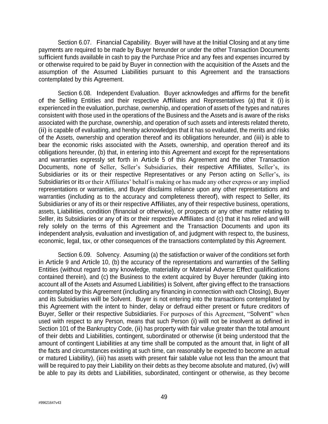 49 #99621647v43 Section 6.07. Financial Capability. Buyer will have at the Initial Closing and at any time payments are required to be made by Buyer hereunder or under the other Transaction Documents sufficient funds available in cash to pay the Purchase Price and any fees and expenses incurred by or otherwise required to be paid by Buyer in connection with the acquisition of the Assets and the assumption of the Assumed Liabilities pursuant to this Agreement and the transactions contemplated by this Agreement. Section 6.08. Independent Evaluation. Buyer acknowledges and affirms for the benefit of the Selling Entities and their respective Affiliates and Representatives (a) that it (i) is experienced in the evaluation, purchase, ownership, and operation of assets of the types and natures consistent with those used in the operations of the Business and the Assets and is aware of the risks associated with the purchase, ownership, and operation of such assets and interests related thereto, (ii) is capable of evaluating, and hereby acknowledges that it has so evaluated, the merits and risks of the Assets, ownership and operation thereof and its obligations hereunder, and (iii) is able to bear the economic risks associated with the Assets, ownership, and operation thereof and its obligations hereunder, (b) that, in entering into this Agreement and except for the representations and warranties expressly set forth in Article 5 of this Agreement and the other Transaction Documents, none of Seller, Seller’s Subsidiaries, their respective Affiliates, Seller’s, its Subsidiaries or its or their respective Representatives or any Person acting on Seller’s, its Subsidiaries or its or their Affiliates’ behalf is making or has made any other express or any implied representations or warranties, and Buyer disclaims reliance upon any other representations and warranties (including as to the accuracy and completeness thereof), with respect to Seller, its Subsidiaries or any of its or their respective Affiliates, any of their respective business, operations, assets, Liabilities, condition (financial or otherwise), or prospects or any other matter relating to Seller, its Subsidiaries or any of its or their respective Affiliates and (c) that it has relied and will rely solely on the terms of this Agreement and the Transaction Documents and upon its independent analysis, evaluation and investigation of, and judgment with respect to, the business, economic, legal, tax, or other consequences of the transactions contemplated by this Agreement. Section 6.09. Solvency. Assuming (a) the satisfaction or waiver of the conditions set forth in Article 9 and Article 10, (b) the accuracy of the representations and warranties of the Selling Entities (without regard to any knowledge, materiality or Material Adverse Effect qualifications contained therein), and (c) the Business to the extent acquired by Buyer hereunder (taking into account all of the Assets and Assumed Liabilities) is Solvent, after giving effect to the transactions contemplated by this Agreement (including any financing in connection with each Closing), Buyer and its Subsidiaries will be Solvent. Buyer is not entering into the transactions contemplated by this Agreement with the intent to hinder, delay or defraud either present or future creditors of Buyer, Seller or their respective Subsidiaries. For purposes of this Agreement, “Solvent” when used with respect to any Person, means that such Person (i) will not be insolvent as defined in Section 101 of the Bankruptcy Code, (ii) has property with fair value greater than the total amount of their debts and Liabilities, contingent, subordinated or otherwise (it being understood that the amount of contingent Liabilities at any time shall be computed as the amount that, in light of all the facts and circumstances existing at such time, can reasonably be expected to become an actual or matured Liability), (iii) has assets with present fair salable value not less than the amount that will be required to pay their Liability on their debts as they become absolute and matured, (iv) will be able to pay its debts and Liabilities, subordinated, contingent or otherwise, as they become