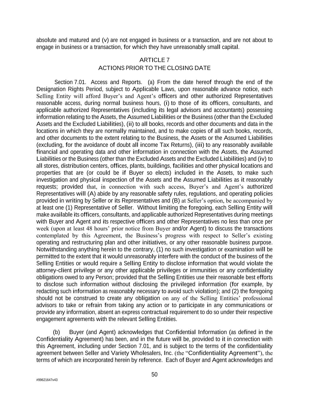50 #99621647v43 absolute and matured and (v) are not engaged in business or a transaction, and are not about to engage in business or a transaction, for which they have unreasonably small capital. ARTICLE 7 ACTIONS PRIOR TO THE CLOSING DATE Section 7.01. Access and Reports. (a) From the date hereof through the end of the Designation Rights Period, subject to Applicable Laws, upon reasonable advance notice, each Selling Entity will afford Buyer’s and Agent’s officers and other authorized Representatives reasonable access, during normal business hours, (i) to those of its officers, consultants, and applicable authorized Representatives (including its legal advisors and accountants) possessing information relating to the Assets, the Assumed Liabilities or the Business (other than the Excluded Assets and the Excluded Liabilities), (ii) to all books, records and other documents and data in the locations in which they are normally maintained, and to make copies of all such books, records, and other documents to the extent relating to the Business, the Assets or the Assumed Liabilities (excluding, for the avoidance of doubt all income Tax Returns), (iii) to any reasonably available financial and operating data and other information in connection with the Assets, the Assumed Liabilities or the Business (other than the Excluded Assets and the Excluded Liabilities) and (iv) to all stores, distribution centers, offices, plants, buildings, facilities and other physical locations and properties that are (or could be if Buyer so elects) included in the Assets, to make such investigation and physical inspection of the Assets and the Assumed Liabilities as it reasonably requests; provided that, in connection with such access, Buyer’s and Agent’s authorized Representatives will (A) abide by any reasonable safety rules, regulations, and operating policies provided in writing by Seller or its Representatives and (B) at Seller’s option, be accompanied by at least one (1) Representative of Seller. Without limiting the foregoing, each Selling Entity will make available its officers, consultants, and applicable authorized Representatives during meetings with Buyer and Agent and its respective officers and other Representatives no less than once per week (upon at least 48 hours’ prior notice from Buyer and/or Agent) to discuss the transactions contemplated by this Agreement, the Business’s progress with respect to Seller’s existing operating and restructuring plan and other initiatives, or any other reasonable business purpose. Notwithstanding anything herein to the contrary, (1) no such investigation or examination will be permitted to the extent that it would unreasonably interfere with the conduct of the business of the Selling Entities or would require a Selling Entity to disclose information that would violate the attorney-client privilege or any other applicable privileges or immunities or any confidentiality obligations owed to any Person; provided that the Selling Entities use their reasonable best efforts to disclose such information without disclosing the privileged information (for example, by redacting such information as reasonably necessary to avoid such violation); and (2) the foregoing should not be construed to create any obligation on any of the Selling Entities’ professional advisors to take or refrain from taking any action or to participate in any communications or provide any information, absent an express contractual requirement to do so under their respective engagement agreements with the relevant Selling Entities. (b) Buyer (and Agent) acknowledges that Confidential Information (as defined in the Confidentiality Agreement) has been, and in the future will be, provided to it in connection with this Agreement, including under Section 7.01, and is subject to the terms of the confidentiality agreement between Seller and Variety Wholesalers, Inc. (the “Confidentiality Agreement”), the terms of which are incorporated herein by reference. Each of Buyer and Agent acknowledges and