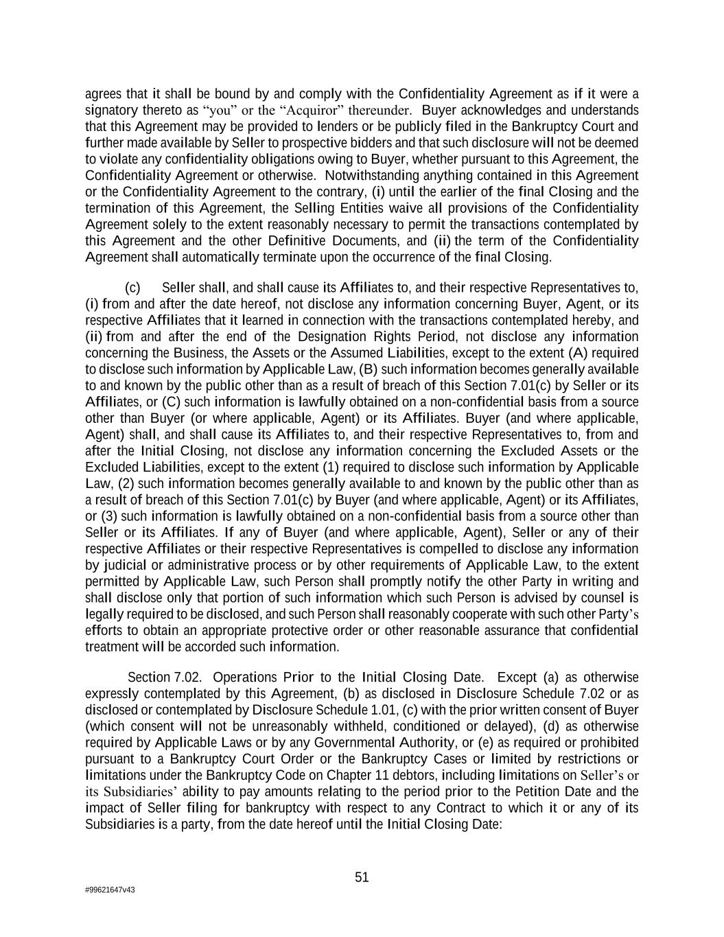 51 #99621647v43 agrees that it shall be bound by and comply with the Confidentiality Agreement as if it were a signatory thereto as “you” or the “Acquiror” thereunder. Buyer acknowledges and understands that this Agreement may be provided to lenders or be publicly filed in the Bankruptcy Court and further made available by Seller to prospective bidders and that such disclosure will not be deemed to violate any confidentiality obligations owing to Buyer, whether pursuant to this Agreement, the Confidentiality Agreement or otherwise. Notwithstanding anything contained in this Agreement or the Confidentiality Agreement to the contrary, (i) until the earlier of the final Closing and the termination of this Agreement, the Selling Entities waive all provisions of the Confidentiality Agreement solely to the extent reasonably necessary to permit the transactions contemplated by this Agreement and the other Definitive Documents, and (ii) the term of the Confidentiality Agreement shall automatically terminate upon the occurrence of the final Closing. (c) Seller shall, and shall cause its Affiliates to, and their respective Representatives to, (i) from and after the date hereof, not disclose any information concerning Buyer, Agent, or its respective Affiliates that it learned in connection with the transactions contemplated hereby, and (ii) from and after the end of the Designation Rights Period, not disclose any information concerning the Business, the Assets or the Assumed Liabilities, except to the extent (A) required to disclose such information by Applicable Law, (B) such information becomes generally available to and known by the public other than as a result of breach of this Section 7.01(c) by Seller or its Affiliates, or (C) such information is lawfully obtained on a non-confidential basis from a source other than Buyer (or where applicable, Agent) or its Affiliates. Buyer (and where applicable, Agent) shall, and shall cause its Affiliates to, and their respective Representatives to, from and after the Initial Closing, not disclose any information concerning the Excluded Assets or the Excluded Liabilities, except to the extent (1) required to disclose such information by Applicable Law, (2) such information becomes generally available to and known by the public other than as a result of breach of this Section 7.01(c) by Buyer (and where applicable, Agent) or its Affiliates, or (3) such information is lawfully obtained on a non-confidential basis from a source other than Seller or its Affiliates. If any of Buyer (and where applicable, Agent), Seller or any of their respective Affiliates or their respective Representatives is compelled to disclose any information by judicial or administrative process or by other requirements of Applicable Law, to the extent permitted by Applicable Law, such Person shall promptly notify the other Party in writing and shall disclose only that portion of such information which such Person is advised by counsel is legally required to be disclosed, and such Person shall reasonably cooperate with such other Party’s efforts to obtain an appropriate protective order or other reasonable assurance that confidential treatment will be accorded such information. Section 7.02. Operations Prior to the Initial Closing Date. Except (a) as otherwise expressly contemplated by this Agreement, (b) as disclosed in Disclosure Schedule 7.02 or as disclosed or contemplated by Disclosure Schedule 1.01, (c) with the prior written consent of Buyer (which consent will not be unreasonably withheld, conditioned or delayed), (d) as otherwise required by Applicable Laws or by any Governmental Authority, or (e) as required or prohibited pursuant to a Bankruptcy Court Order or the Bankruptcy Cases or limited by restrictions or limitations under the Bankruptcy Code on Chapter 11 debtors, including limitations on Seller’s or its Subsidiaries’ ability to pay amounts relating to the period prior to the Petition Date and the impact of Seller filing for bankruptcy with respect to any Contract to which it or any of its Subsidiaries is a party, from the date hereof until the Initial Closing Date: